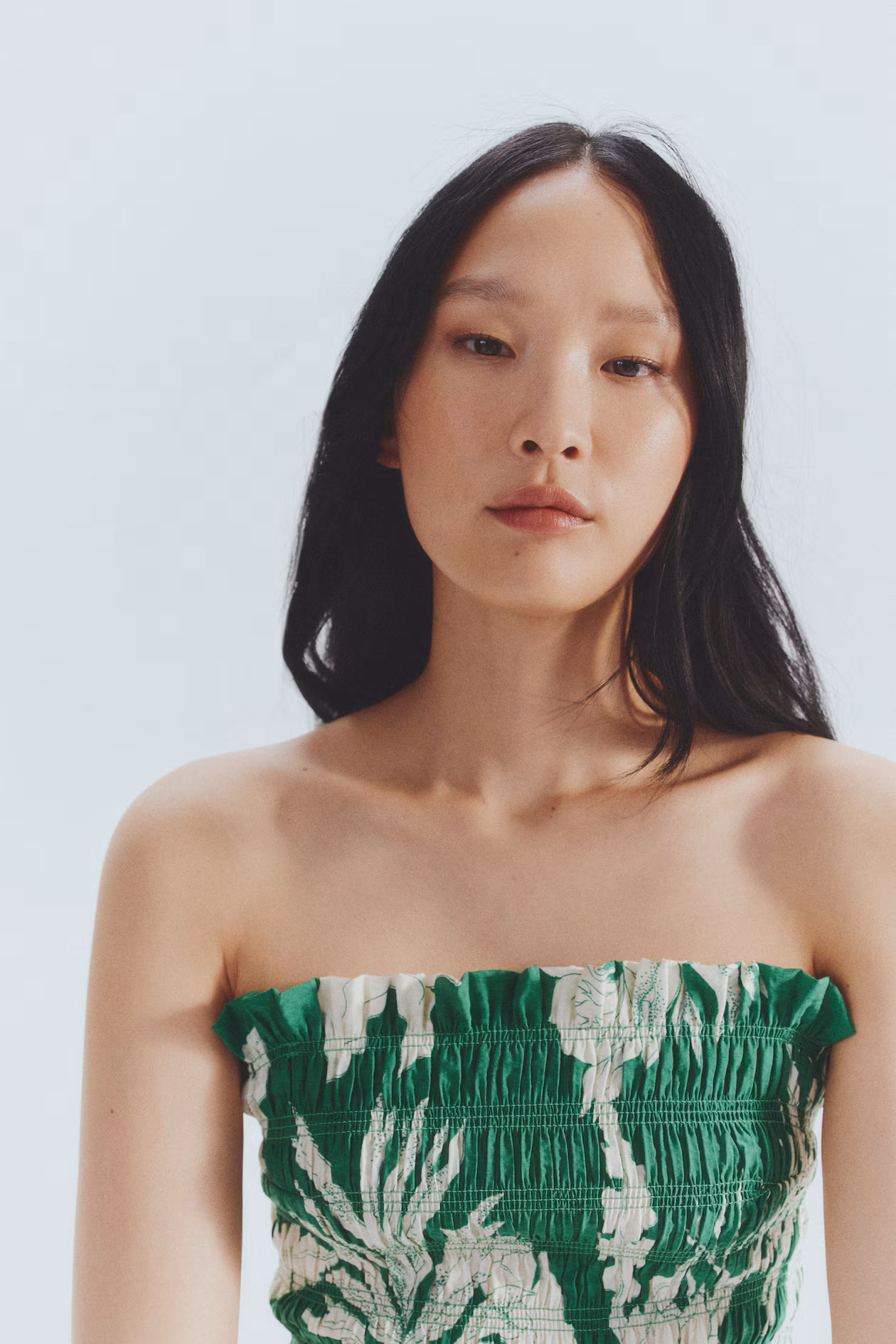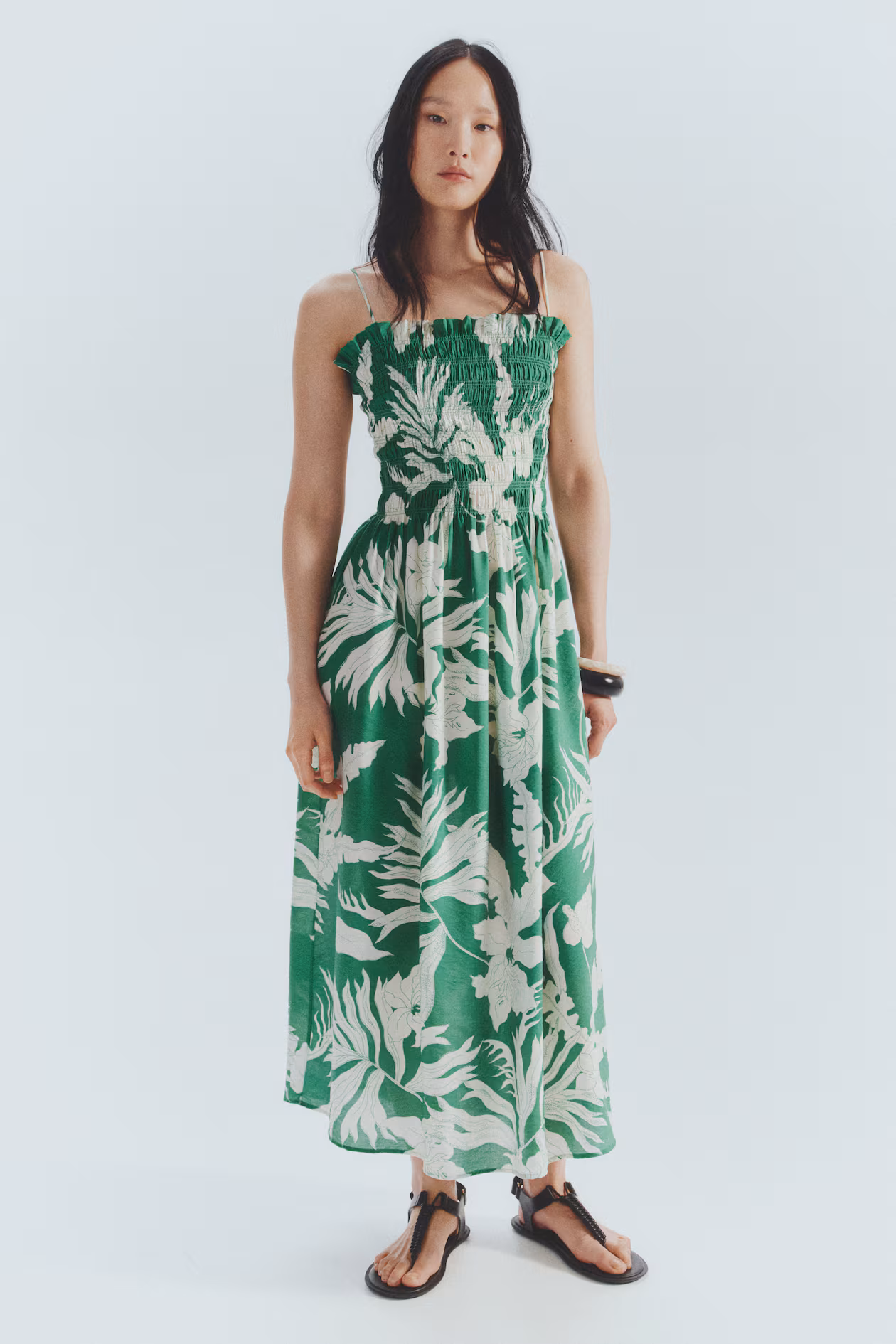 Calf-length dress in woven fabric. Detachable, adjustable extra-narrow shoulder straps, smocked bodice with a straight, ruffle-trimmed neckline, and a gathered seam at waist. Gently flared skirt. Unlined.