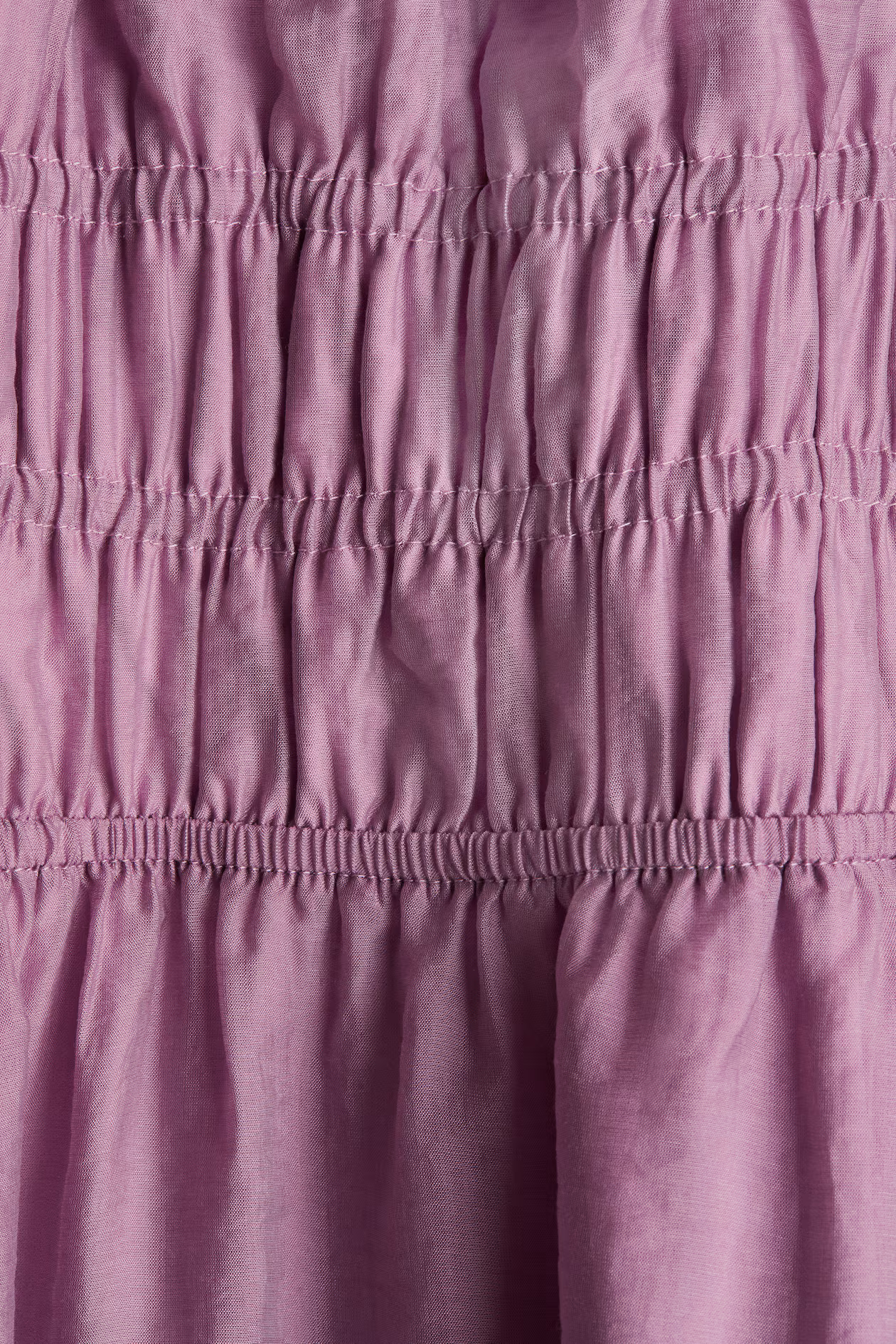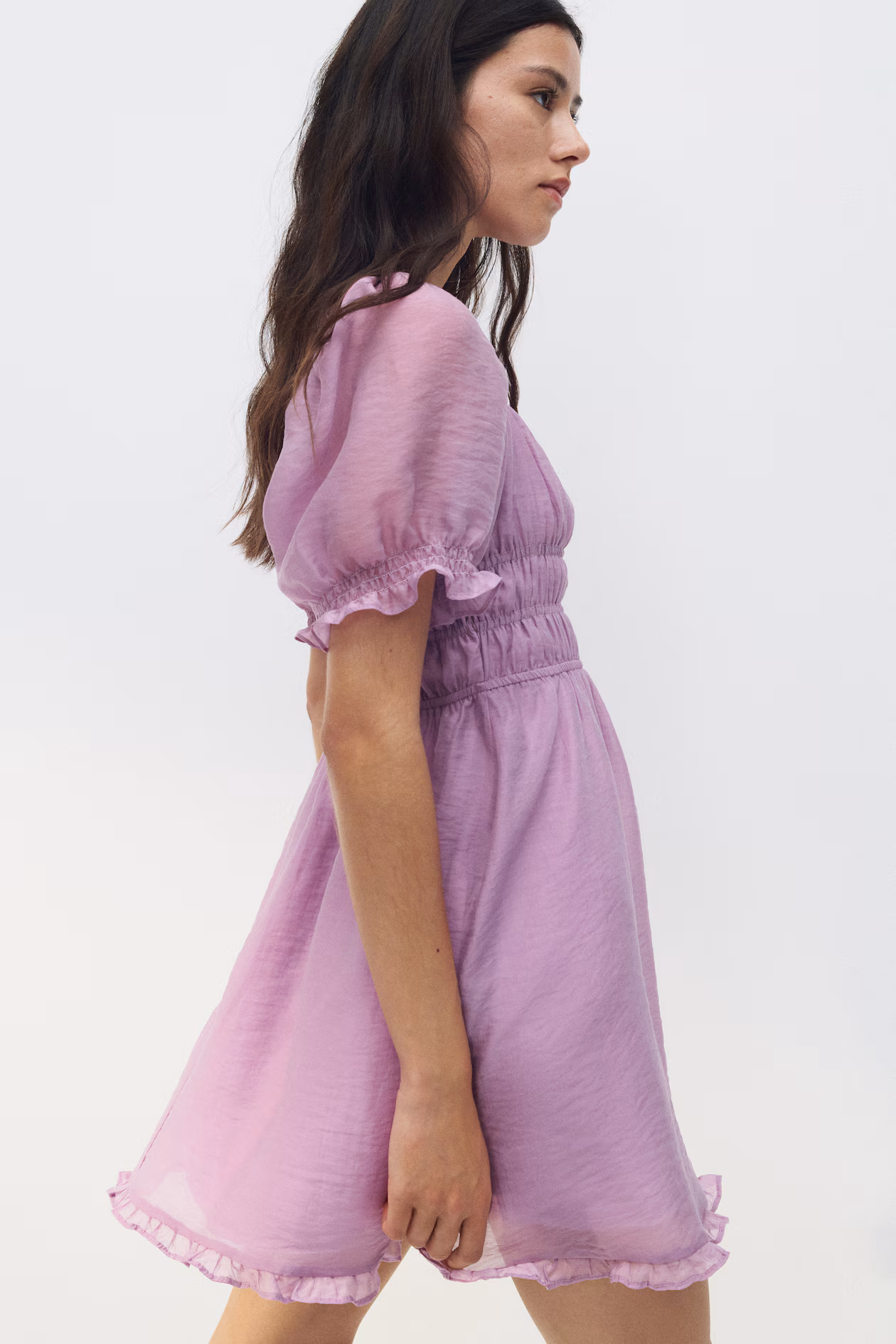 Short dress in woven fabric with a fitted bodice and gently flared skirt. Square neckline with covered elastic at front and back, smocked elastic below bust, and short puff sleeves with smocked elastic at cuffs. Ruffle trim at front and back neckline, cuffs, and hem. Partly lined.