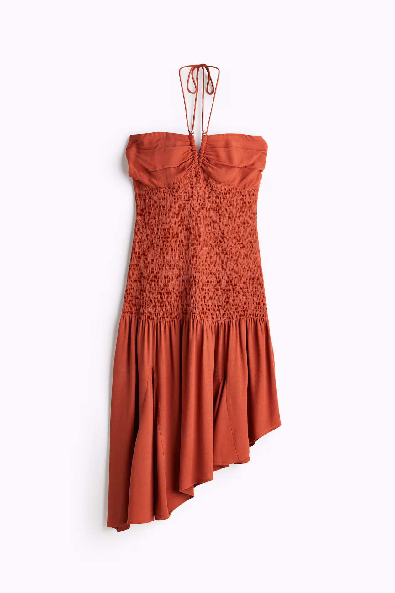 Fitted, knee-length dress in woven viscose crêpe. Narrow halterneck ties, sweetheart neckline with silicone trim inside upper edge, and V-shaped opening at center bust with gathers. Smocked torso, flared skirt with godet pleats, and an asymmetric hem. Unlined.