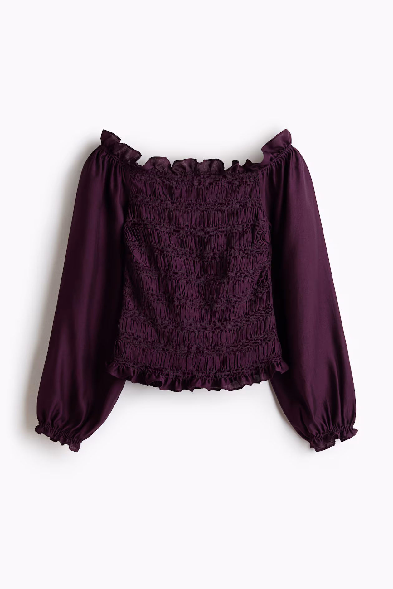 Off-the-shoulder blouse in a woven viscose blend with a fitted, smocked bodice. Long, voluminous sleeves with elasticized cuffs. Ruffle trim at upper edge, at cuffs, and at hem.