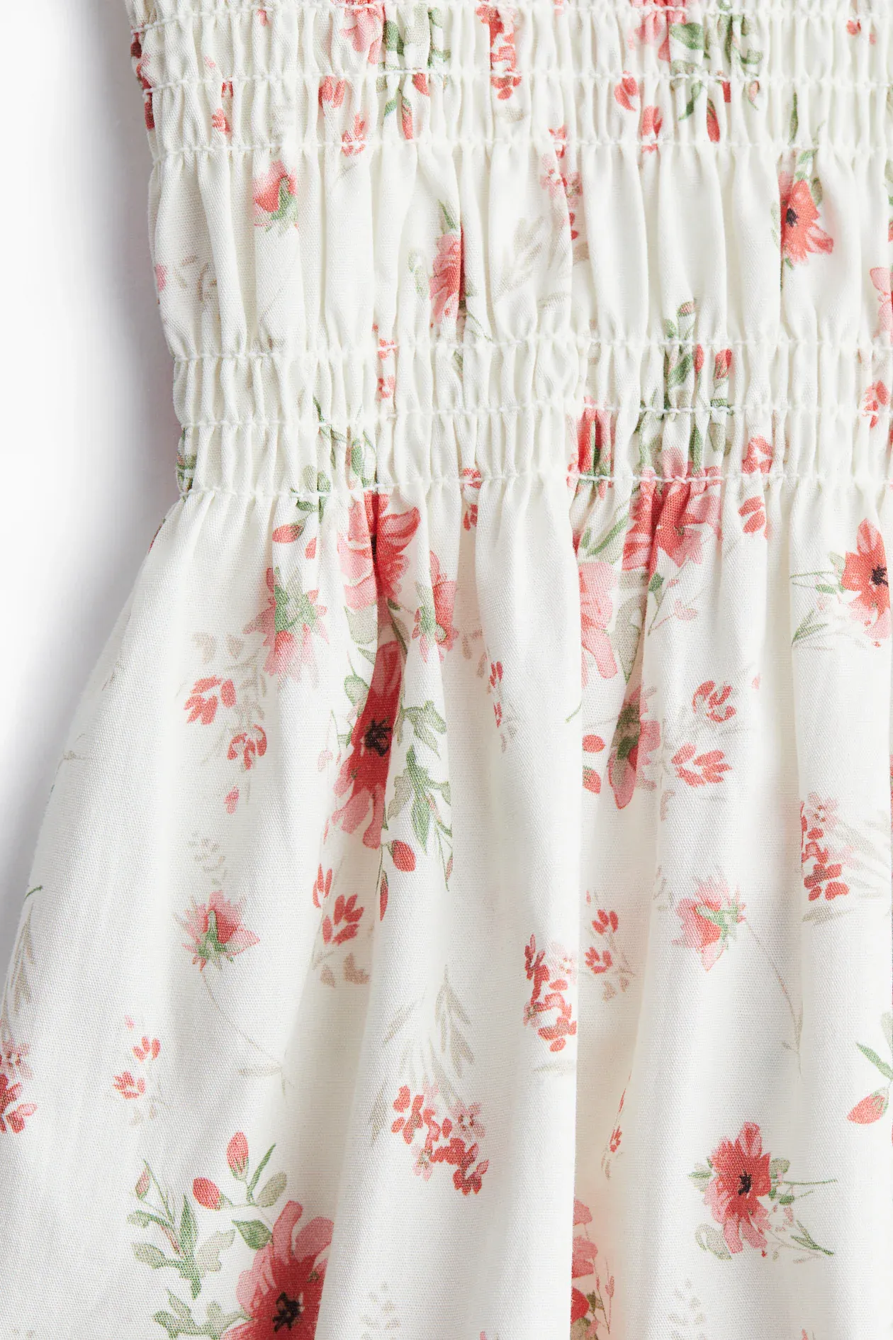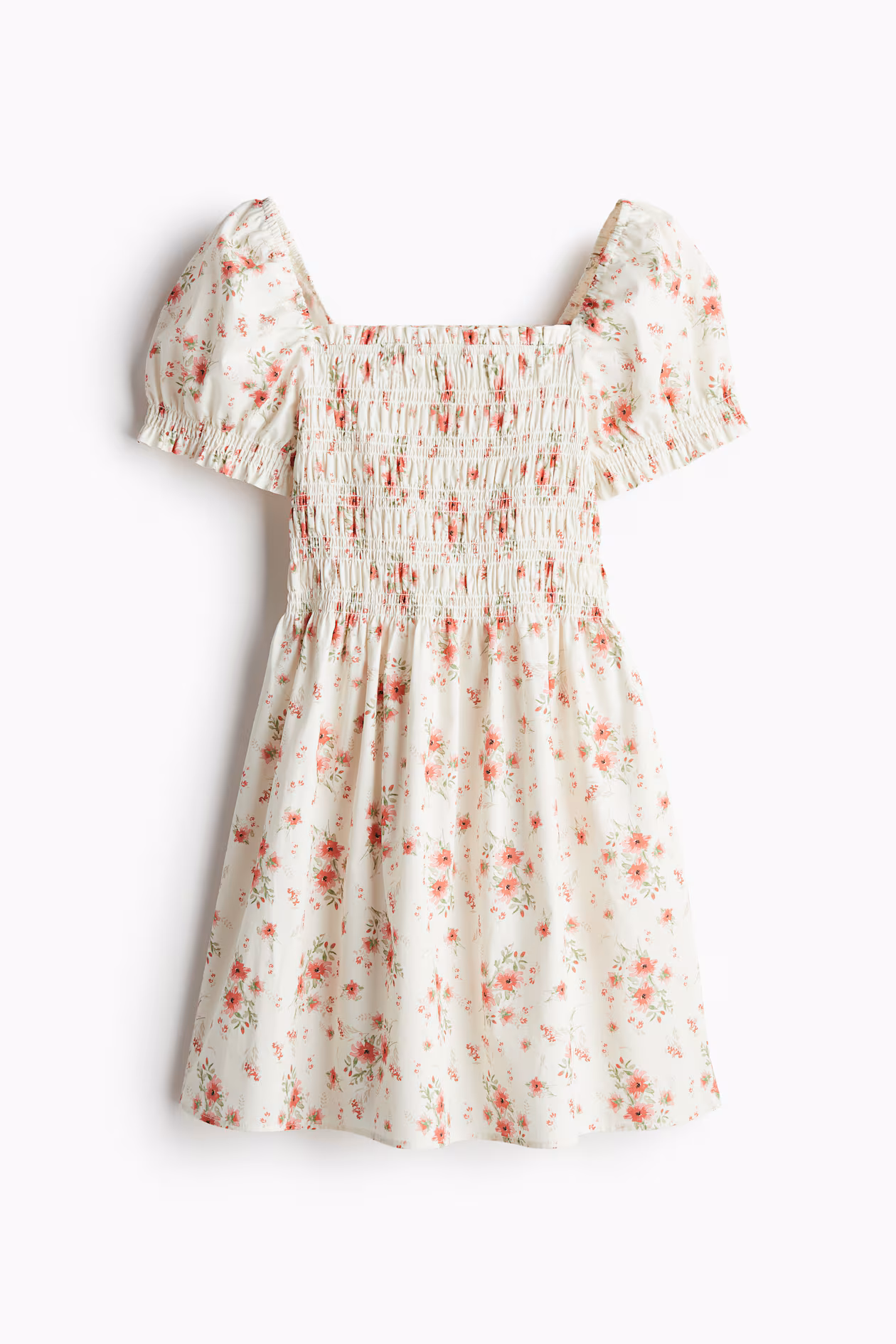 Short dress in crisp cotton poplin. Fitted, smocked bodice with a square, ruffle-trimmed neckline. Narrow elastic at shoulders and short puff sleeves with smocked elastic and ruffle trim at cuffs. Flared skirt. Unlined.