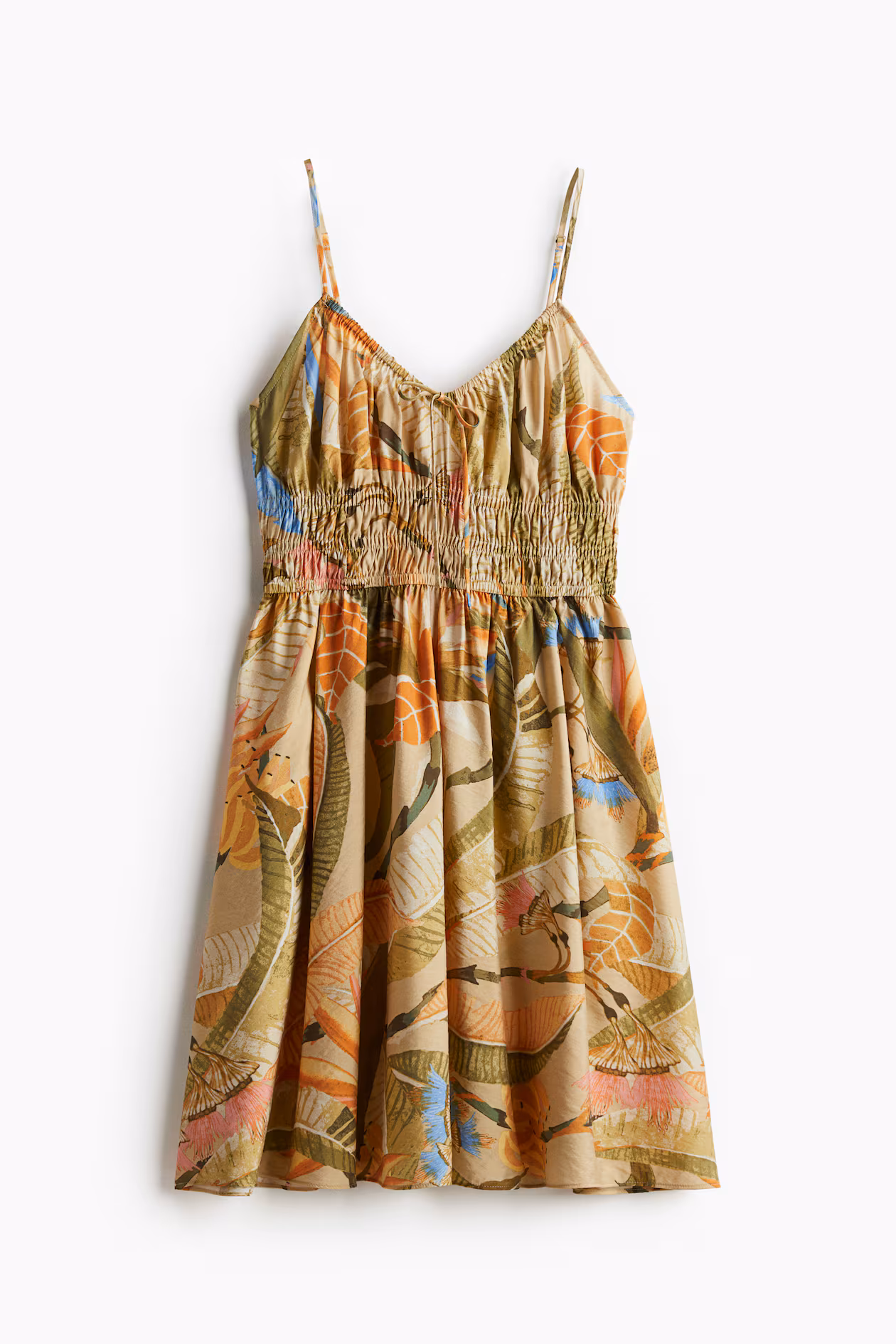 Short dress in woven fabric. Narrow, adjustable shoulder straps, V-neck, and extra-narrow ties at center bust. Covered elastic at upper front and at back, smocked elastic at waist, and a gently flared skirt. Unlined.