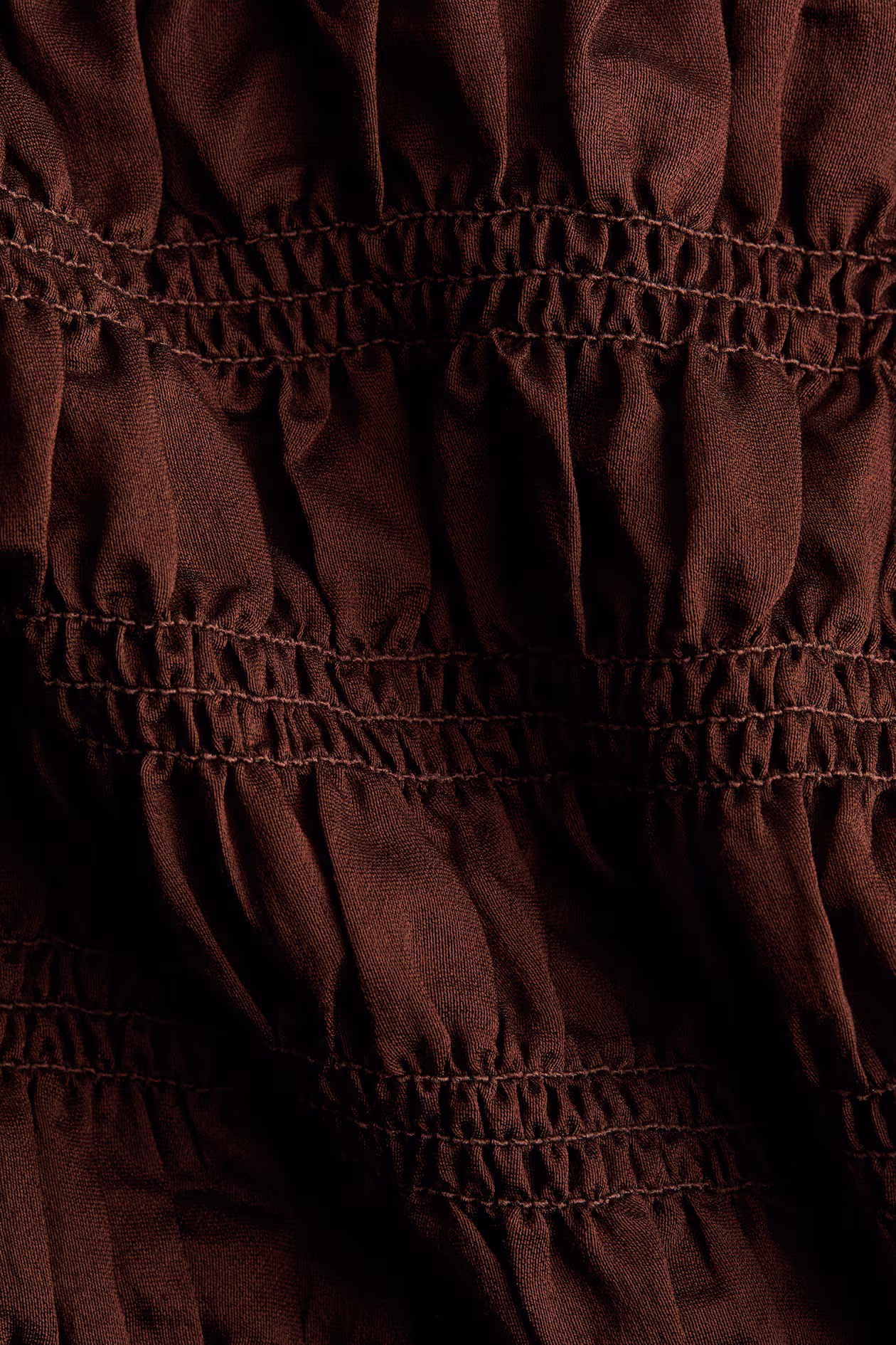 Short, fitted top in a smocked, viscose-blend weave with frill trims. Features a boat neckline and long sleeves.