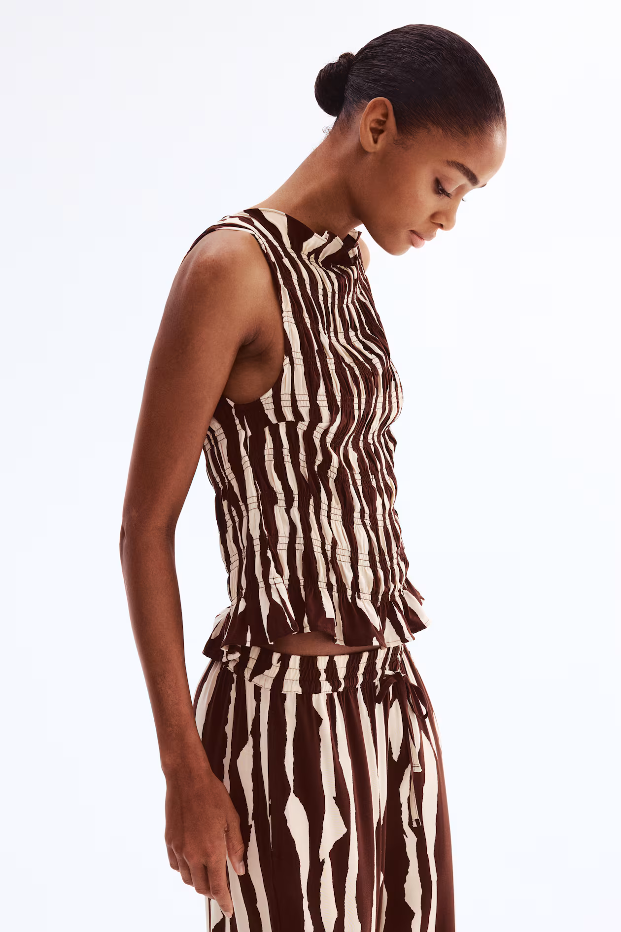 Fitted, sleeveless top in smocked woven viscose. Ruffle-trimmed boat neck and ruffle trim at hem.