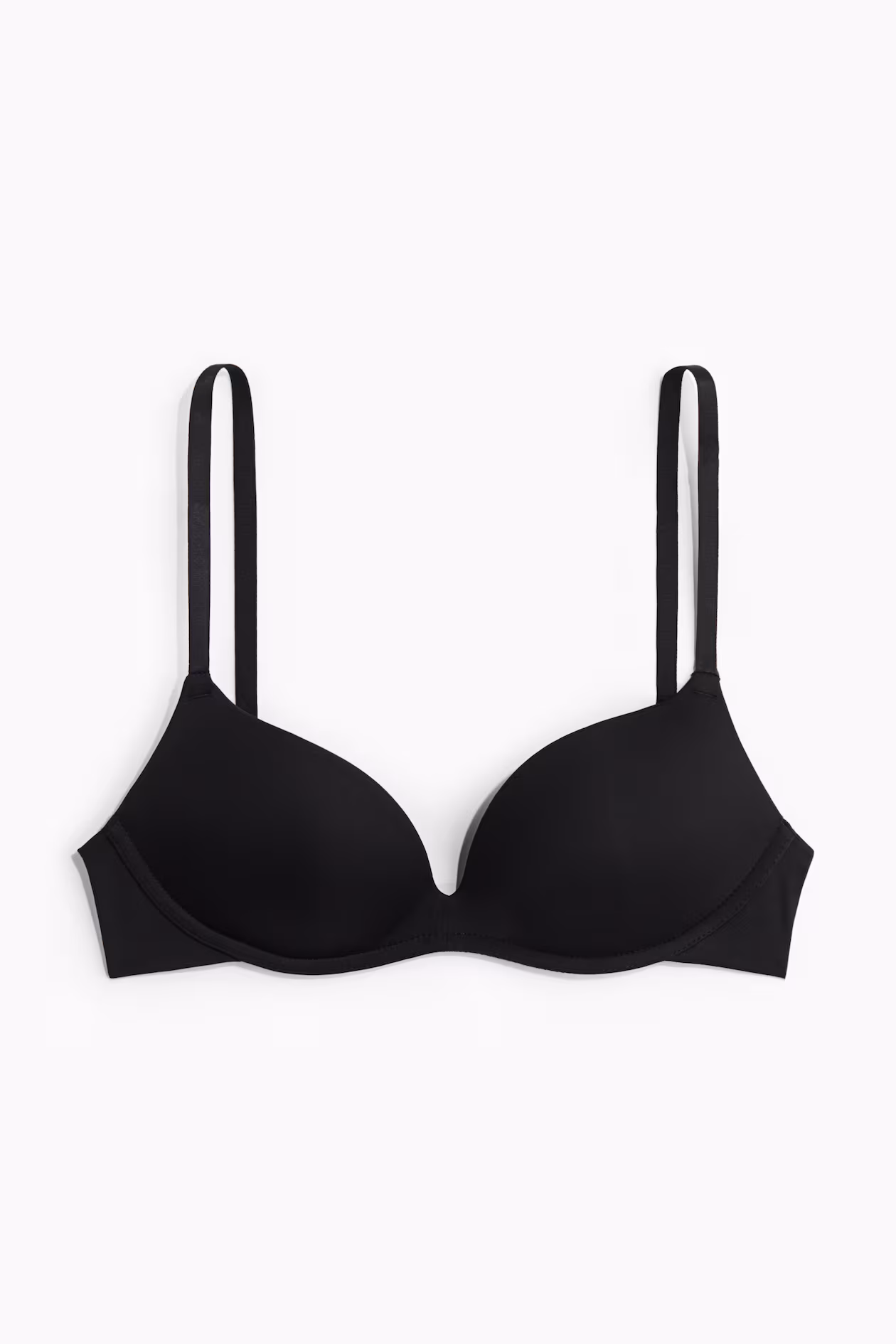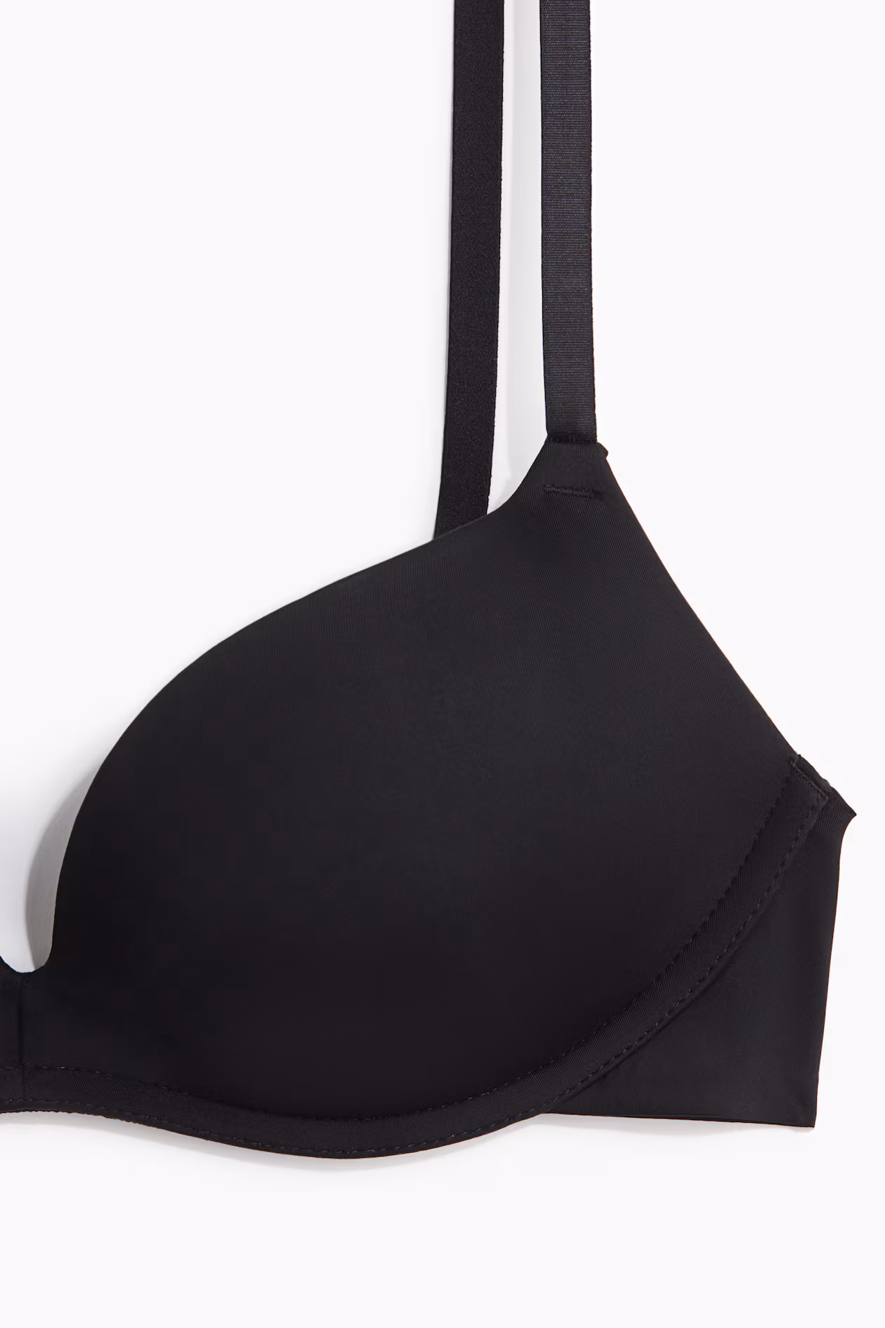 Soft-cup bra in microfiber. Adjustable shoulder straps, padded cups to maximize bust and cleavage, and hook-and-eye fasteners at back.