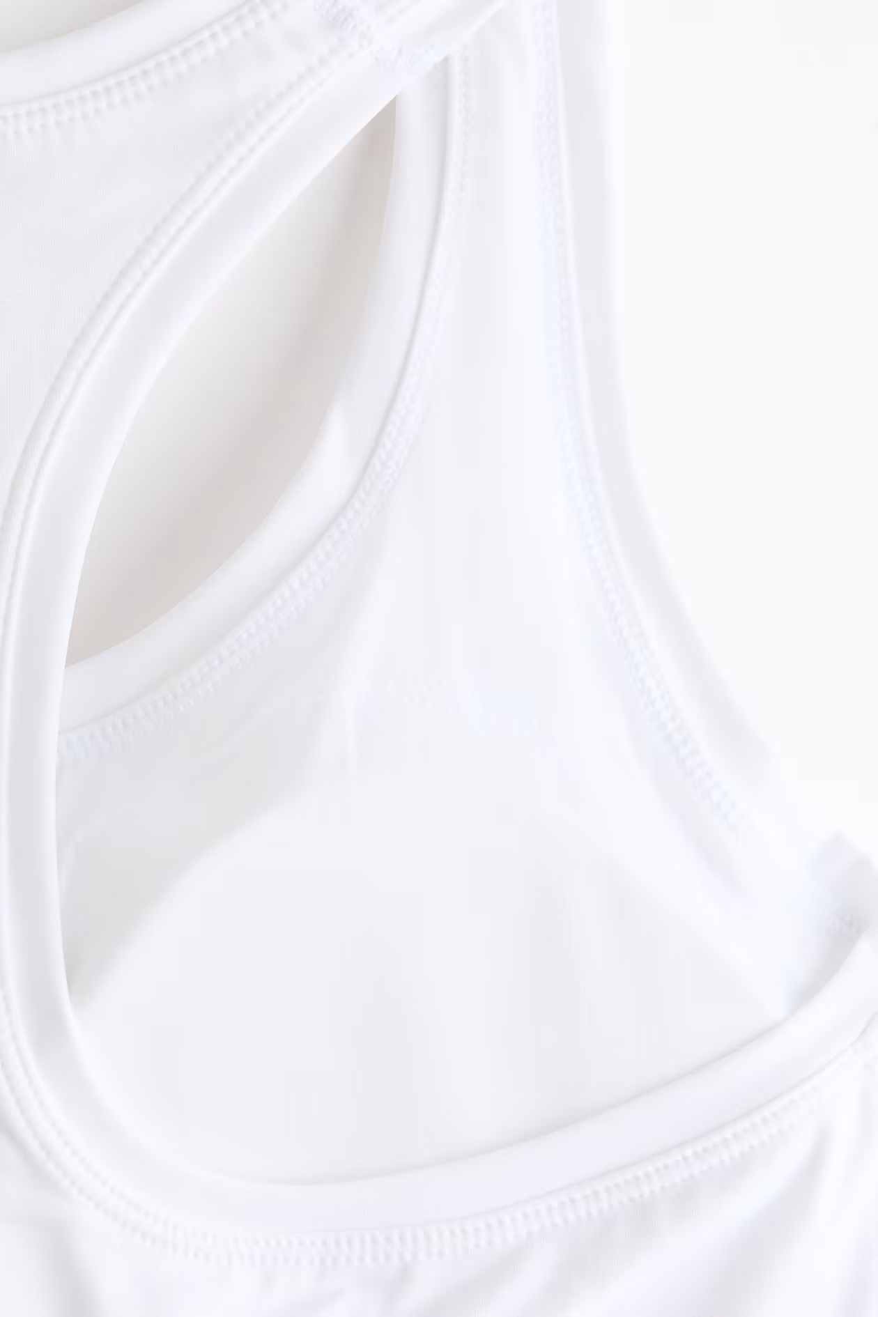 Racerback sports bra in functional fabric made with Cool Handfeel DryMove™ that helps release excess heat, wick away moisture from skin, and keep you comfortably cool and dry while moving. Wide shoulder straps, round neckline, and lined cups with removable inserts for shaping and adjustable fit. Covered elastic at lower edge. Offered in sizes XS–XL with two different cup sizes for a more tailored fit. Sizes M–XL have an additional discreet seam for extra support.
