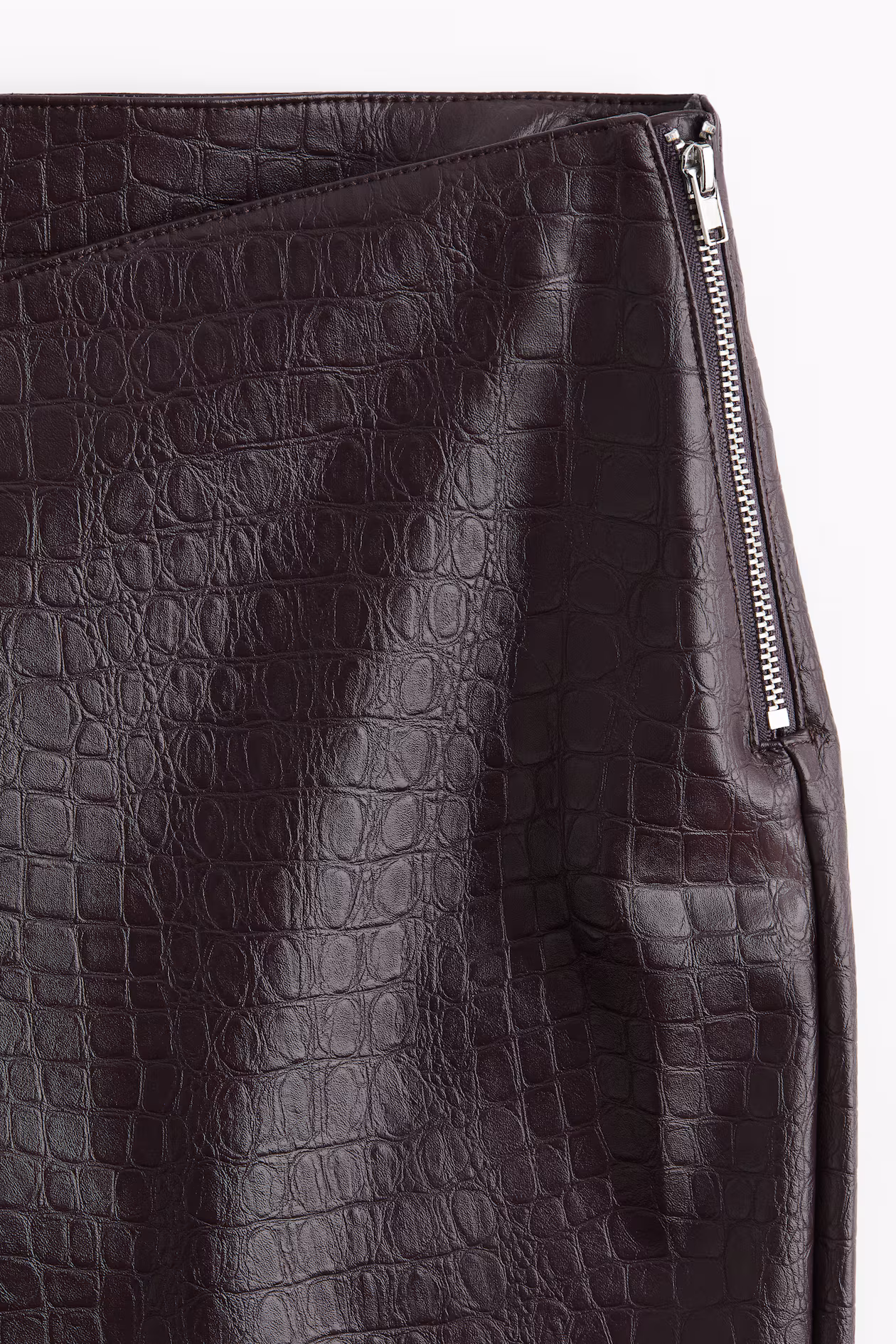 Pants in coated fabric. Visible zipper at one side with concealed button. Straight legs.