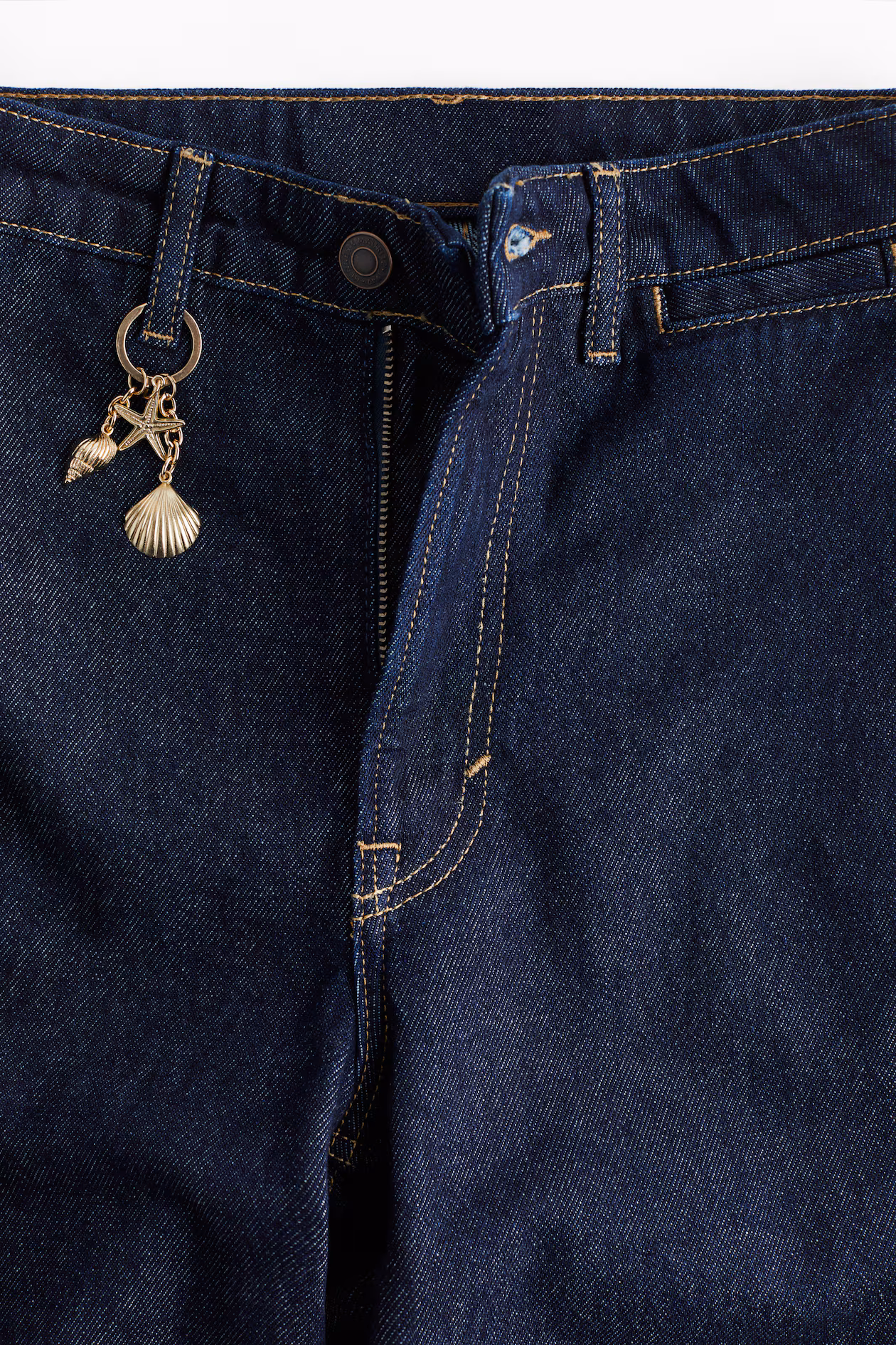 Jeans in rigid cotton denim that feels firm at first, softening and relaxing with wear. Regular fit from waist to hip and a looser-fit, straight cut from thigh to hem. High waist, zip fly with button, and a detachable metal detail with charms. Coin pocket at front, open back pockets, and straight, longer legs, designed to fall over foot with a stacking effect. From simple to statement-making, this shape always flatters.