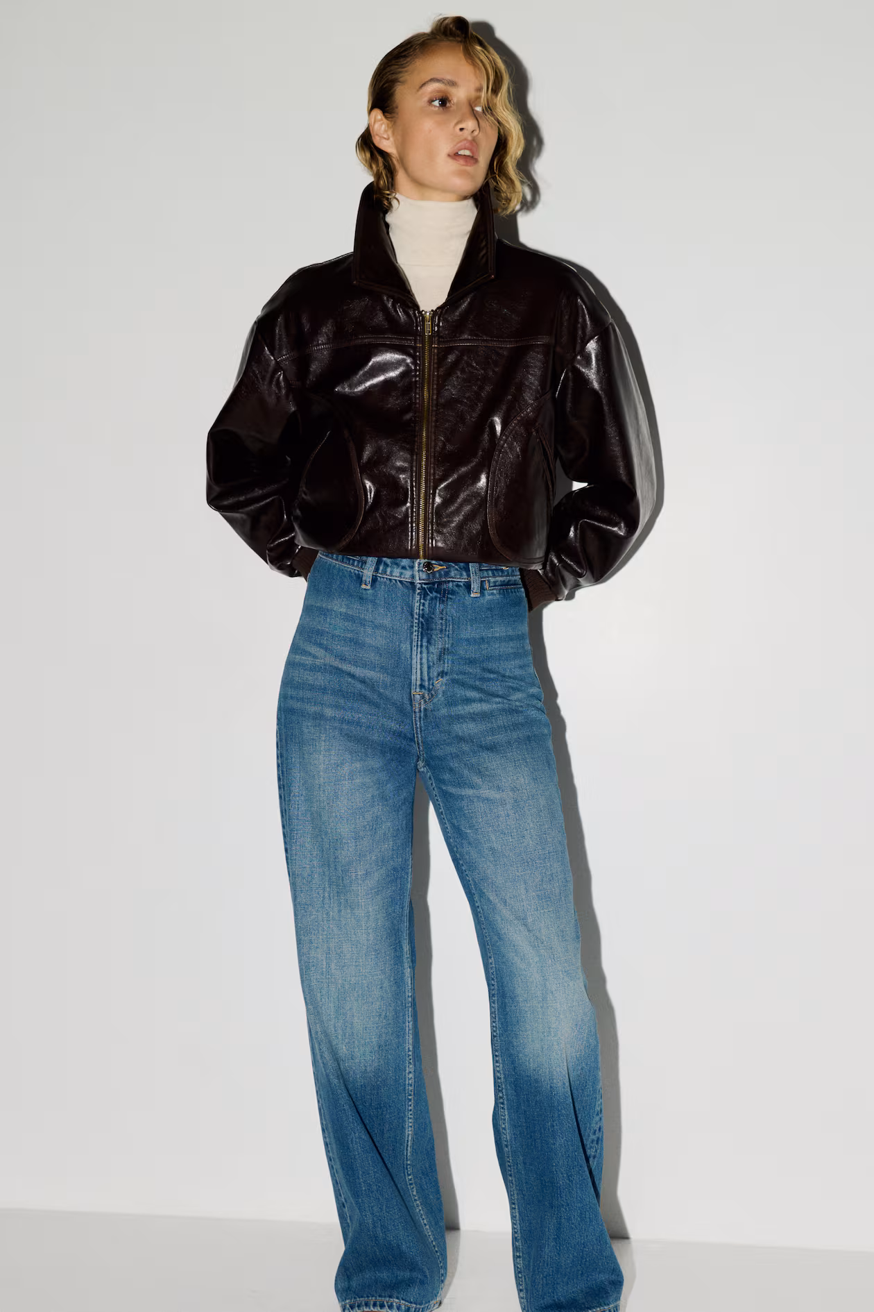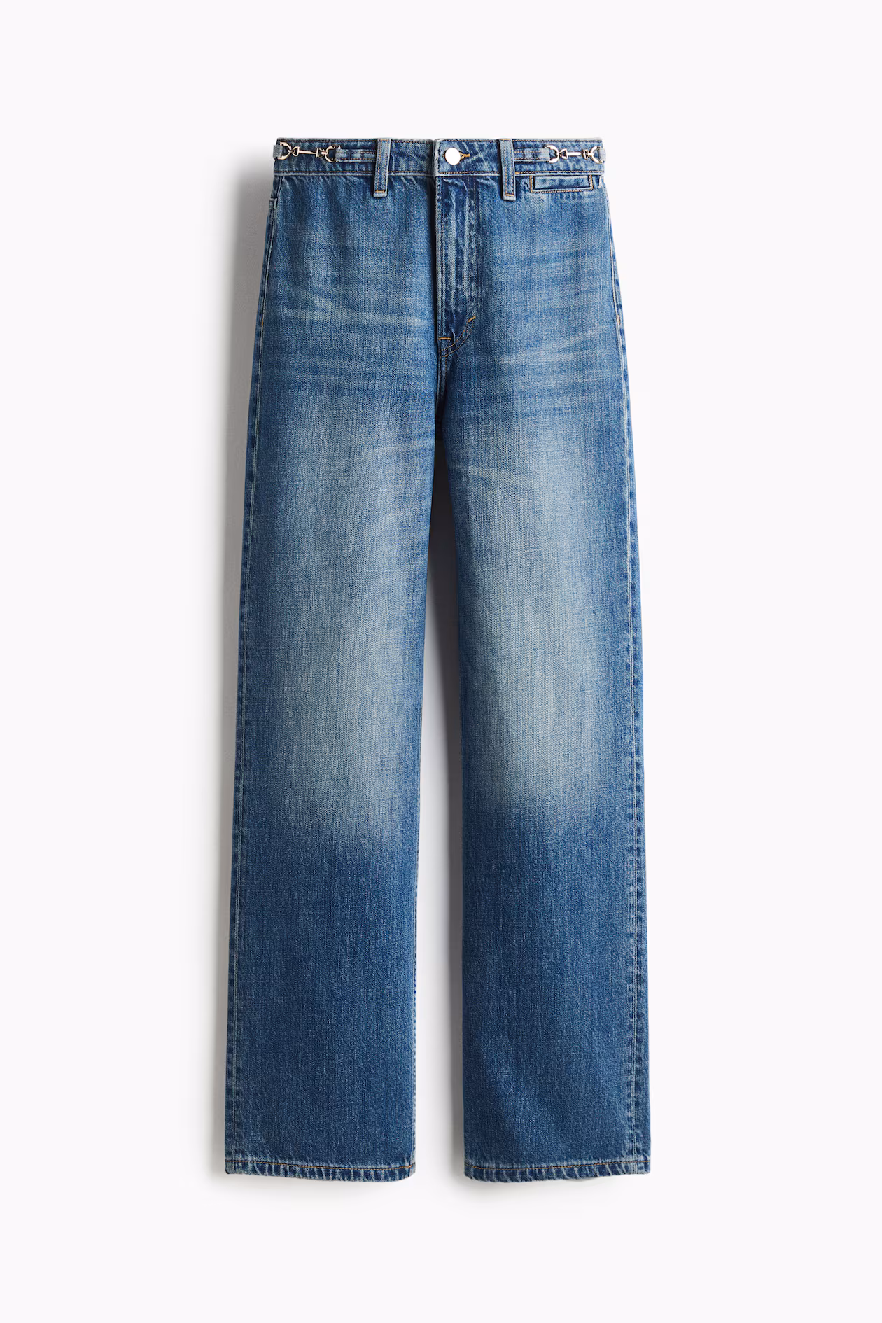 Jeans in rigid cotton denim that feels firm at first, softening and relaxing with wear. Regular fit from waist to hip and a straight, looser fit from thigh to hem. High waist and zip fly with button. Coin pocket at front, open back pockets, and straight, longer legs, designed to fall over foot with a stacking effect. From simple to statement-making, this shape always flatters.