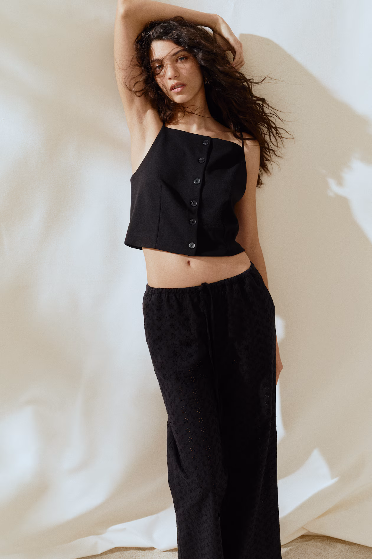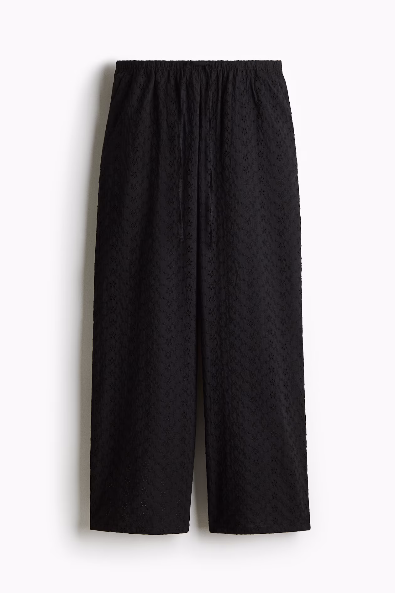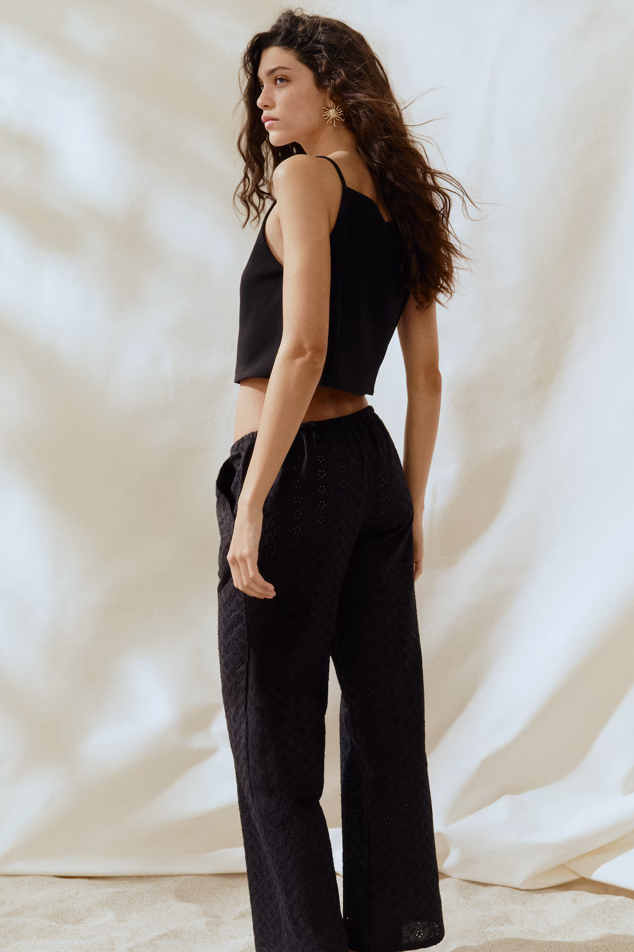 Pants in airy, woven cotton. Low waist, drawstring and covered elastic at waistband, and diagonal side pockets. Straight legs.