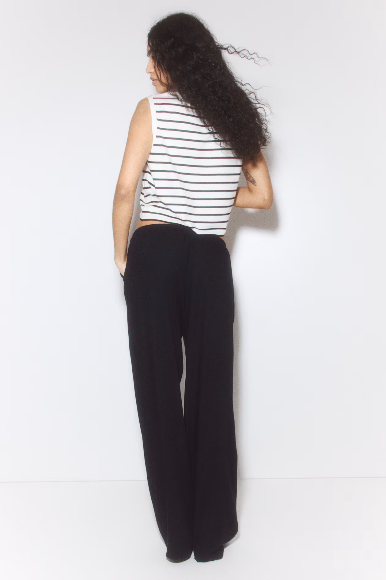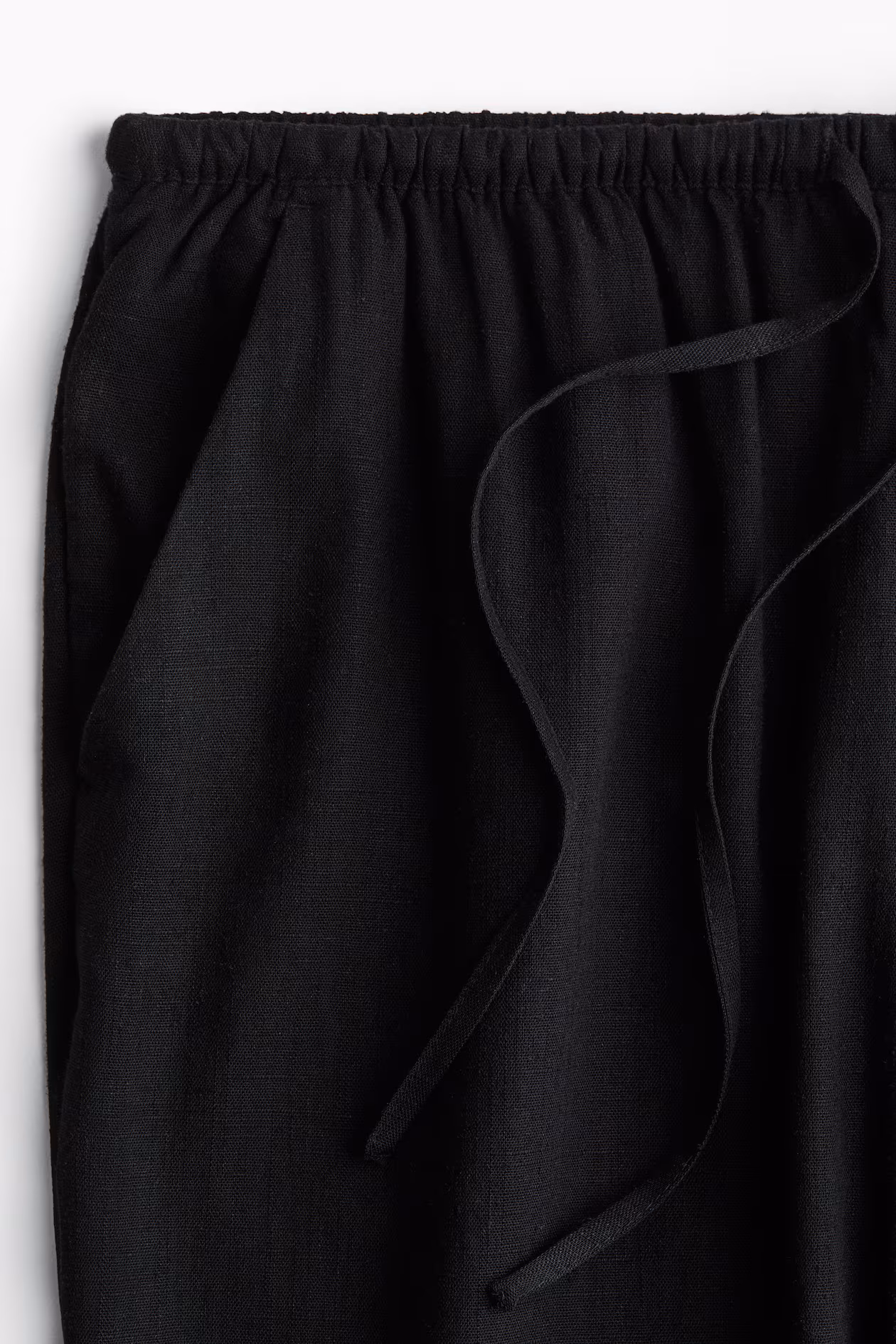 Pants in airy, woven fabric with linen content. Low waist, drawstring and covered elastic at waistband, and diagonal side pockets. Straight legs.