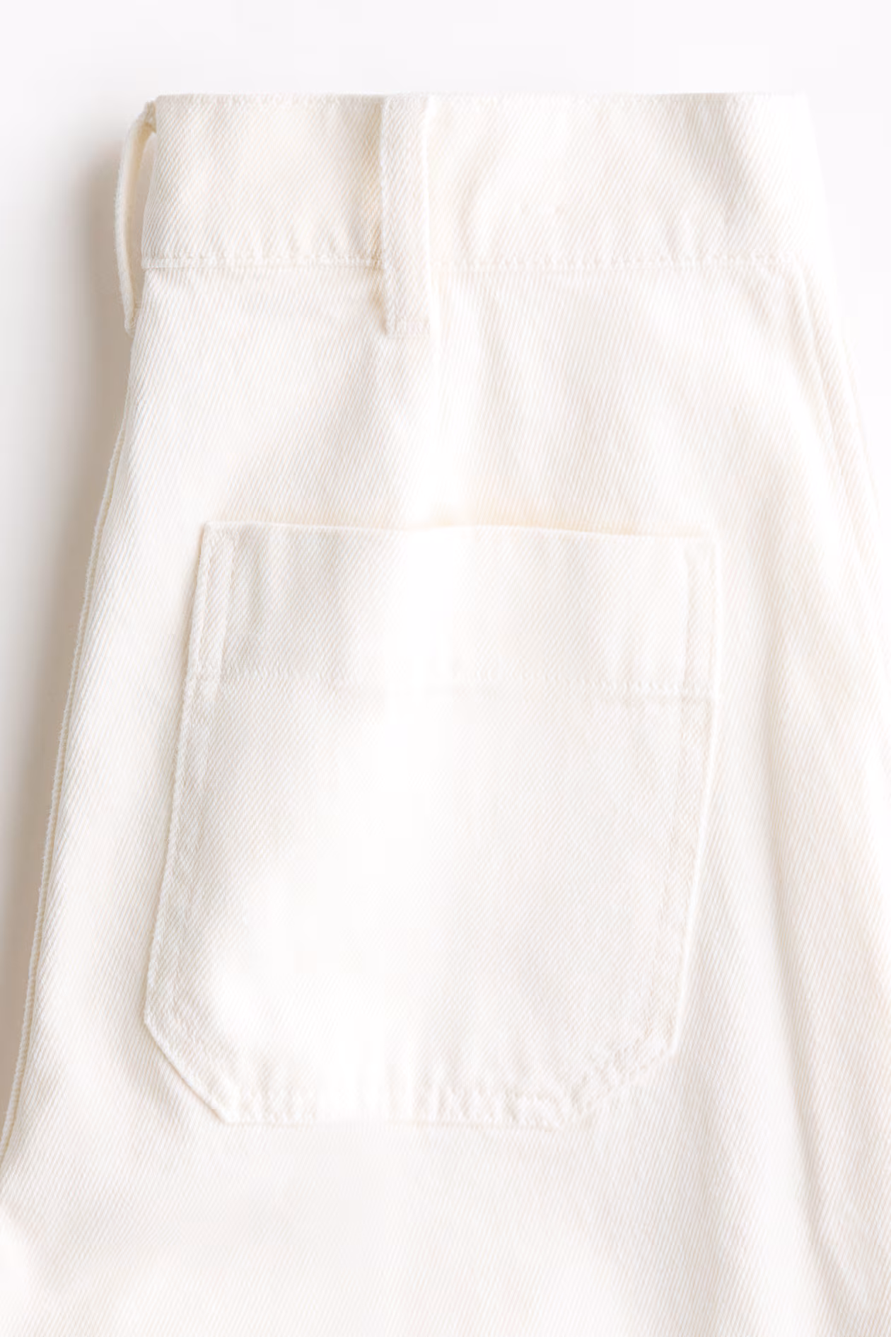 Jeans in rigid cotton denim that feels firm at first, softening and relaxing with wear. Regular fit from waist to hip and a looser, straight cut from thigh to hem. High waist, zip fly with button, and a belt with a napped, textured finish and a square metal buckle. Patch front pockets, patch back pockets, and creases at front and back. Straight, regular-length legs, designed to fall at top of foot with little or no stacking. Effortlessly flattering no matter how they're styled.