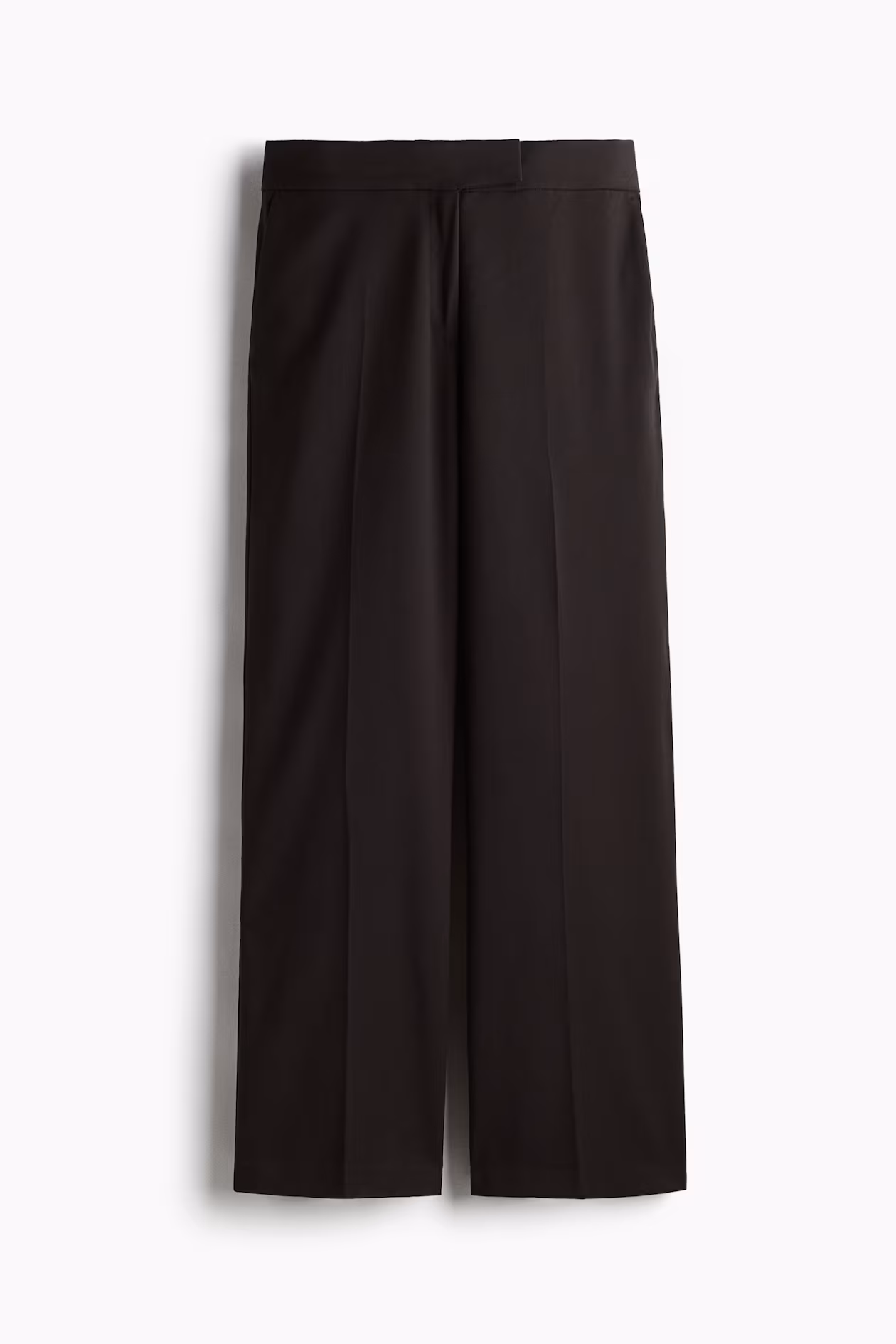 Pants in woven fabric with creases at front and back. Extended waistband tab with concealed hook-and-bar fastening, and zip fly. Diagonal side pockets, mock welt back pockets, and straight legs.