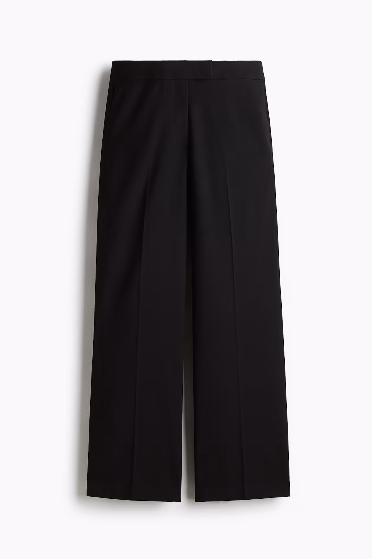 Pants in woven fabric with creases at front and back. Extended waistband tab with concealed hook-and-bar fastening, and zip fly. Diagonal side pockets, mock welt back pockets, and straight legs.