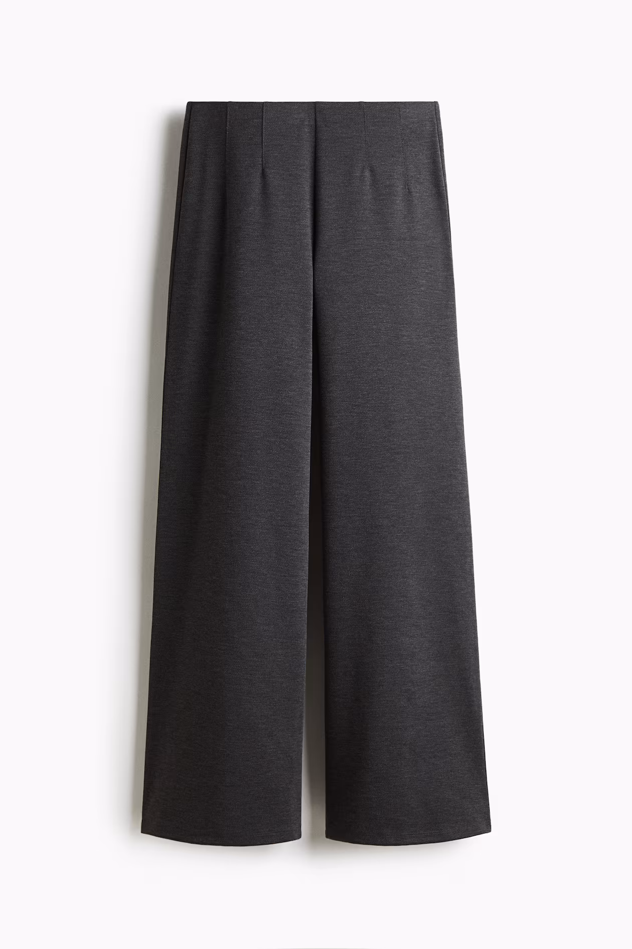Pants in thick jersey. High waist, concealed elastic at waistband, and darts at front and back. Straight legs with creases at front and back.