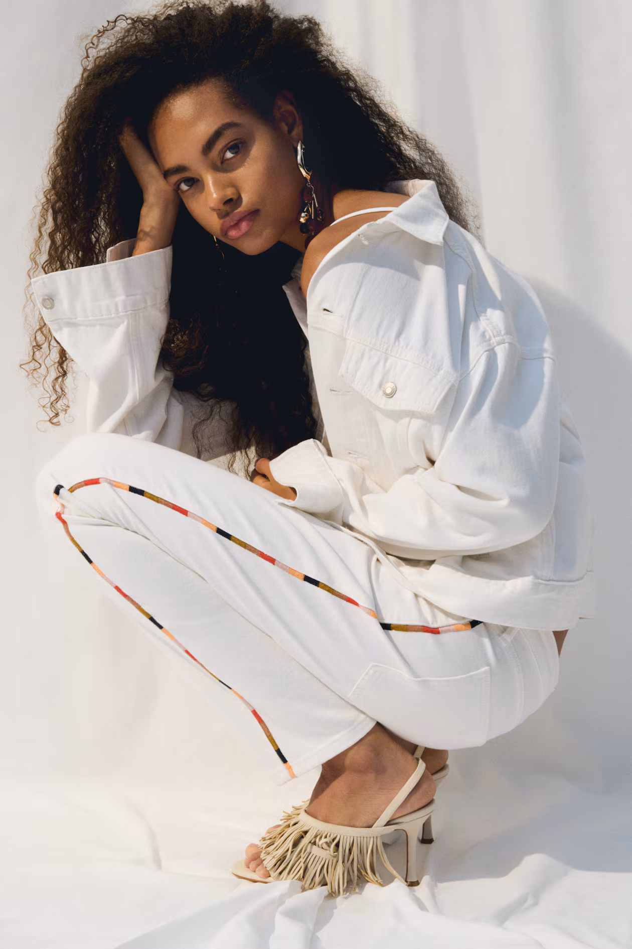 5-pocket jeans in cotton denim with gentle stretch for added comfort and embroidered side stripes. Regular, fitted waist and regular fit from hip to thigh. Zip fly with button. Straight, longer legs, designed to fall over foot with a stacking effect.