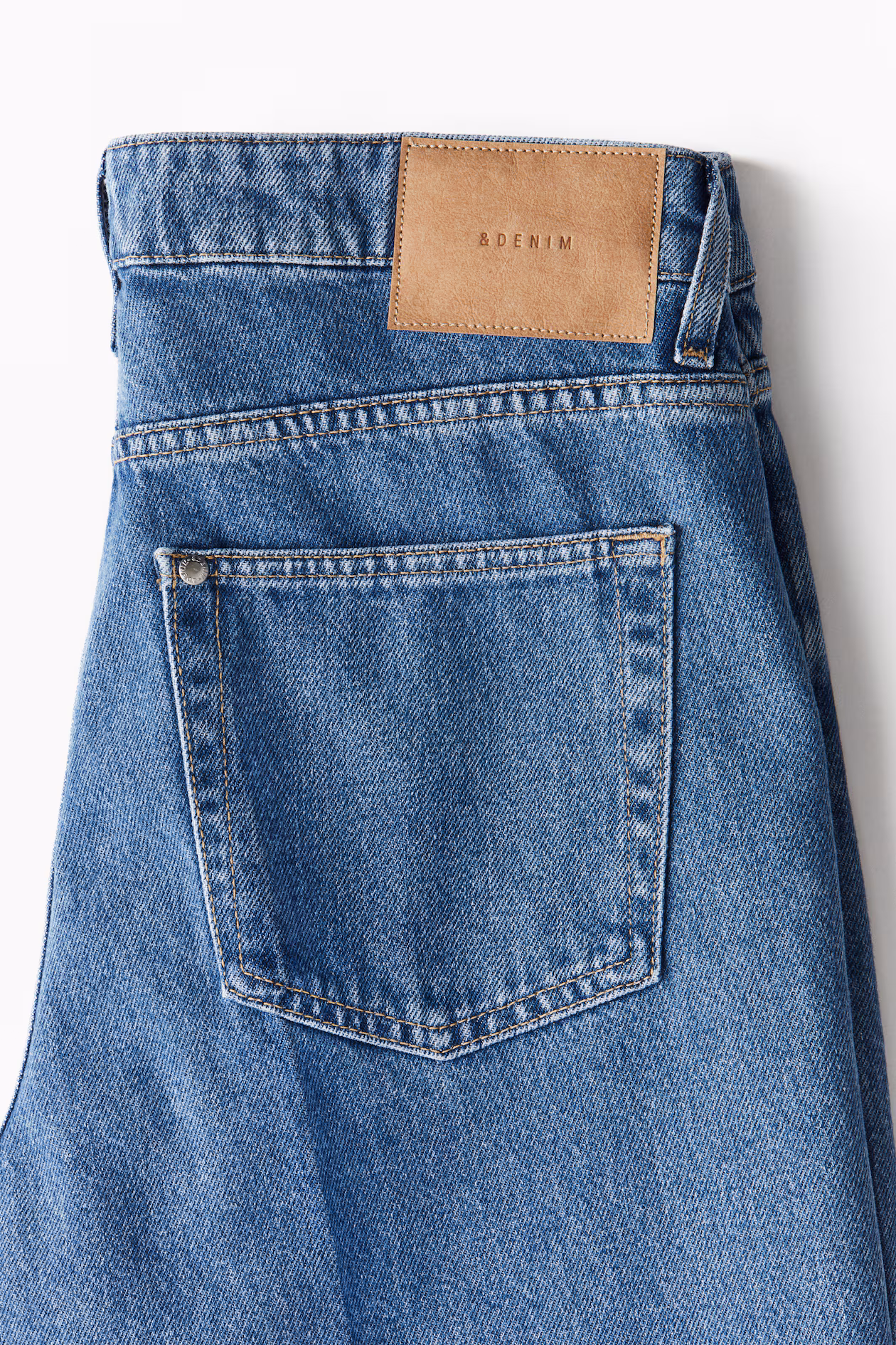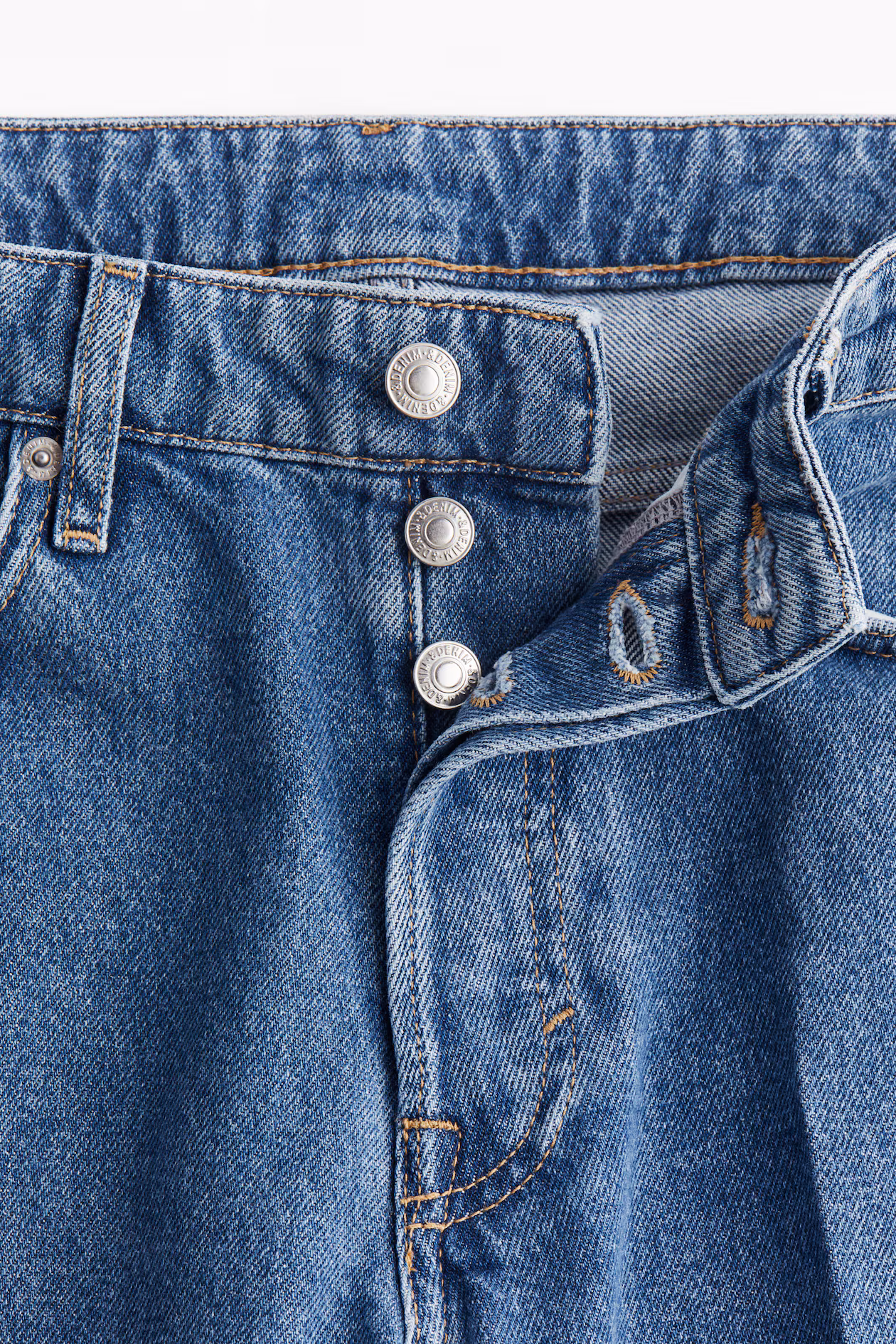 5-pocket jeans in rigid cotton denim that feels firm at first, softening and relaxing with wear. Loose fit from waist to hip and straight cut from thigh to hem. Regular waist and button fly. Straight, longer legs, designed to fall over foot with a stacking effect. Denim that goes from daytime to date night.