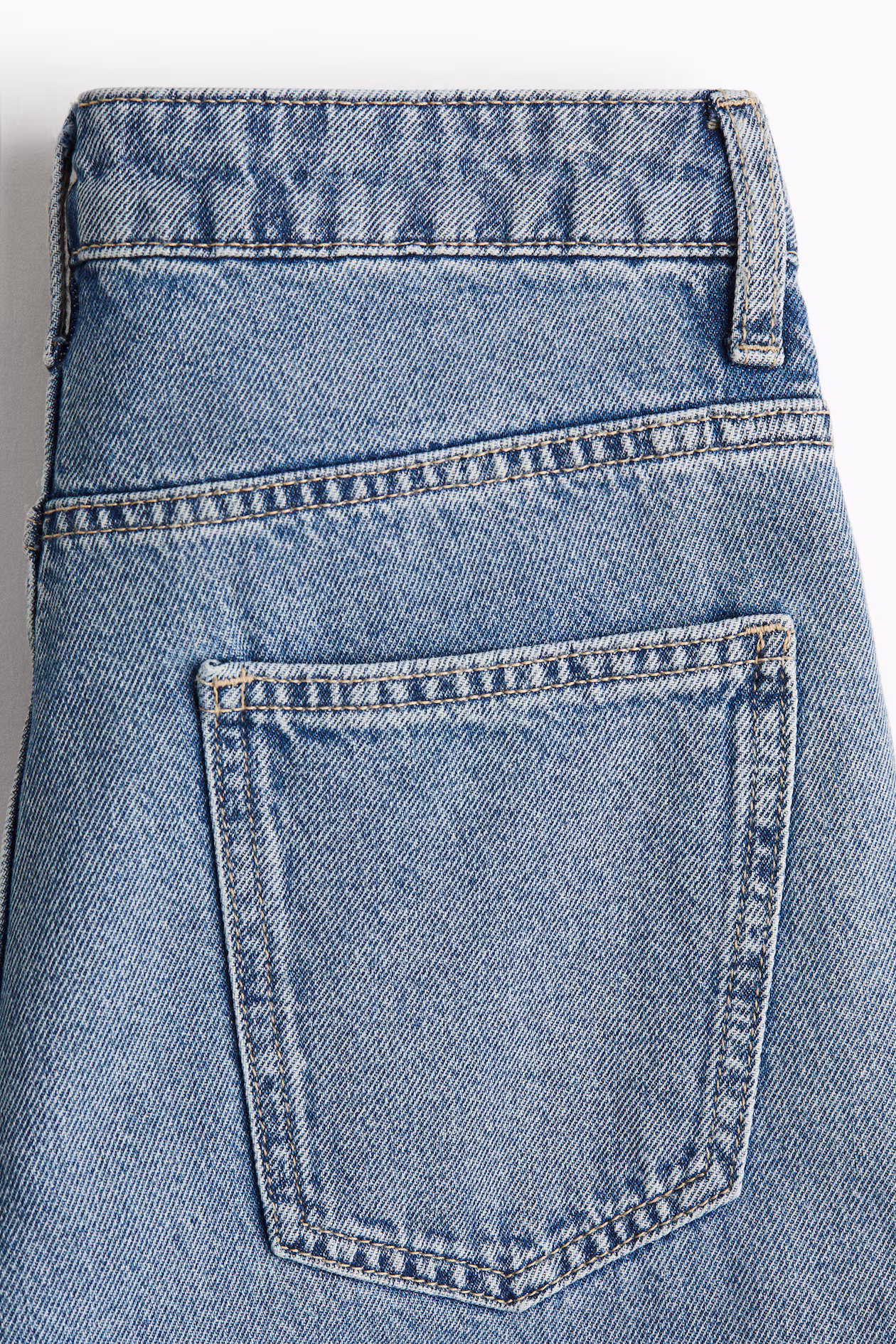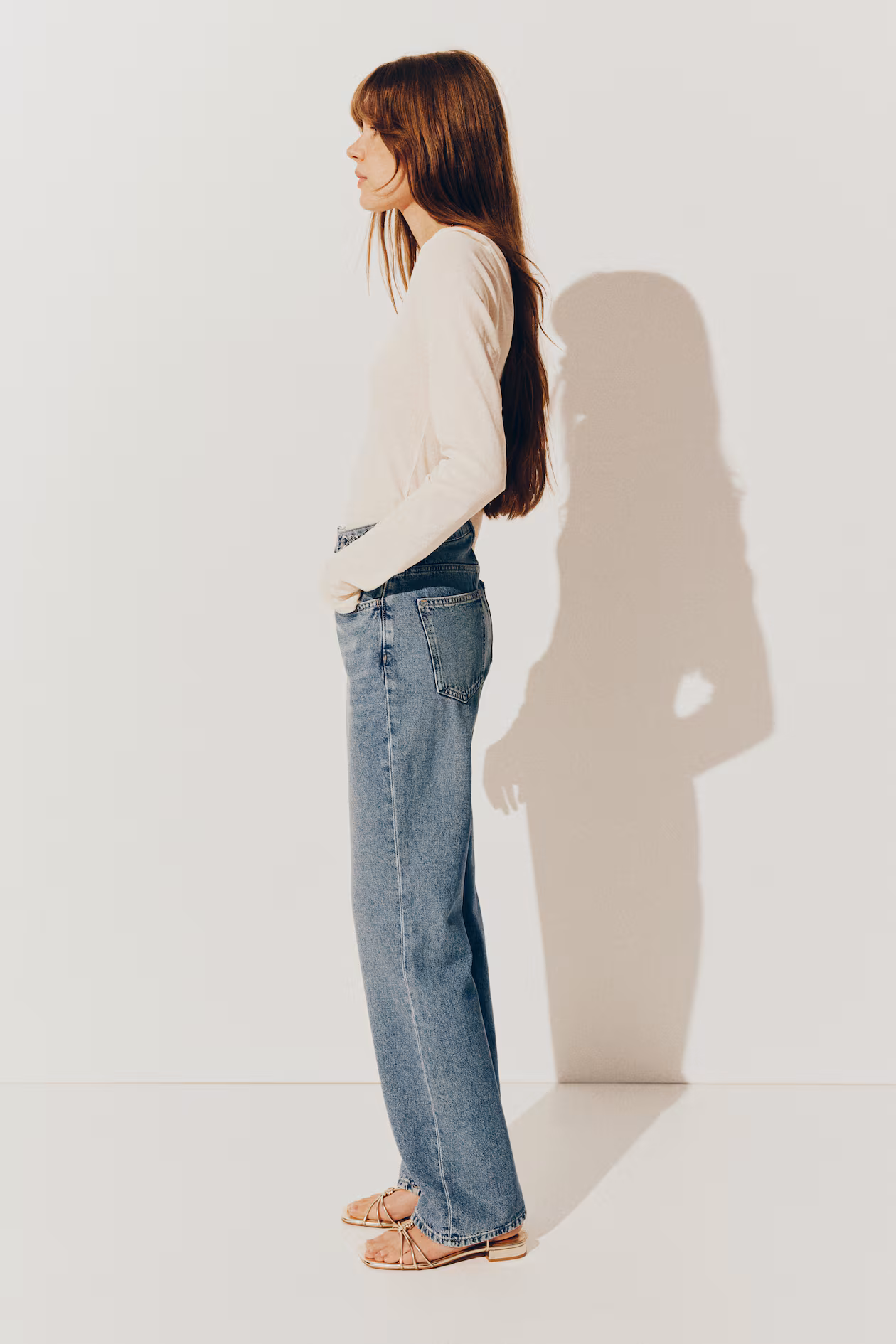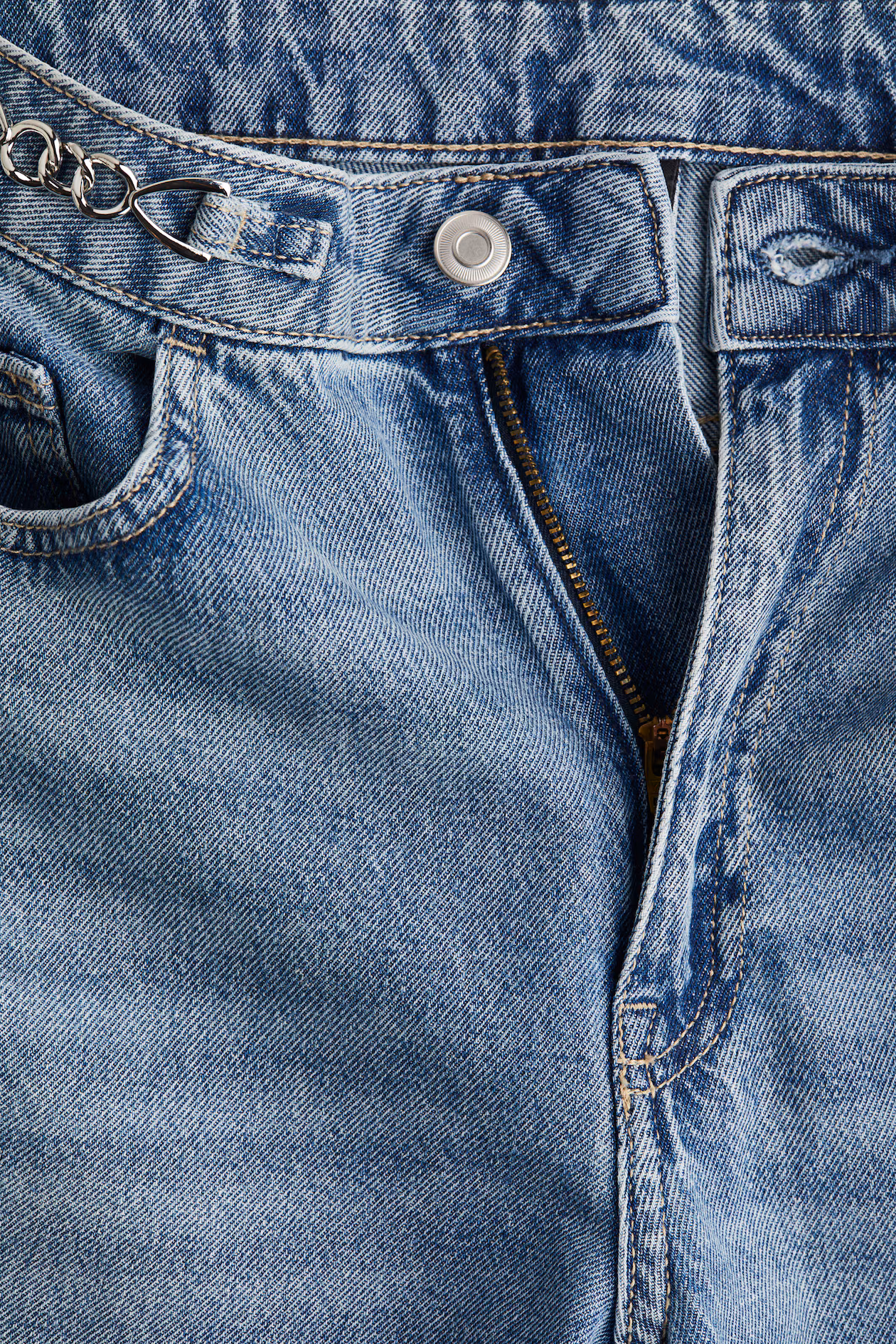 5-pocket jeans in rigid cotton denim that feels firm at first, softening and relaxing with wear. Regular fit from waist to hip and a looser, straight cut from thigh to hem. Extra-high waist, metal chain details at front of waistband, and zip fly with button. Straight, regular-length legs, designed to fall at top of foot with little or no stacking. This classic shape complements everything from hoodies to blazers.