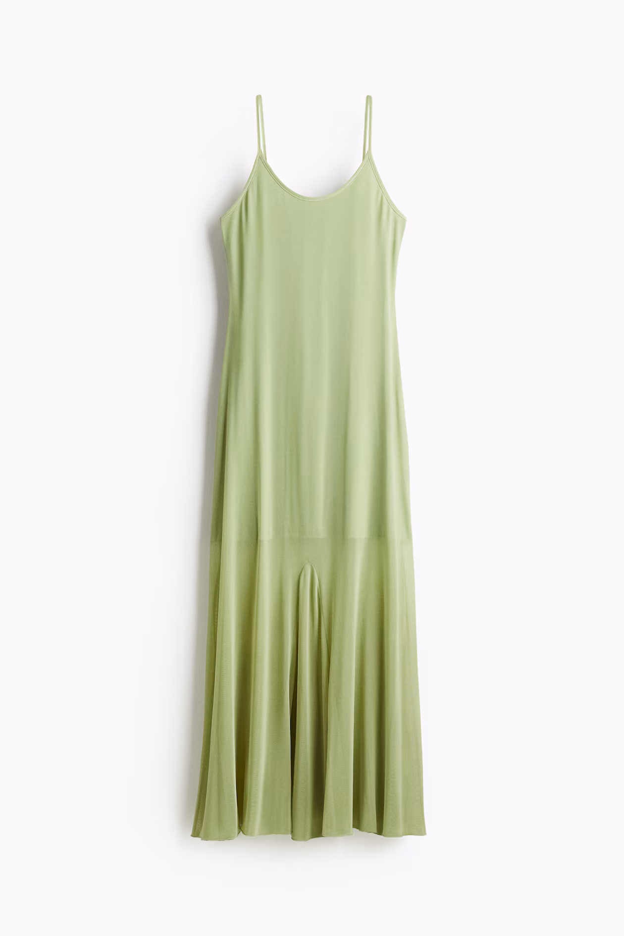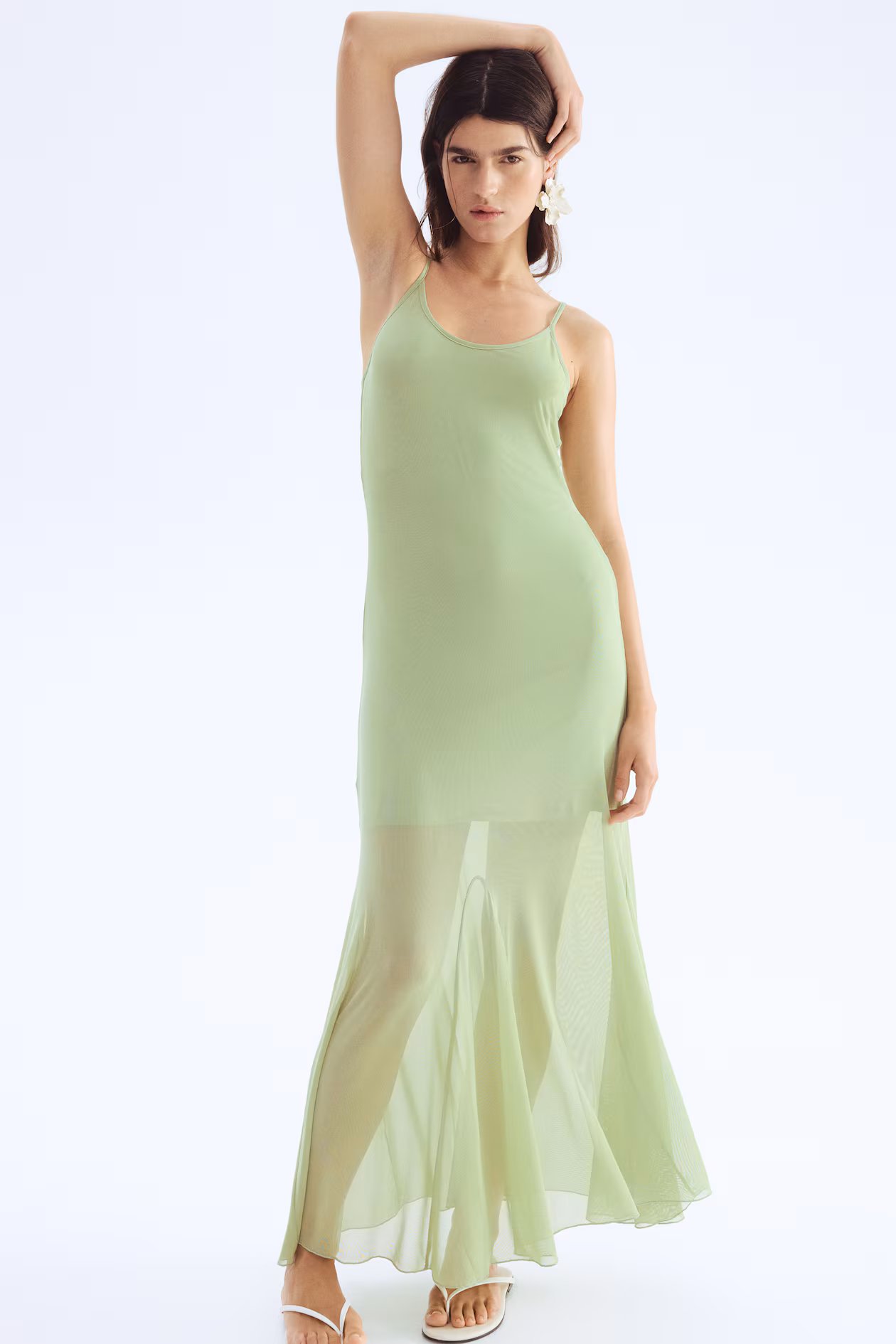 Long strappy dress in sheer mesh. Scoop neck front and back and a flared skirt with godet pleats for added volume. Short liner dress in jersey.