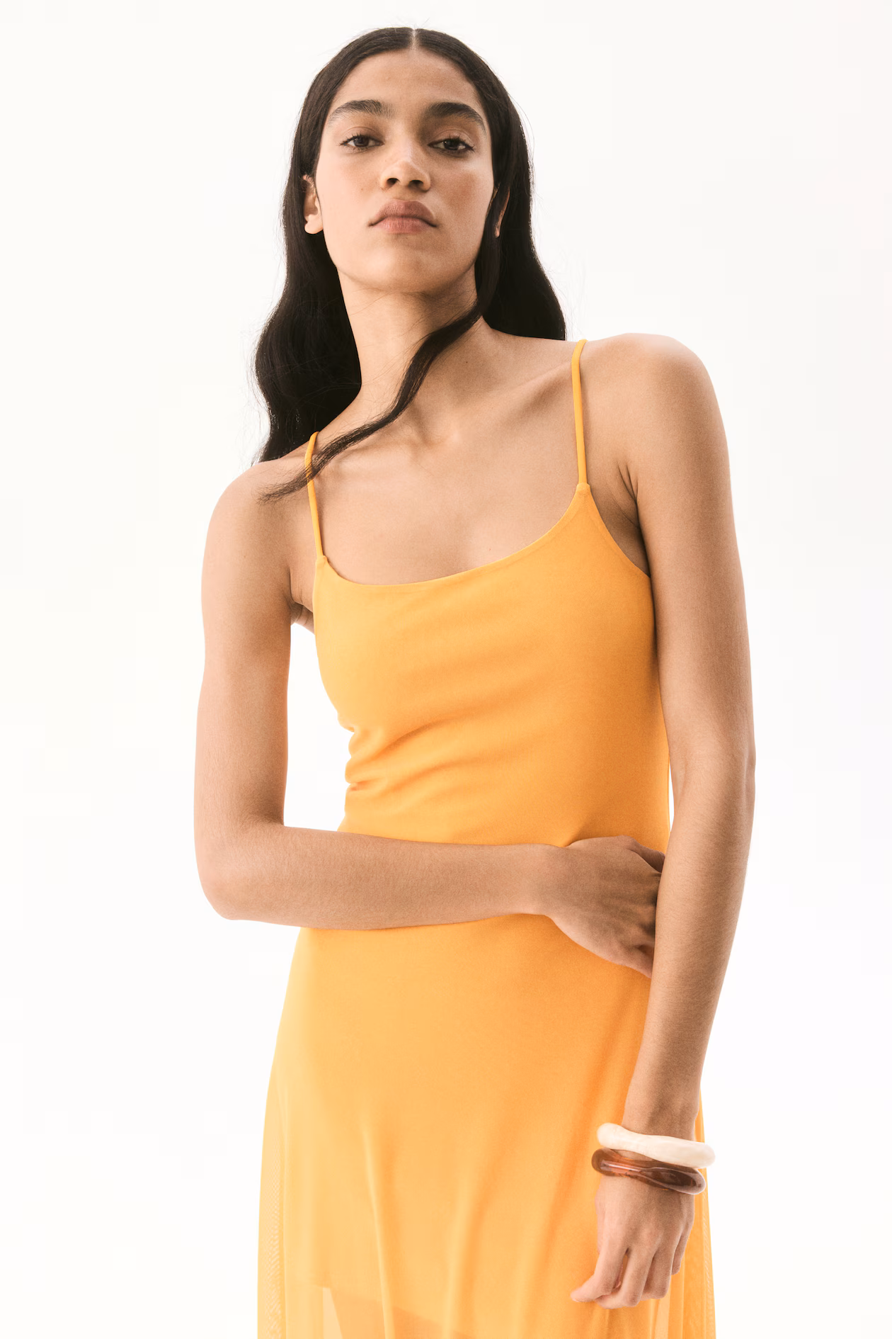 Fitted, ankle-length dress in sheer mesh. Extra-narrow shoulder straps, a scoop neck, and flared skirt with a raw-edge hem. Short liner dress in jersey.
