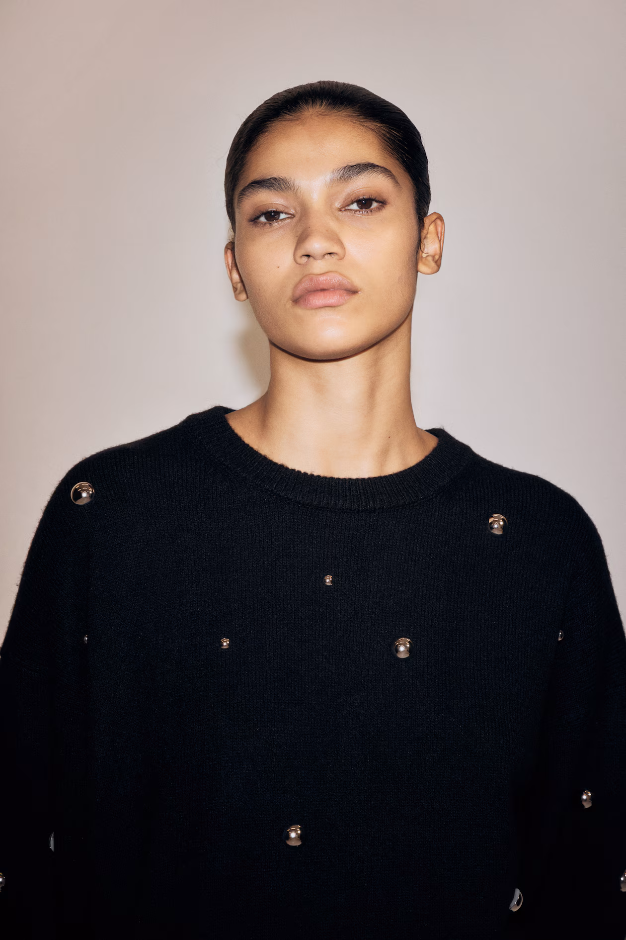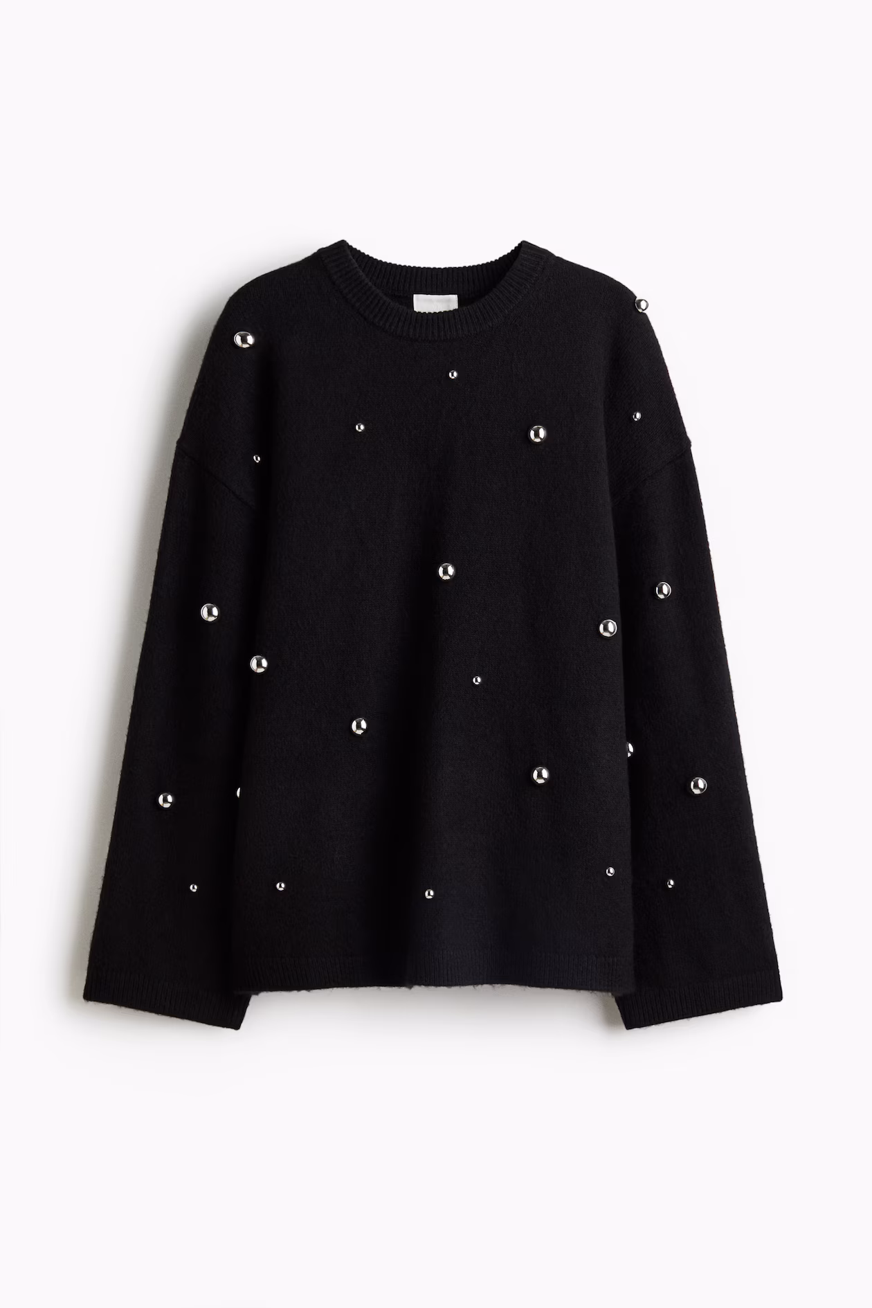 Oversized sweater in a soft knit embellished with domed metal studs. Crew neck, dropped shoulders, and long sleeves. Ribbing at neck, cuffs, and hem.