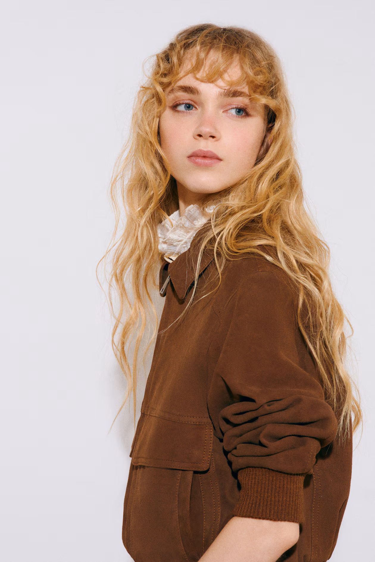Jacket in soft suede. Collar, concealed zipper at front, and a yoke at back. Diagonal shoulder seams, front pockets with flap and concealed snap fasteners, and welt side pockets. Ribbing at cuffs and hem. Lined.