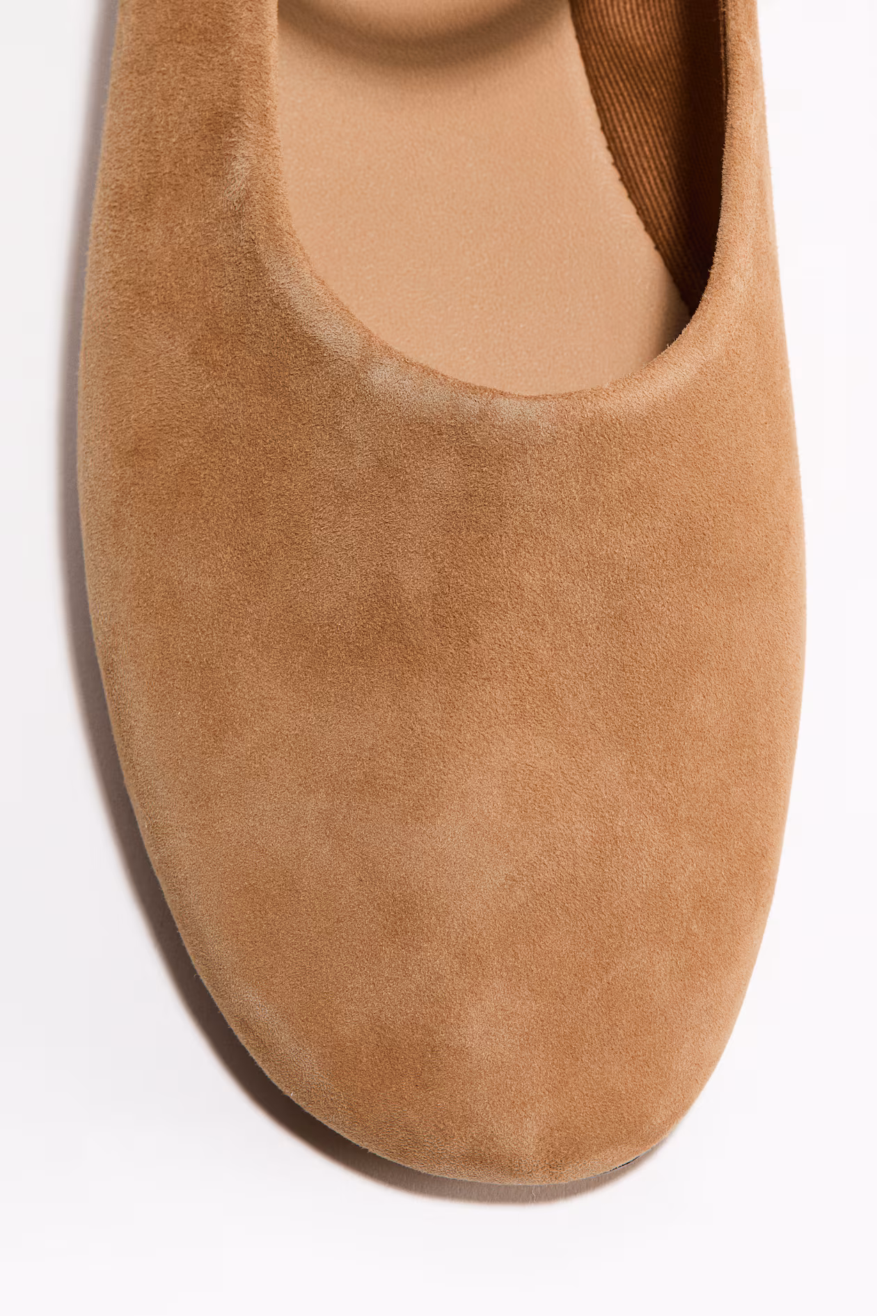 Mary Jane-style flats in soft suede with rounded toes. Adjustable foot strap with a metal buckle, lining in twill, and insoles in leather.