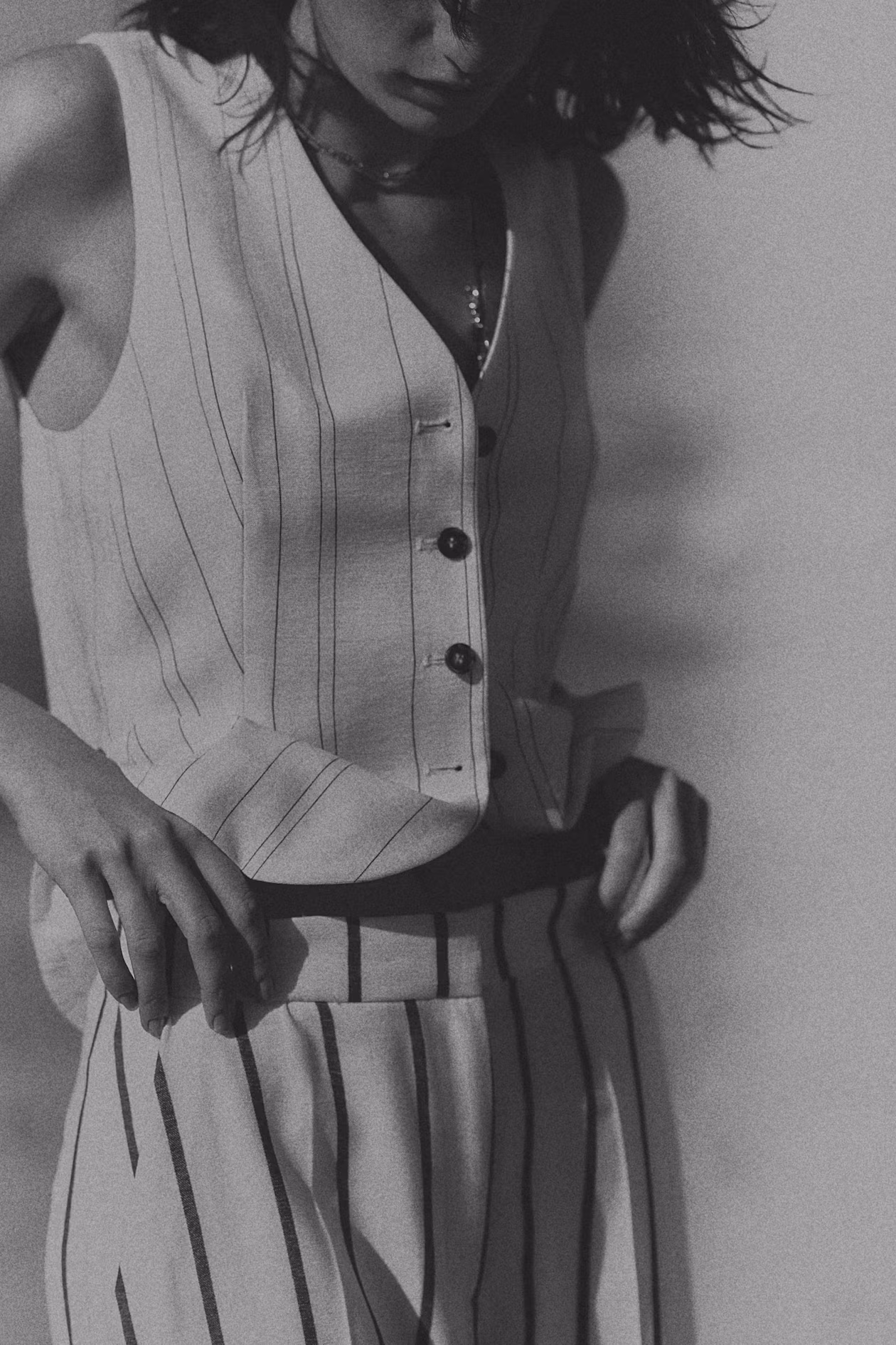Vest in woven fabric with shaping darts at front for a flattering silhouette. V-neck and buttons at front. Lined.
