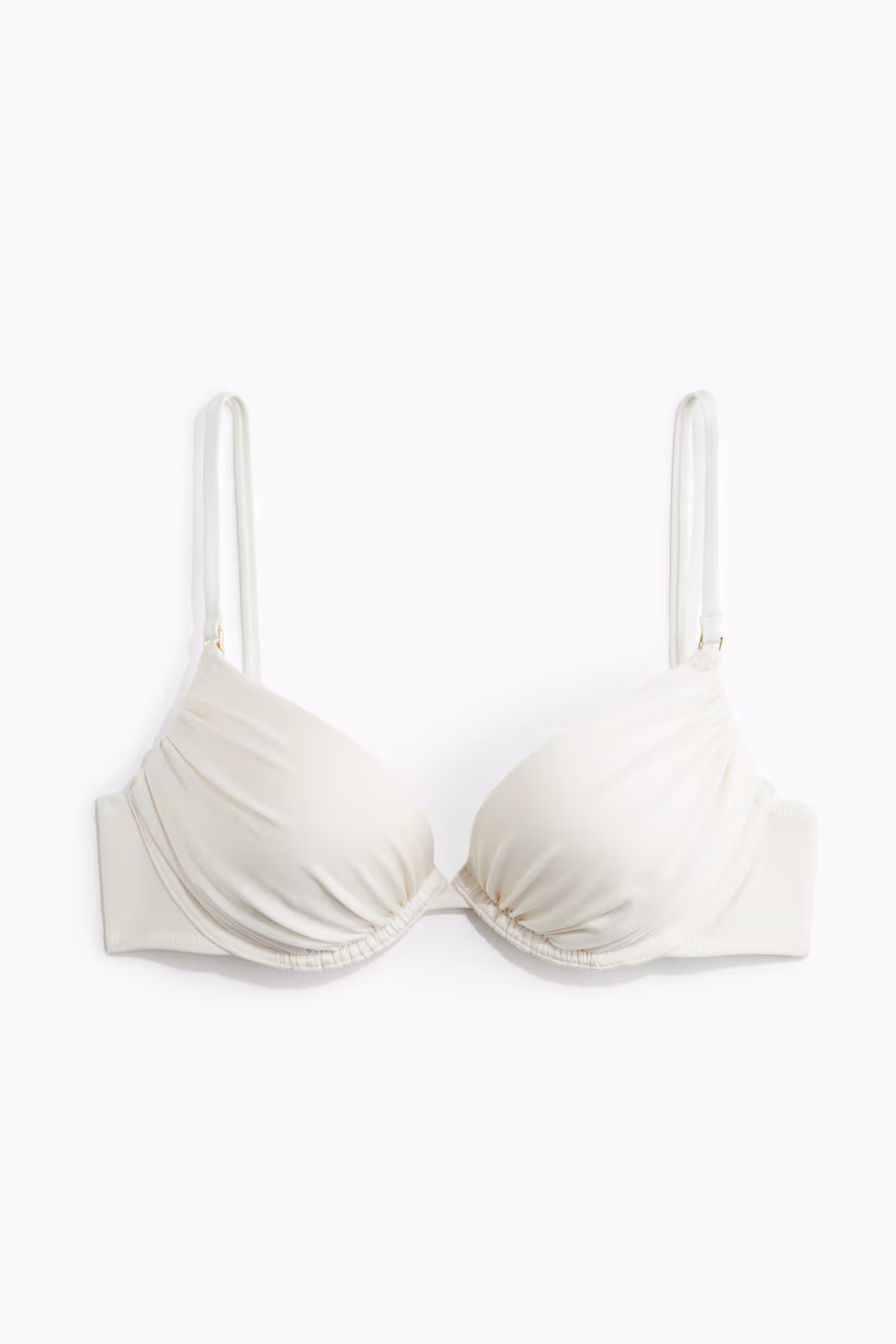 Lined bikini top with adjustable shoulder straps, thickly padded underwire cups to maximize bust and cleavage, and a metal hook fastener at back.