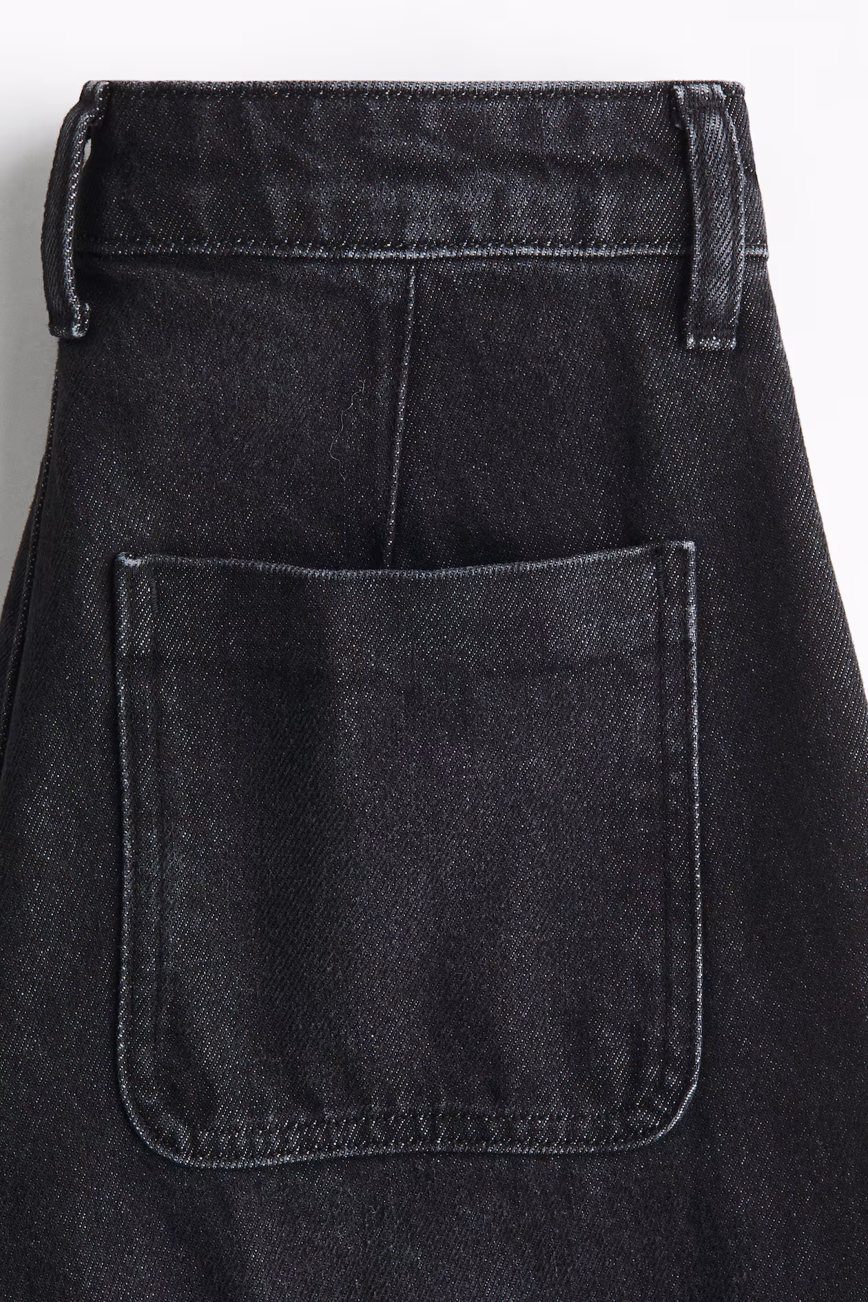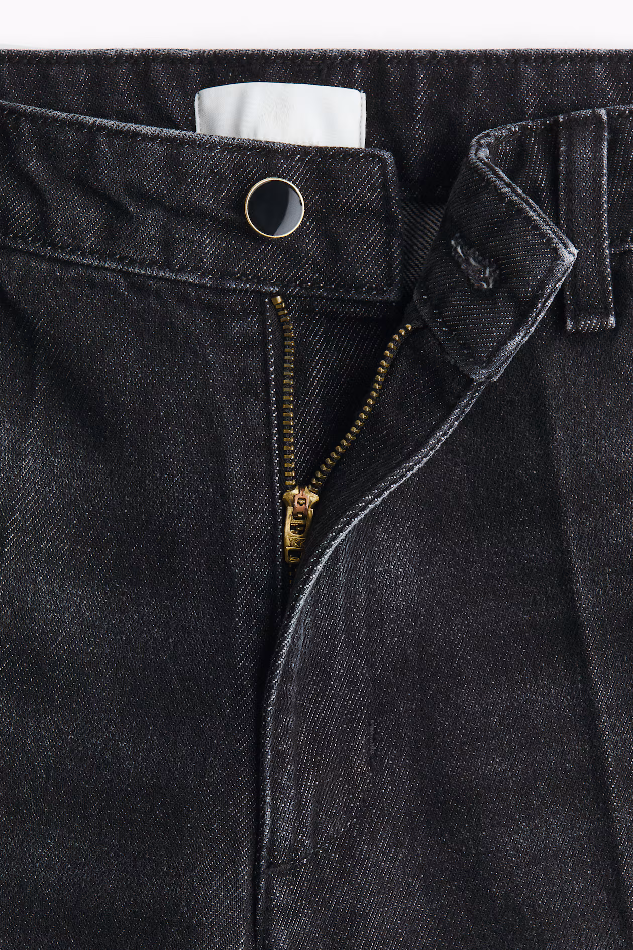 Jeans in rigid cotton denim that feels firm at first, softening and relaxing with wear. Loose fit from waist to hip and extra-wide cut from thigh to hem. High waist and zip fly with button. Diagonal side pockets, patch back pockets, and creases at front and back. Wide, regular-length legs, designed to fall at top of foot with little or no stacking. Inspired by the 70s, designed for today.