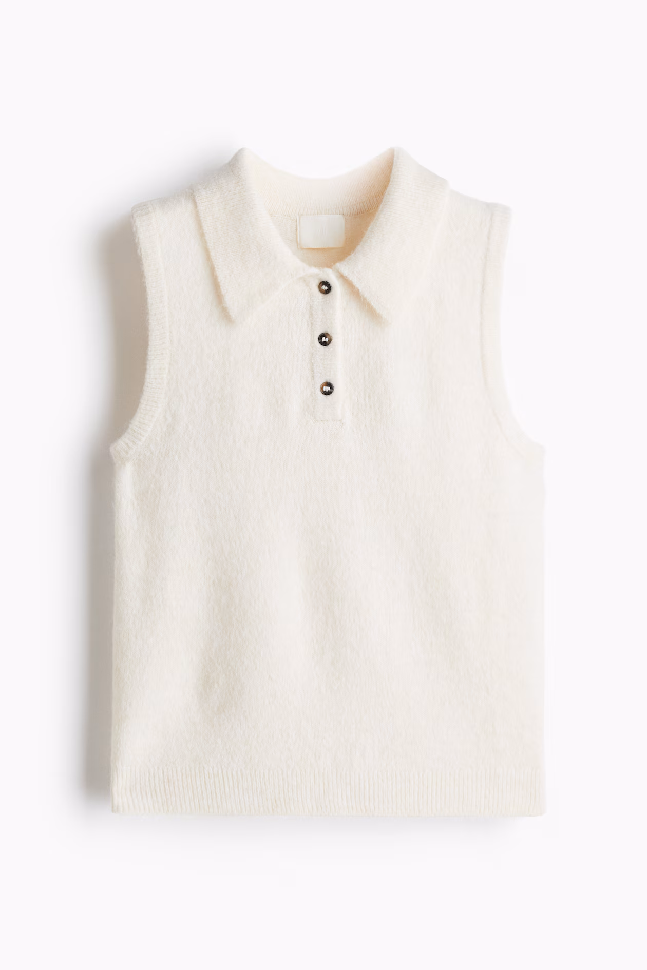 Short, fitted sweater vest in a soft knit. Collar, short button placket, and ribbing at armholes and hem.