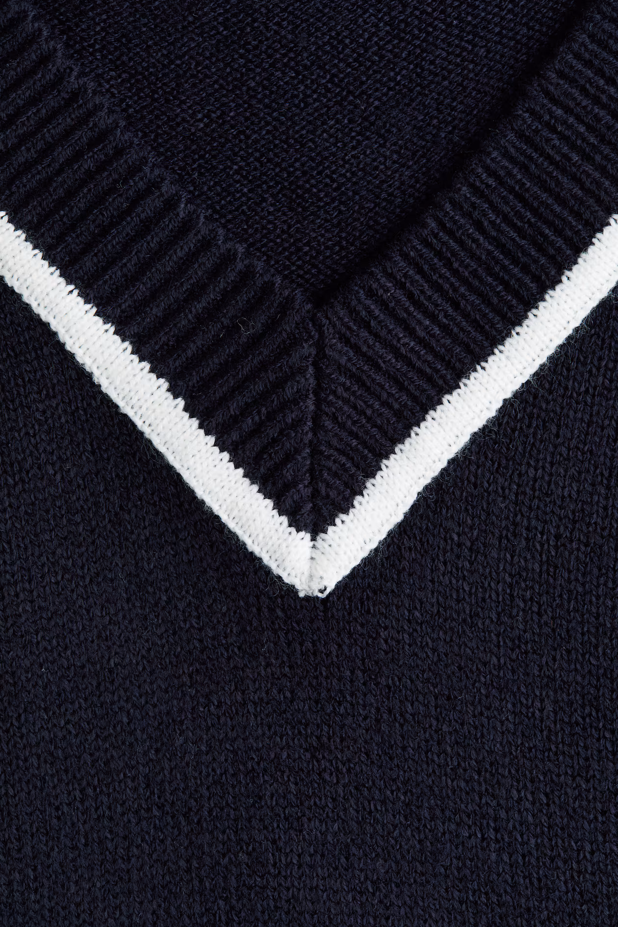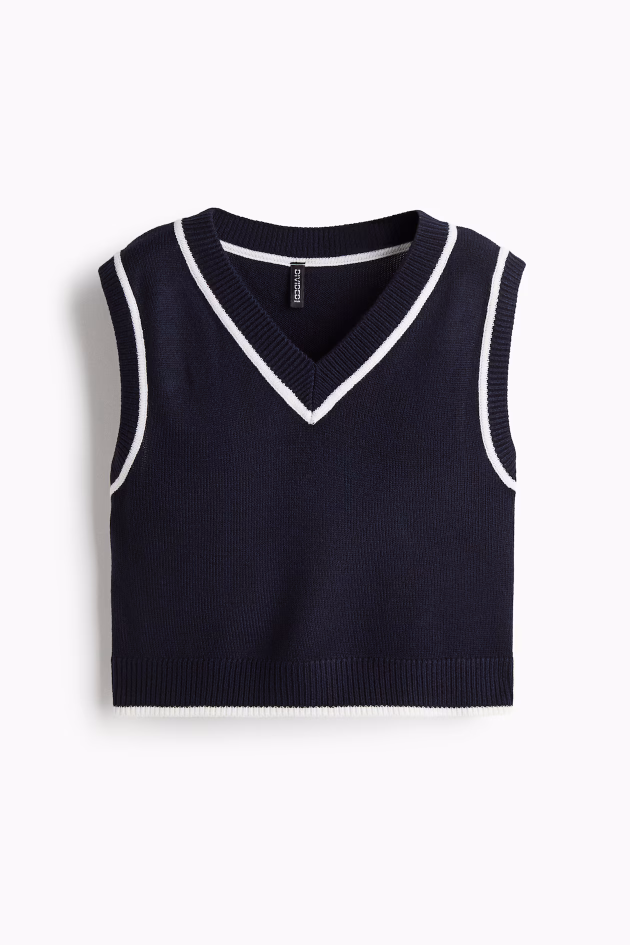Short sweater fest in a soft, fine knit. Ribbed V-neck and ribbing at armholes and hem.