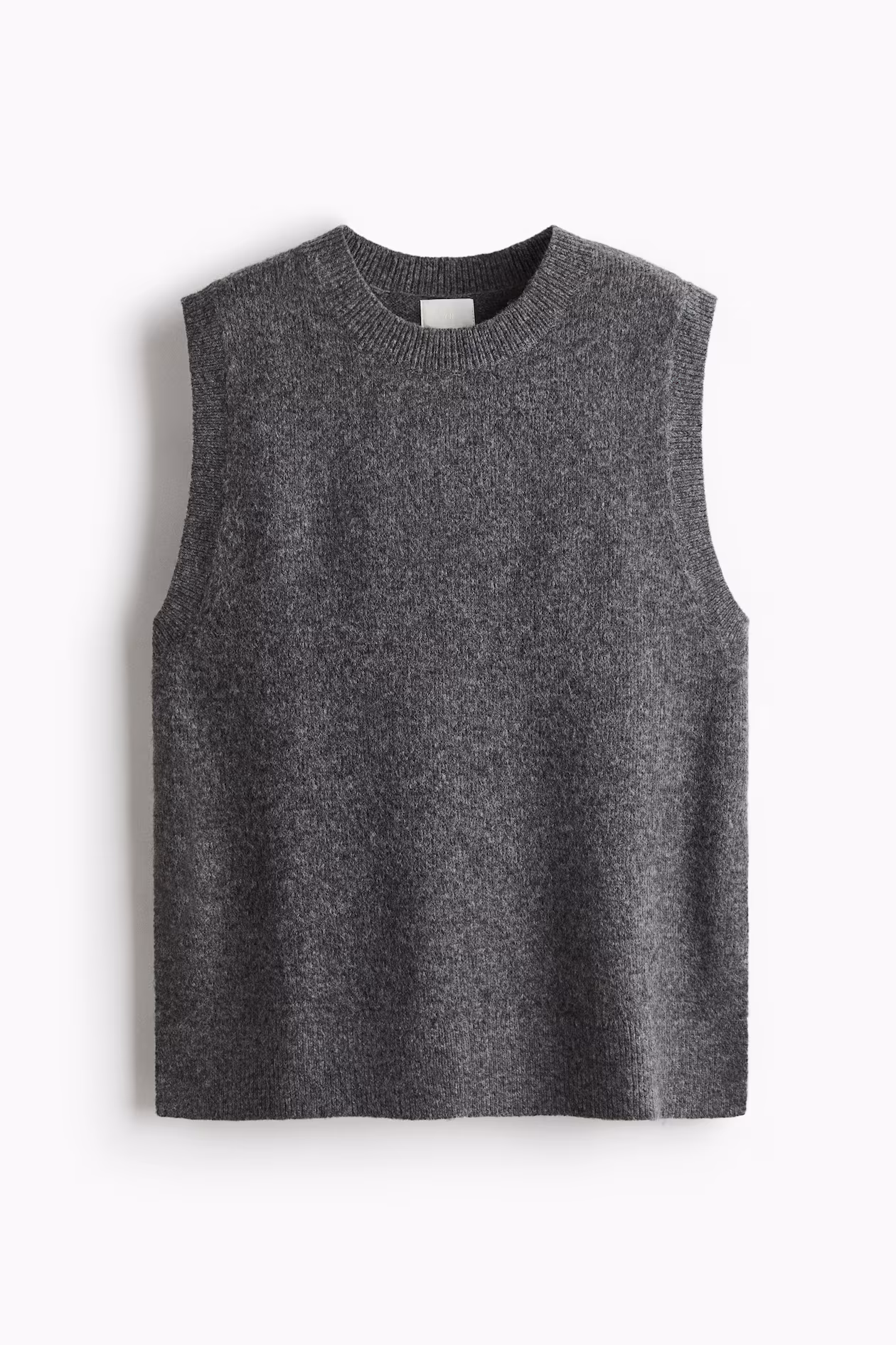 Loose-fit sweater vest in a soft, fine knit with wool content. Round neckline, high slit at sides of hem, and ribbing at neckline, armholes, and hem.