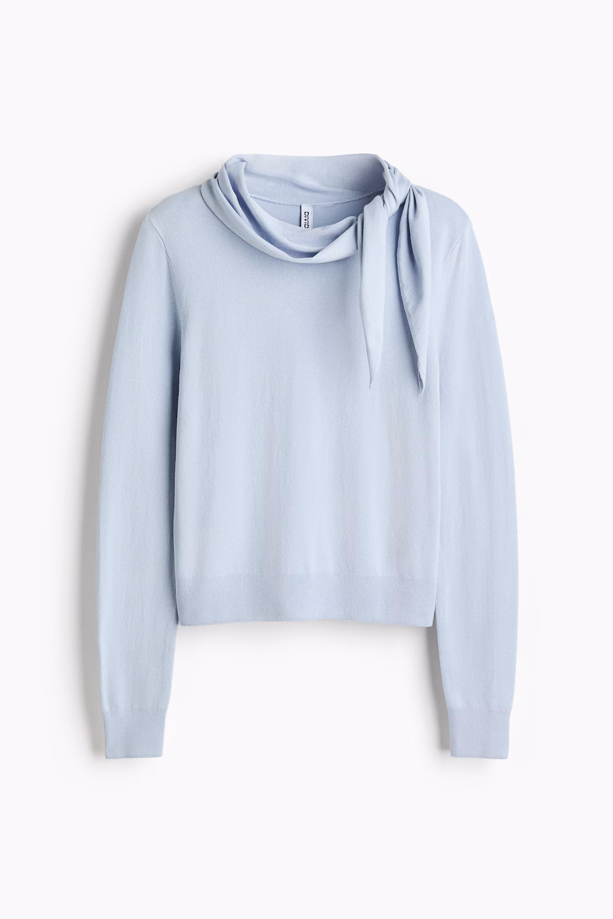 Fitted, fine-knit sweater in a viscose blend with a scarf collar. Ribbing at cuffs and hem.