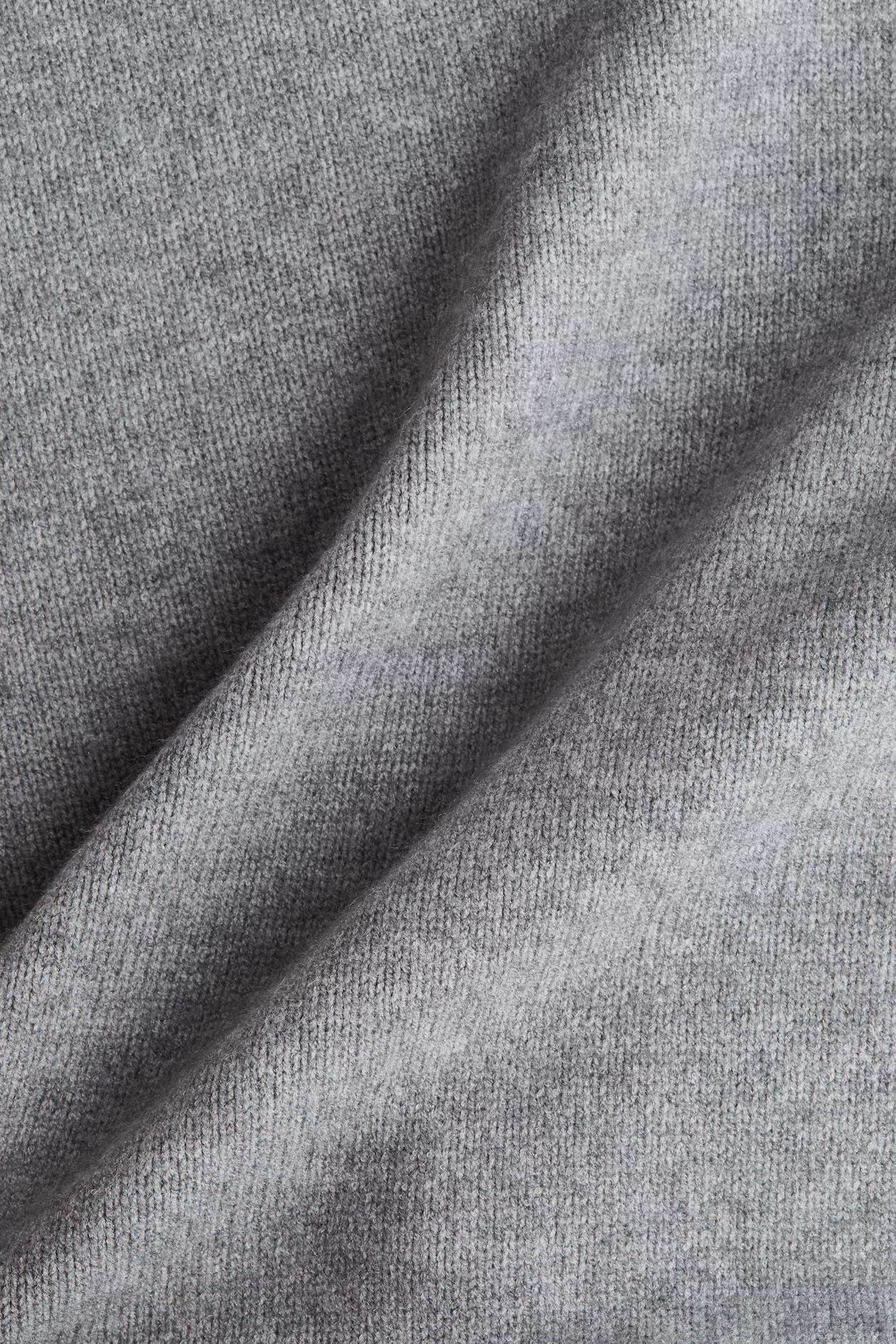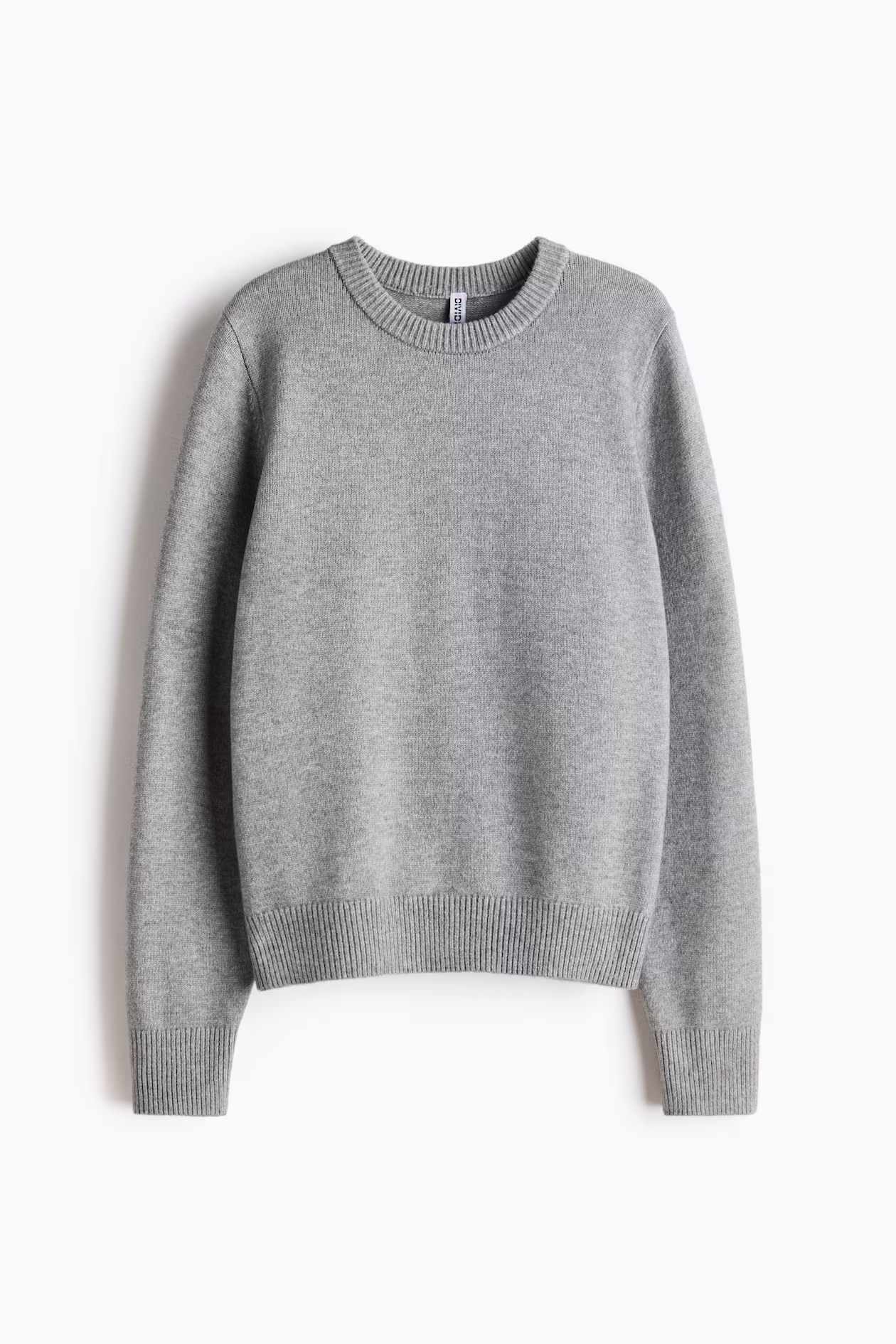 Soft, knit sweater with wool content. Round neck and ribbing at neck, cuffs, and hem.