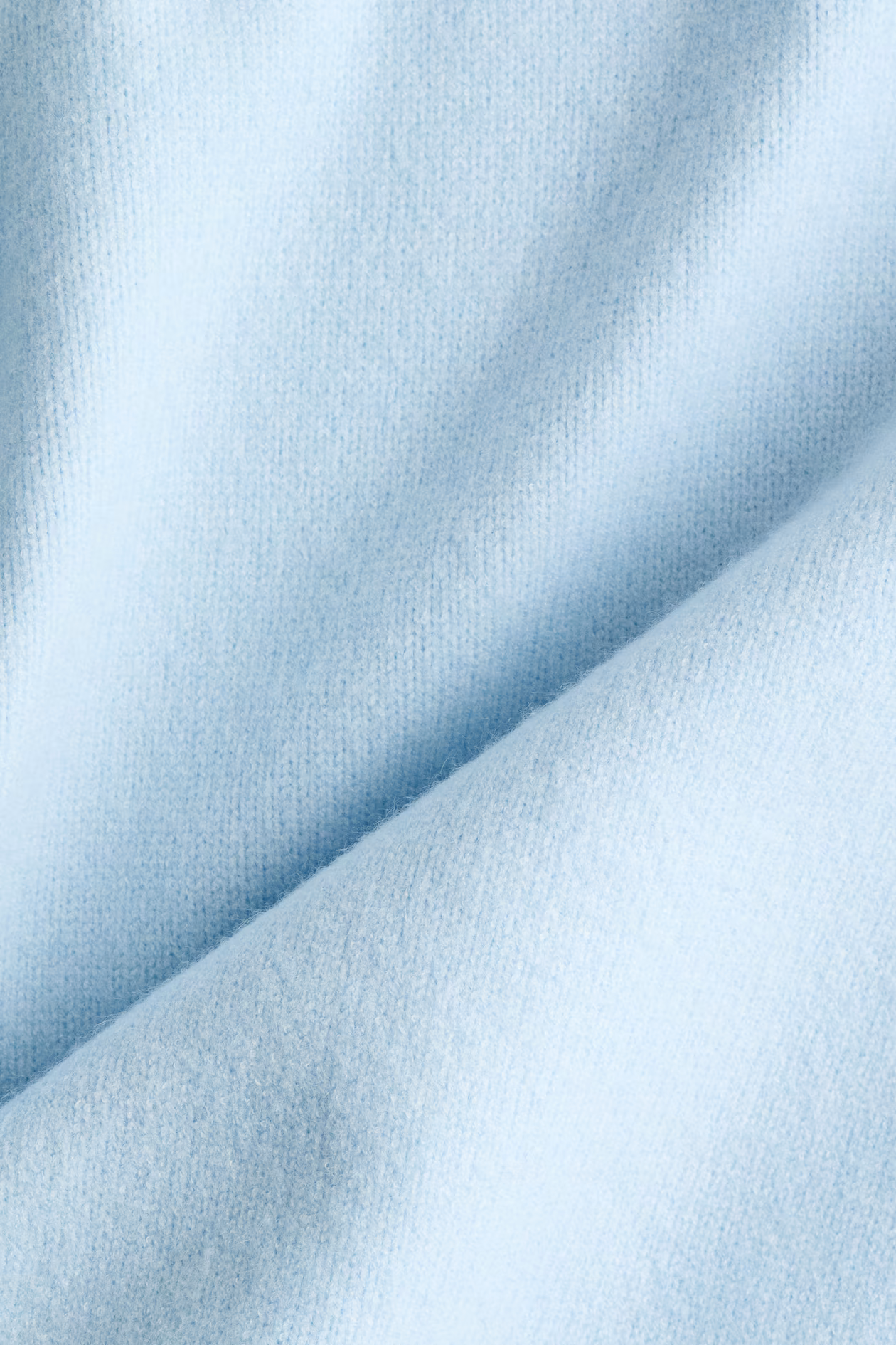 Soft, knit sweater with wool content. Round neck and ribbing at neck, cuffs, and hem.