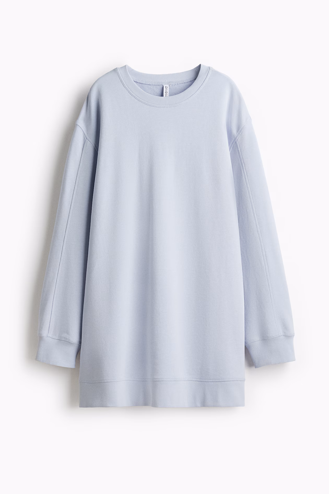 Short, loose-fit, lightweight sweatshirt dress with flatlock seams for added comfort. Crew neck, dropped shoulders, and long sleeves. Ribbing at neck, cuffs, and hem.