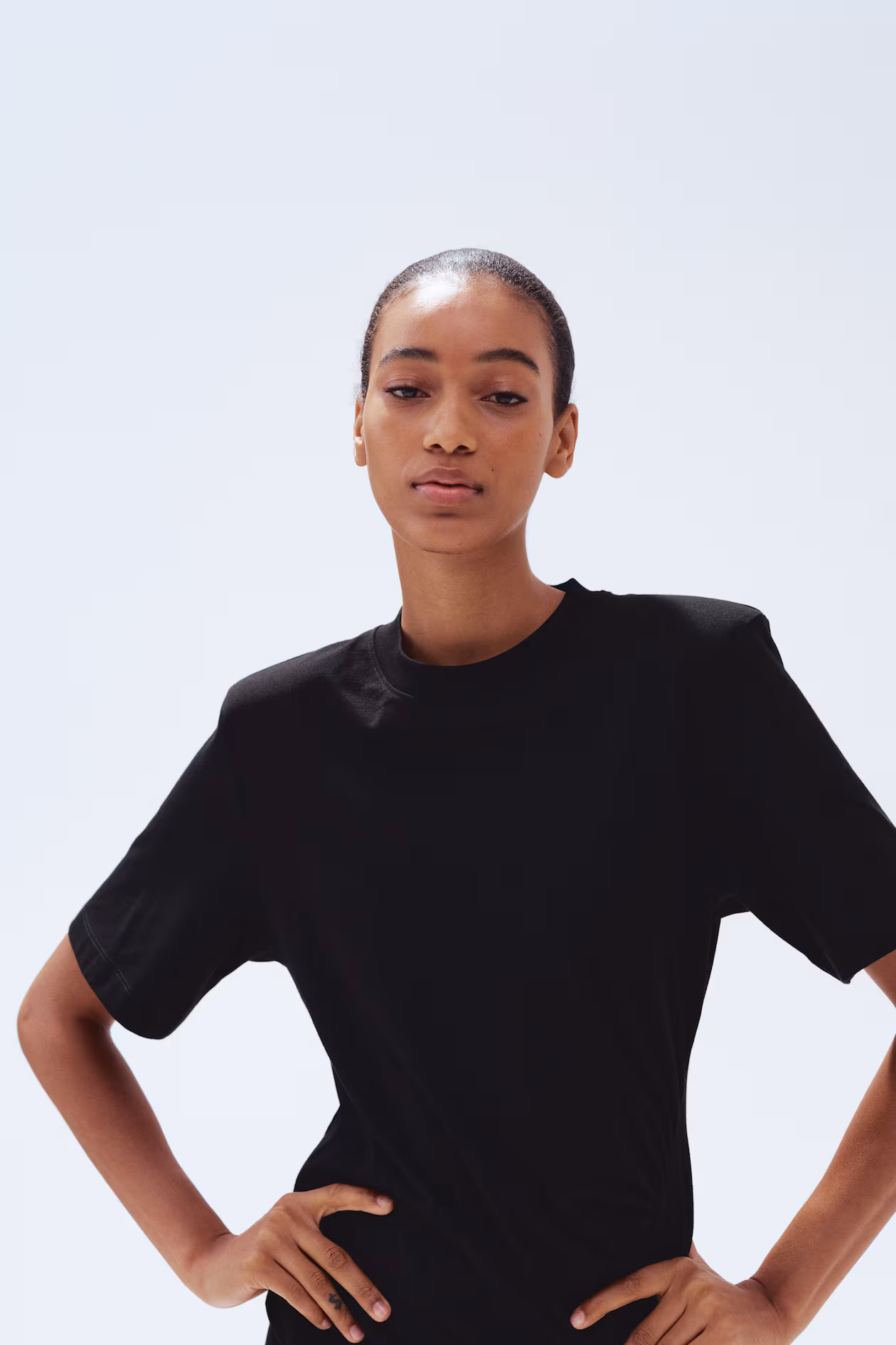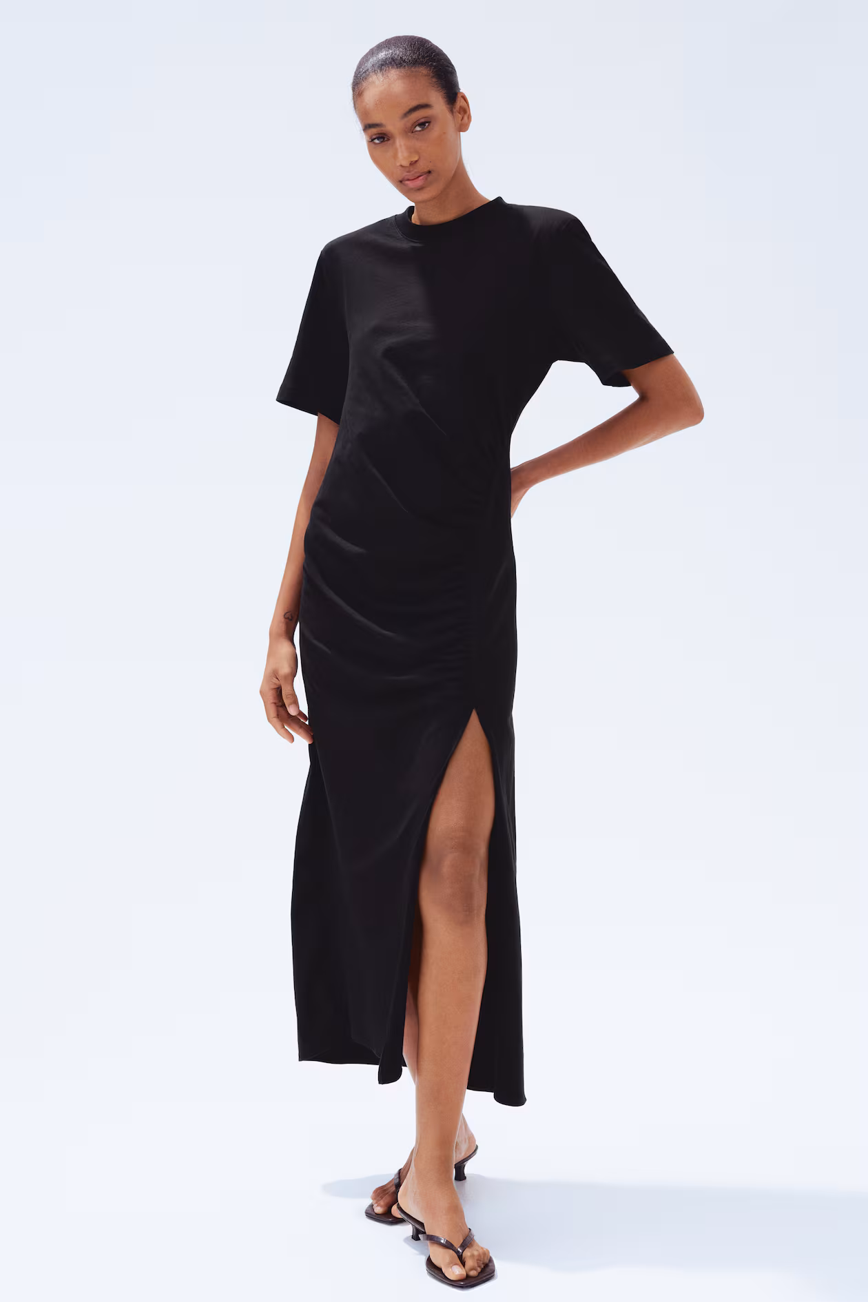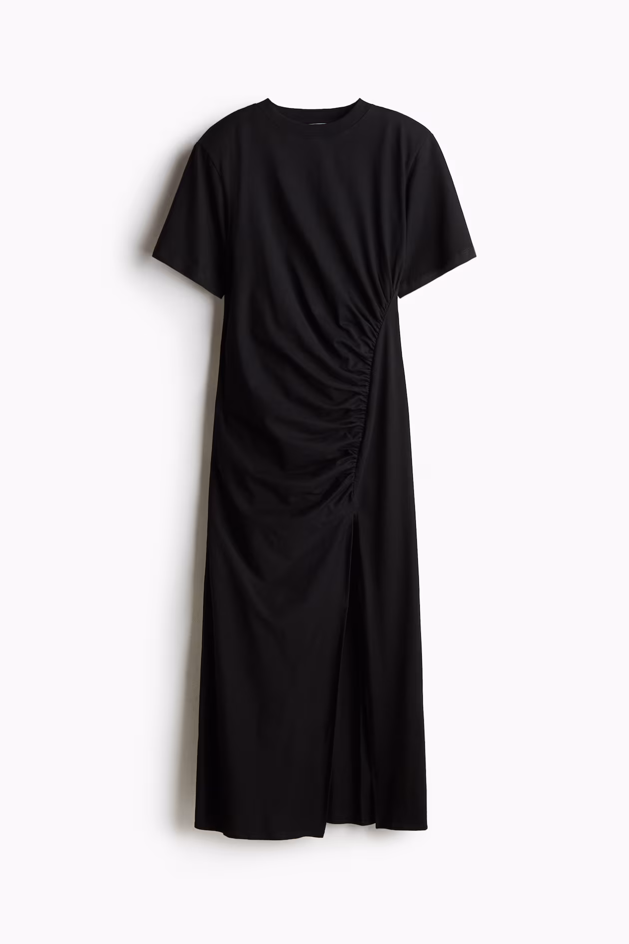 Long, slim-fit T-shirt dress in cotton jersey. Ribbed crew neck, bold shoulder pads, and a draped section at one hip with a curved, gathered seam finishing in a high slit.