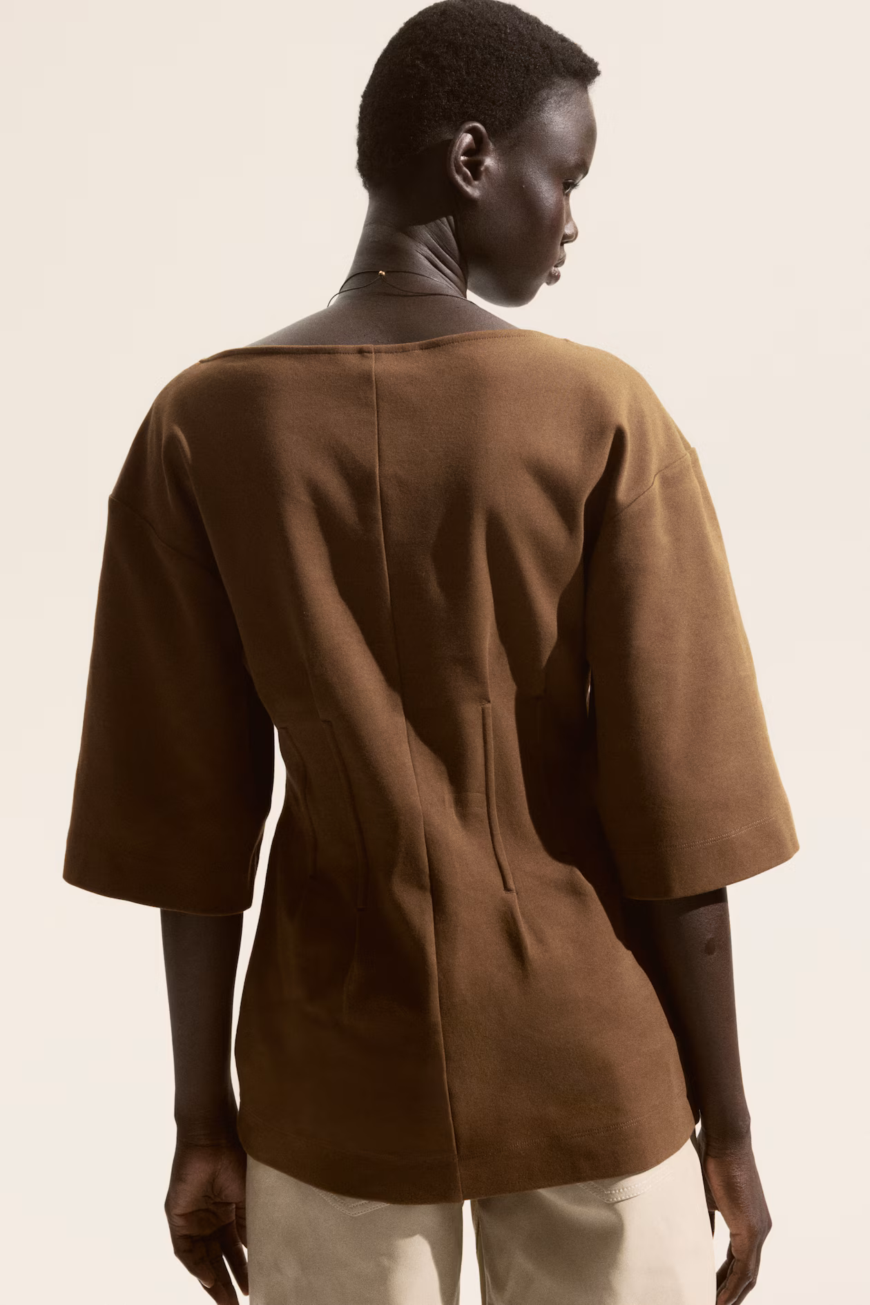 Long T-shirt in thick cotton jersey. Boat neck, tapered waist with lightly padded darts at front and back, dropped shoulders, and wide, elbow-length sleeves.