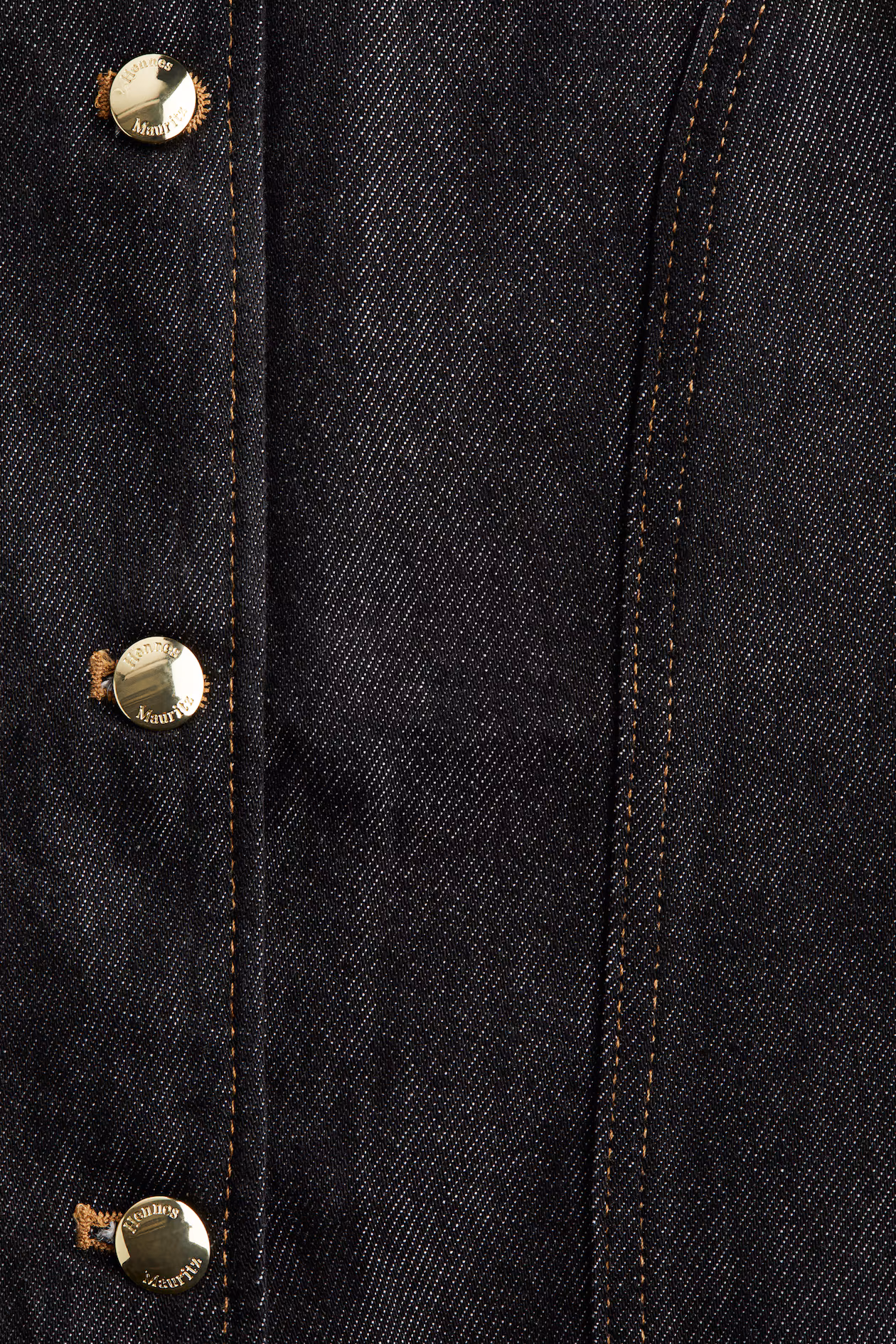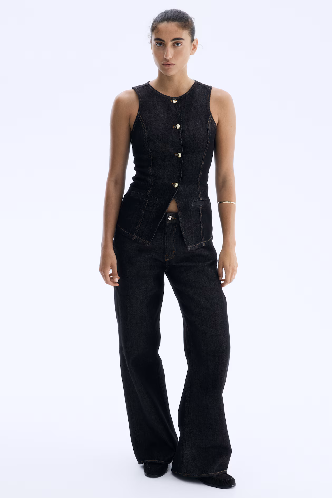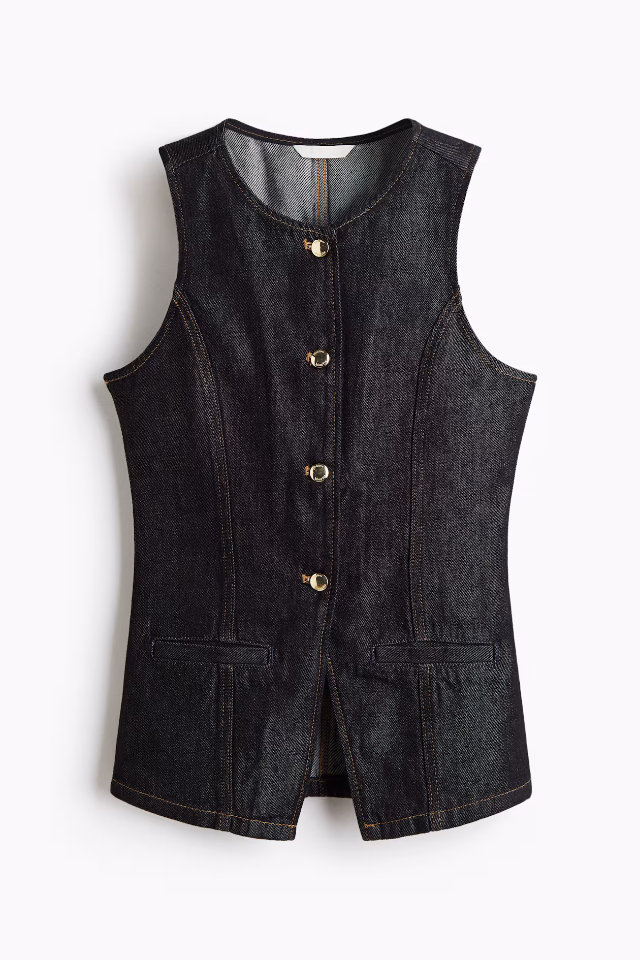 Fitted vest in rigid denim made from a cotton and lyocell blend with shaping seams at front and back. Round neckline, metal buttons from neckline to waist, and a gently flared cut from waist to hem. Mock welt front pockets.