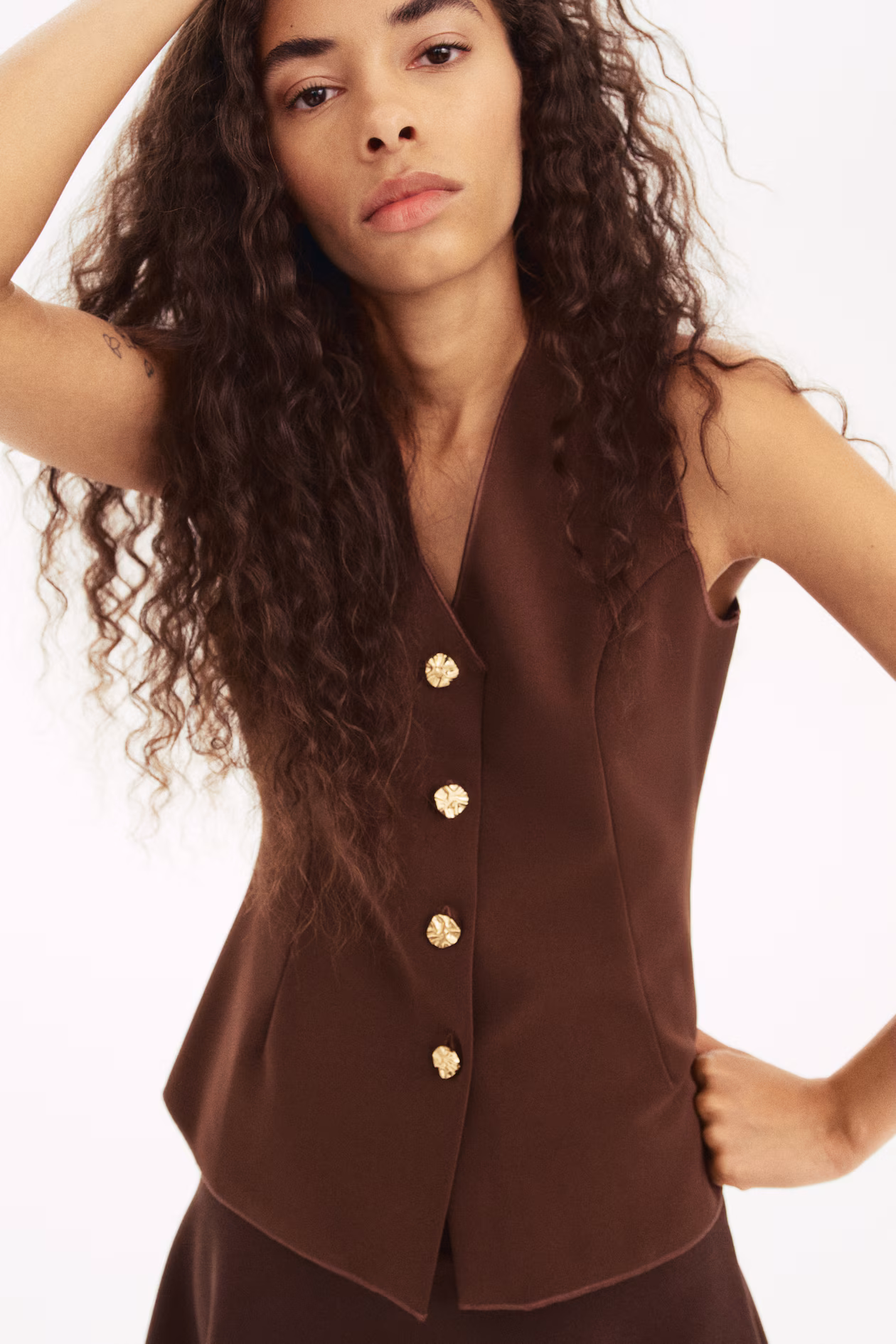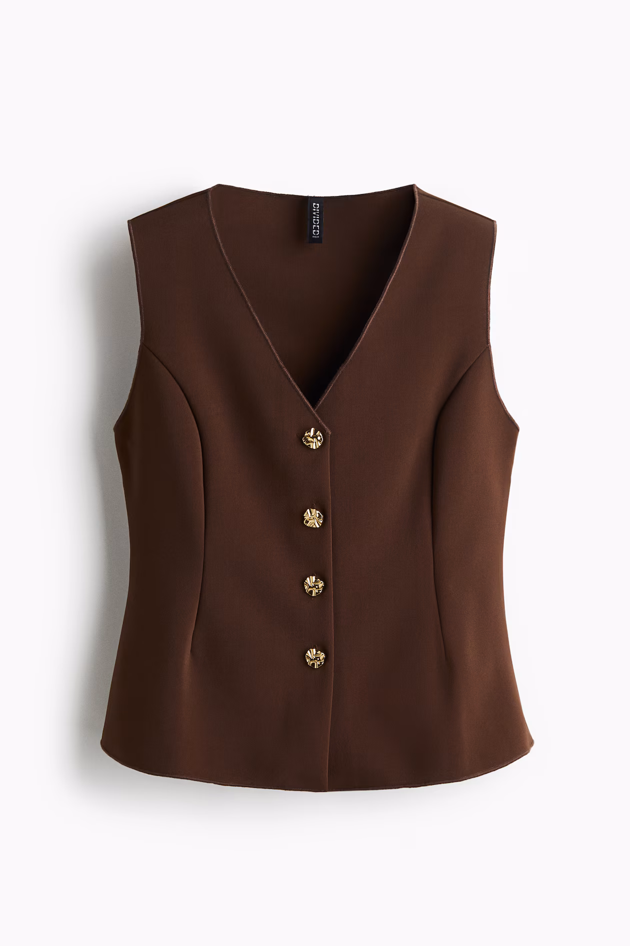 Fitted waistcoat in heavy interlock jersey with overlocked edges. V-shaped neckline and hammered metal buttons down to the waist creating a gently flared cut from the waist down. Princess seams at the front and shaping seams at the back for a flattering silhouette.