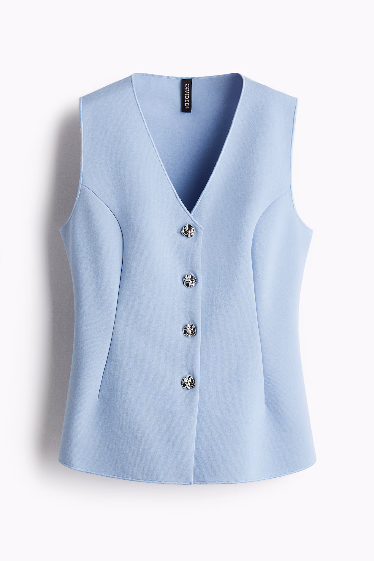 Fitted waistcoat in heavy interlock jersey with overlocked edges. V-shaped neckline and hammered metal buttons down to the waist creating a gently flared cut from the waist down. Princess seams at the front and shaping seams at the back for a flattering silhouette.