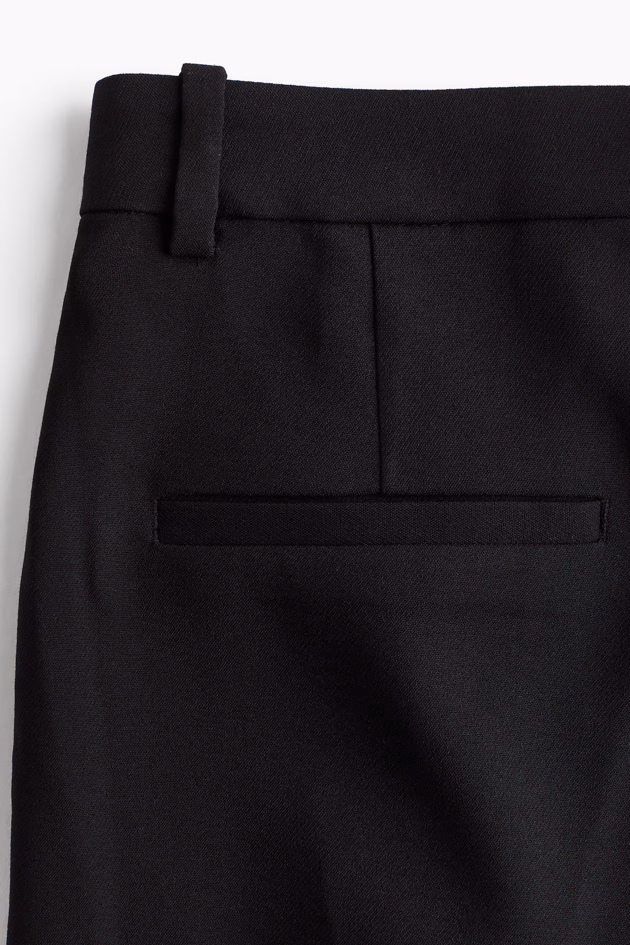 Ankle-length dress pants in woven fabric. High waist, zip fly with button, diagonal side pockets, and mock welt back pockets. Tapered legs with stitched creases at front, pressed creases at back, and a small slit at hem.
