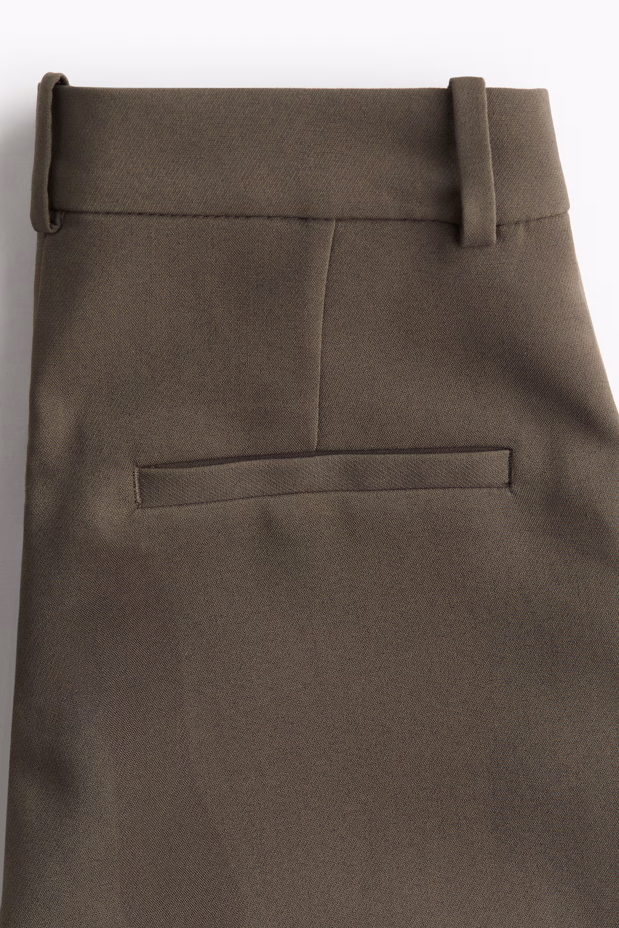 Ankle-length dress pants in woven fabric. High waist, zip fly with button, diagonal side pockets, and mock welt back pockets. Tapered legs with stitched creases at front, pressed creases at back, and a small slit at hem.