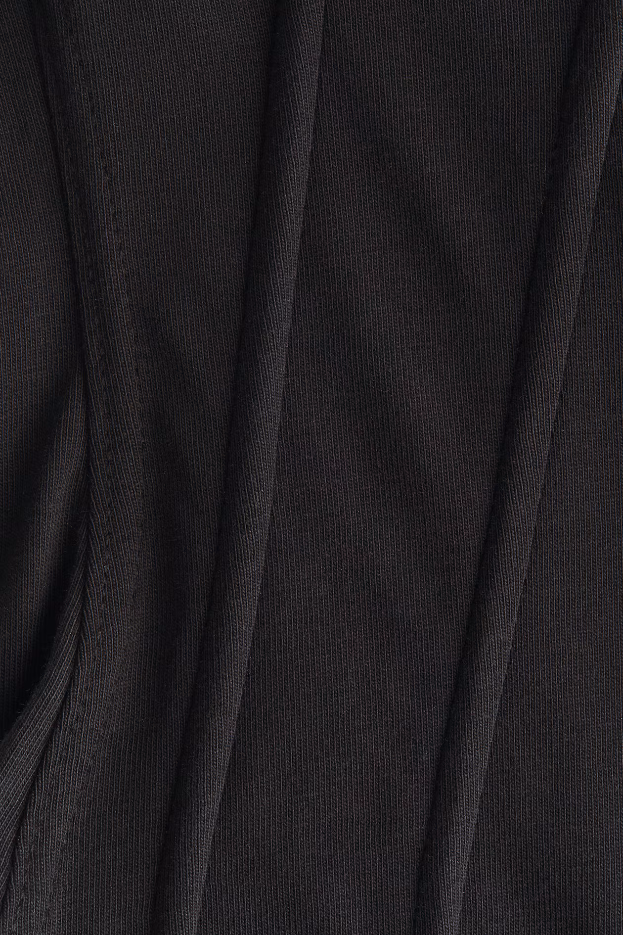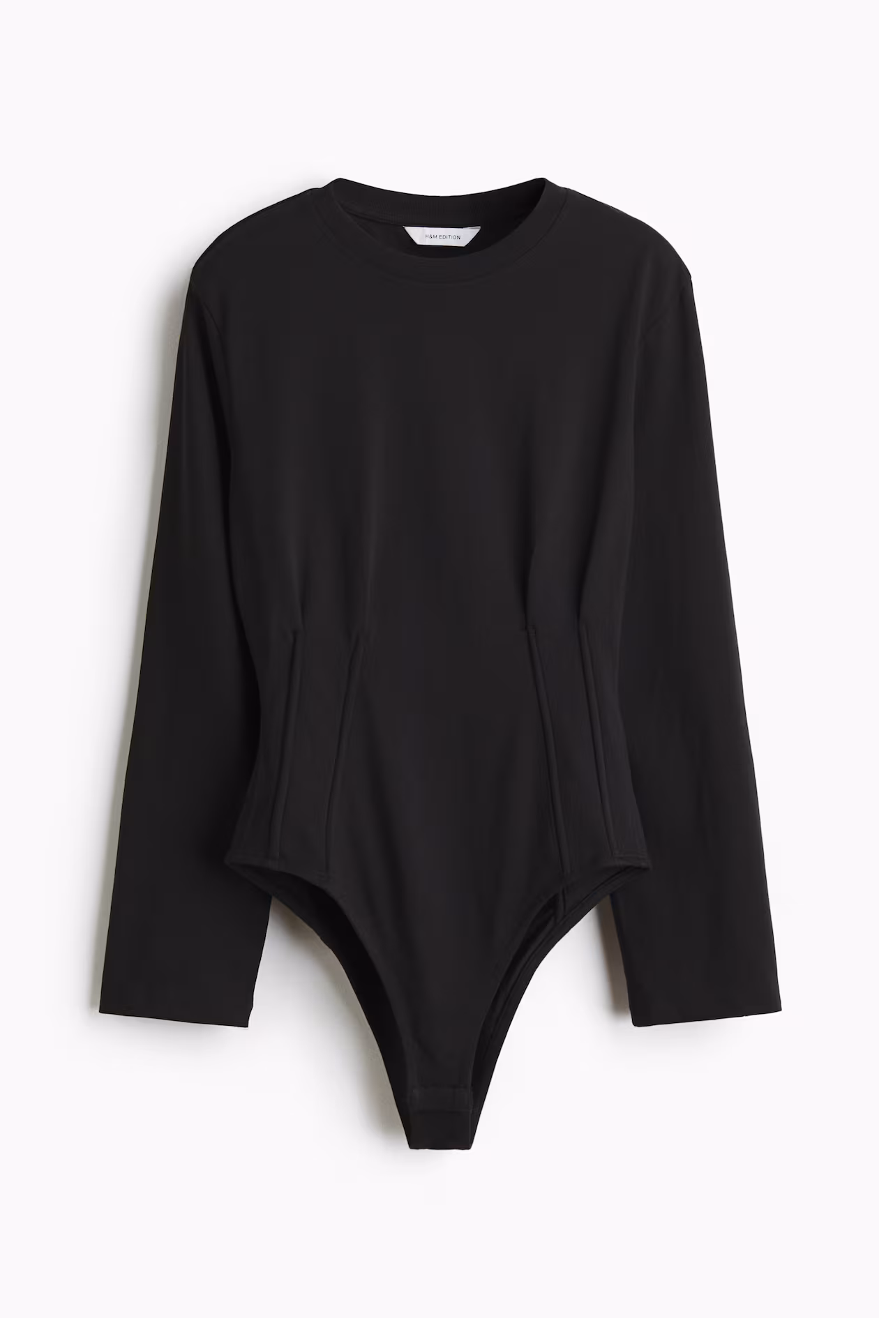 Bodysuit in cotton jersey. Round neckline, tapered waist with lightly padded darts at front and back, and long sleeves. Medium coverage at back and concealed snap fasteners at gusset.