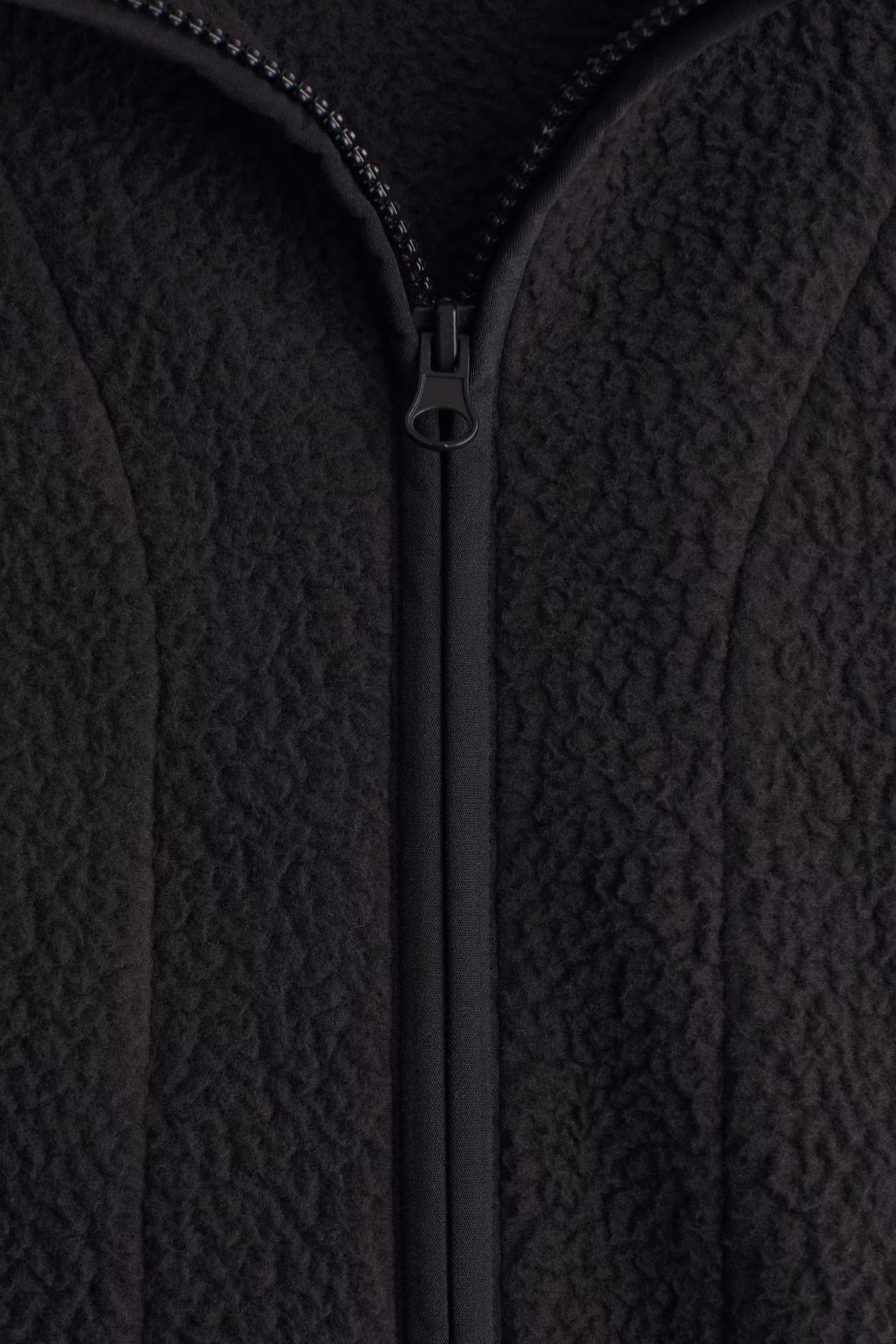 Loose-fit activewear jacket in soft, warm teddy fleece. Stand-up collar, zipper at front, and welt side pockets with zipper. Long sleeves with narrow elastic at cuffs. Concealed, elasticized drawstring at hem with cord stoppers. Unlined.
