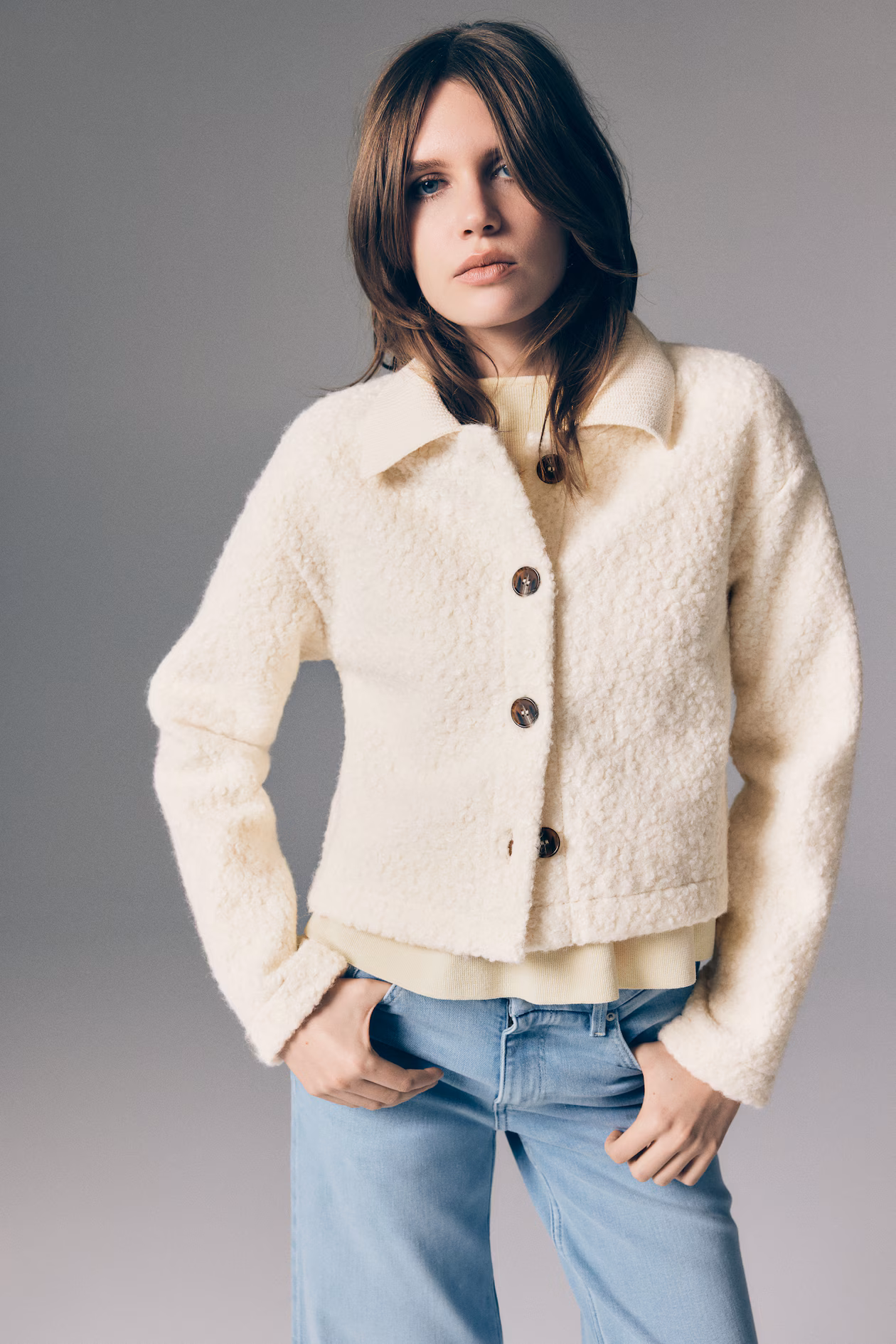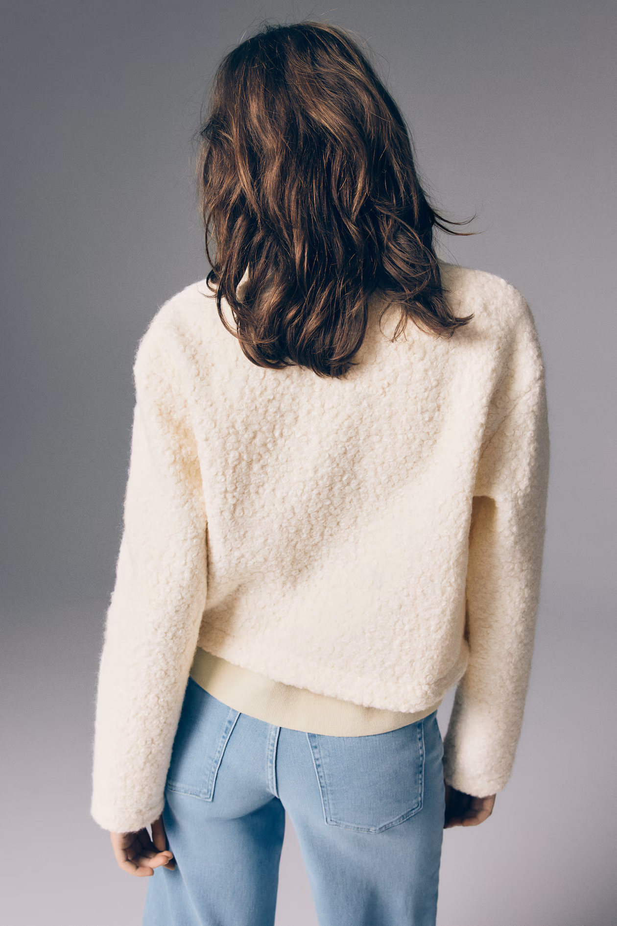 Short cardigan in soft teddy fleece. Ribbed collar, buttons at front, and long sleeves.
