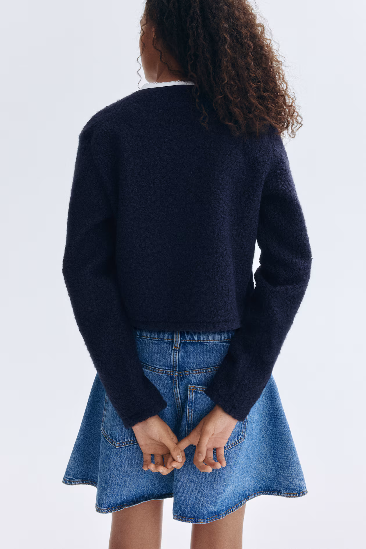 Short cardigan in soft teddy fleece. Binding in woven fabric with a soft, napped finish at neckline and front. Round neckline, buttons at front, and long sleeves.