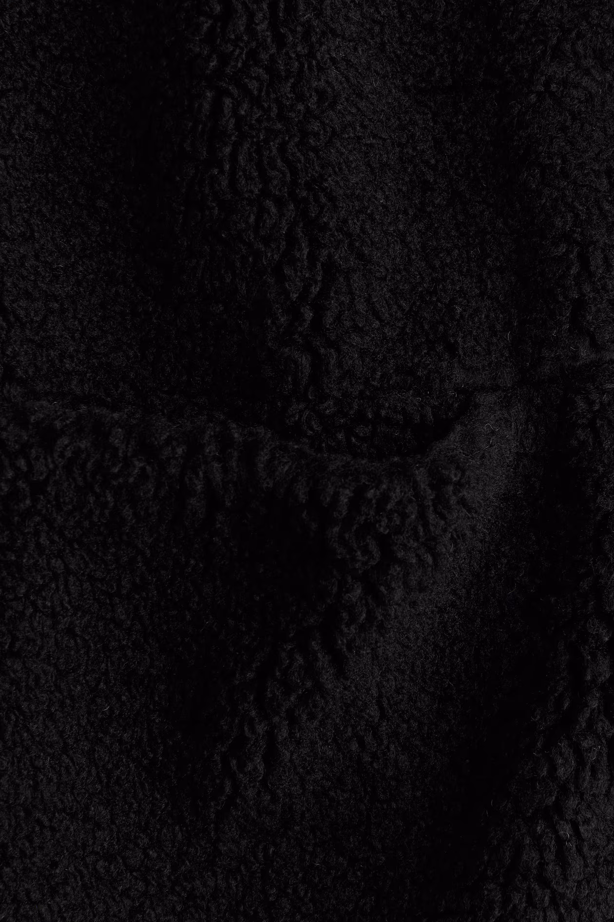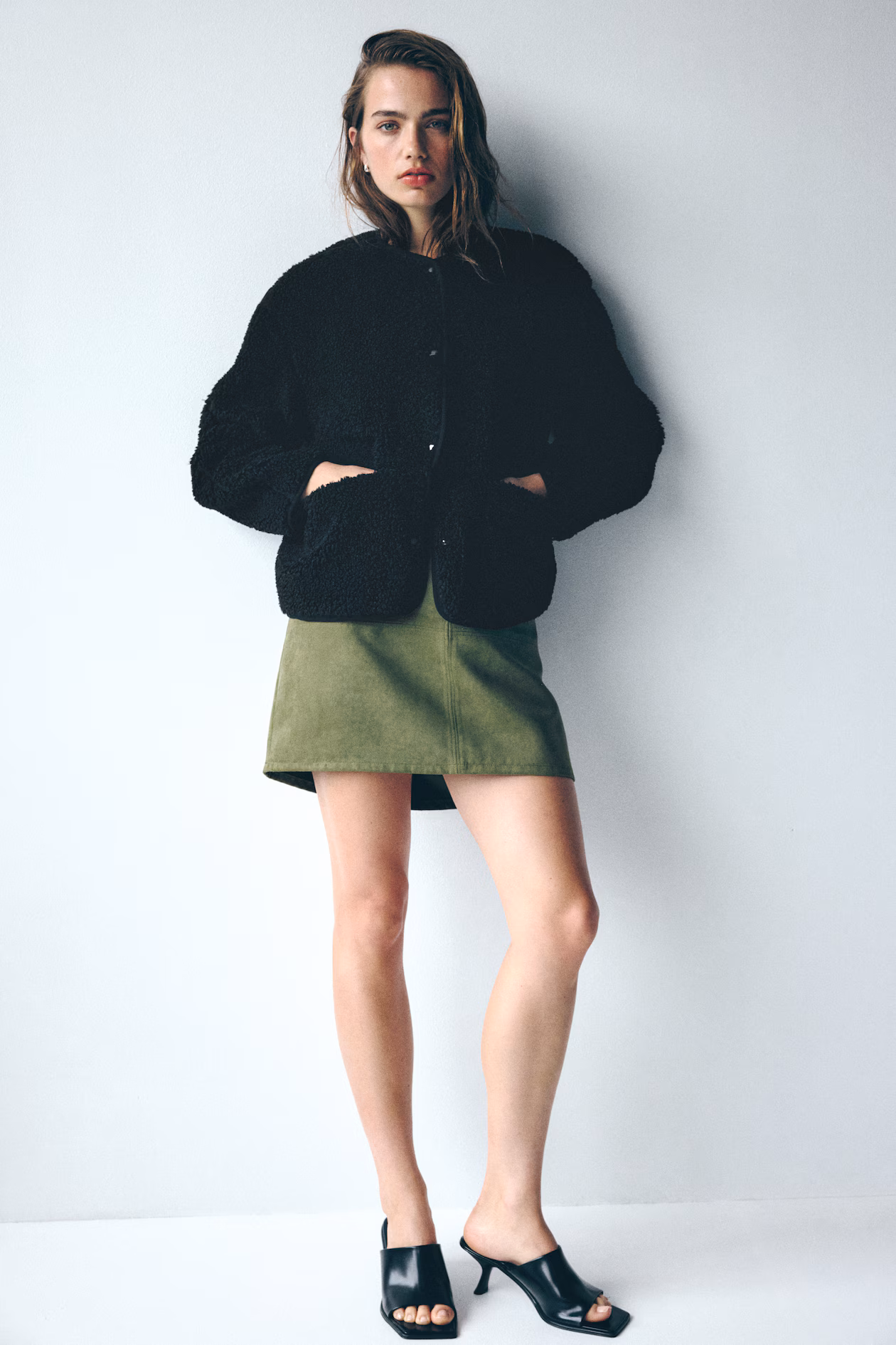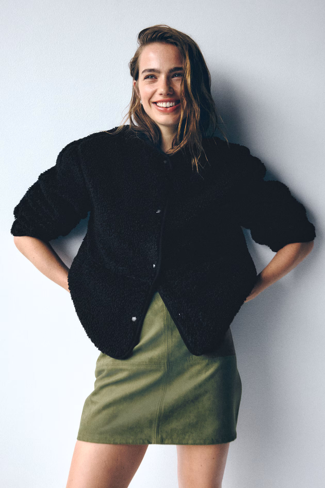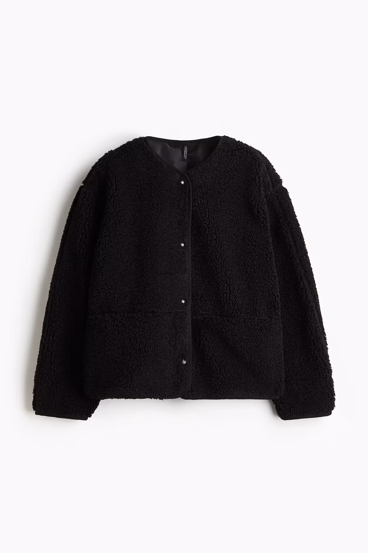 Jacket in soft teddy with jersey binding. Snap fasteners at front, dropped shoulders, and discreet front pockets with concealed snap fastener. Lined.
