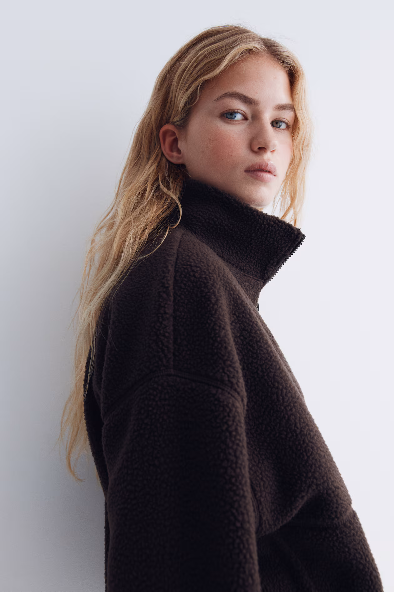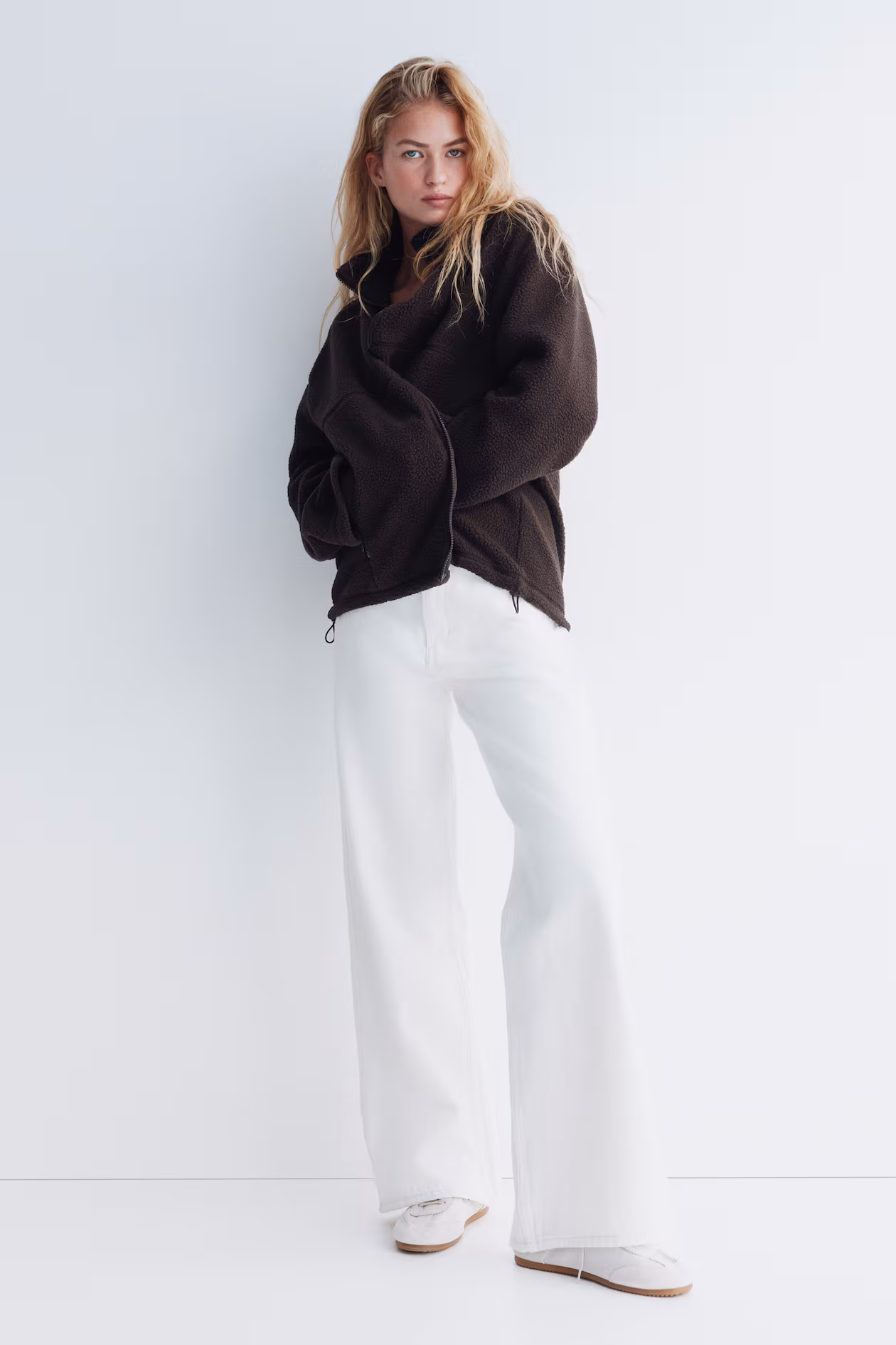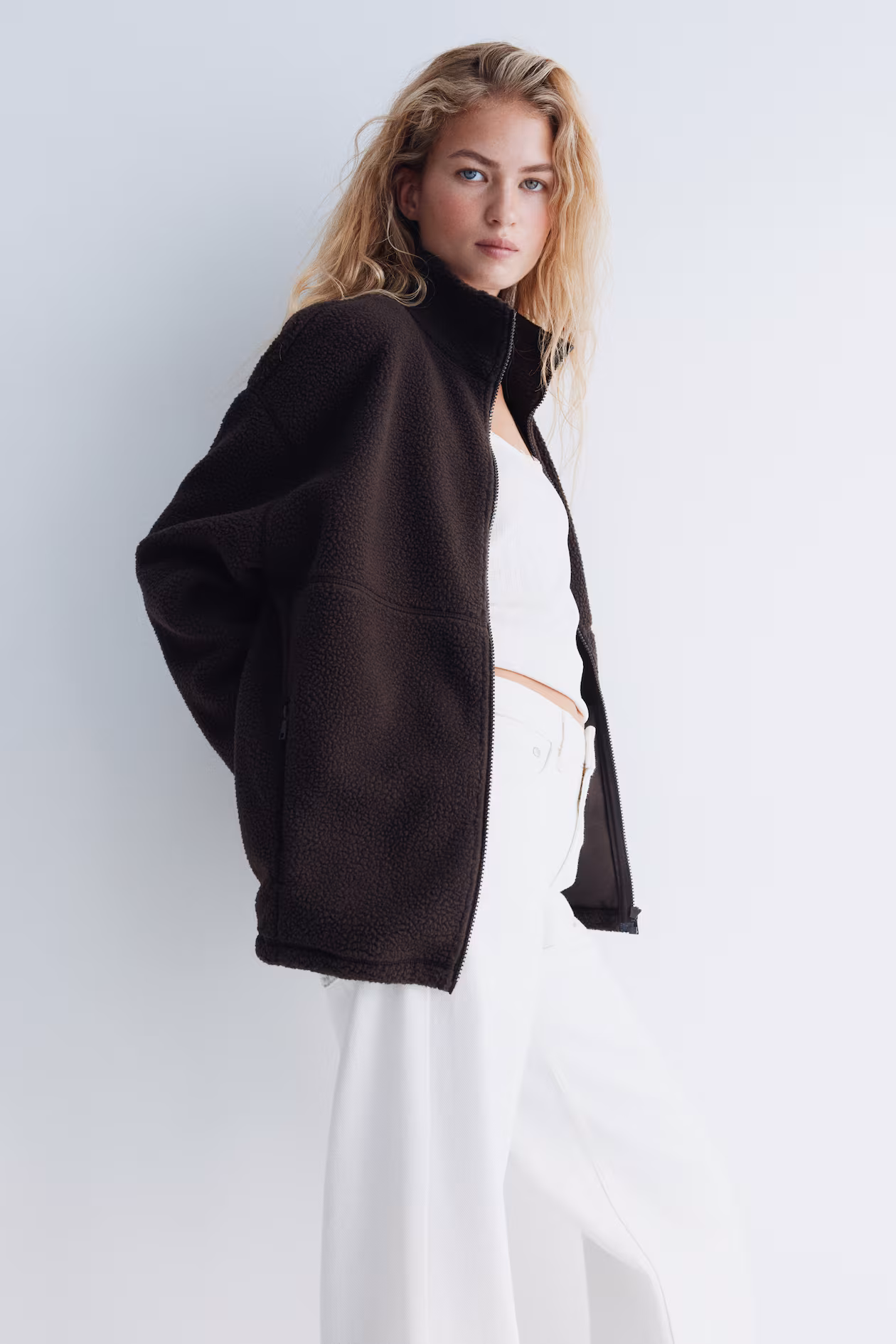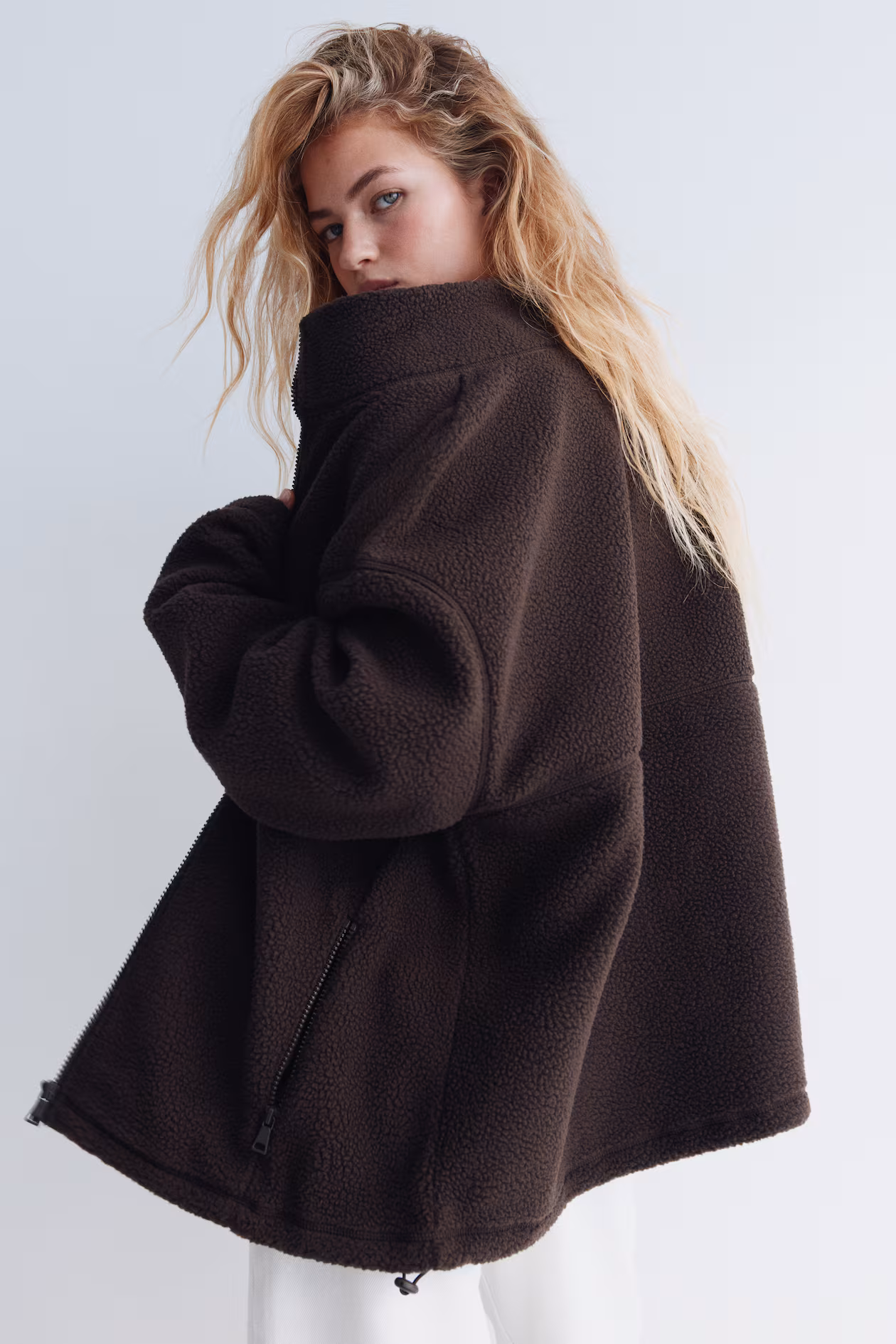 Oversized jacket in soft teddy fleece. Stand-up collar, zipper at front, and side pockets with zipper. Dropped shoulders and long sleeves. Drawstring at hem for adjustable fit. Unlined.